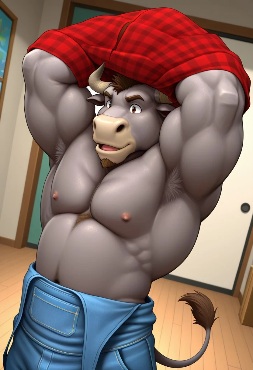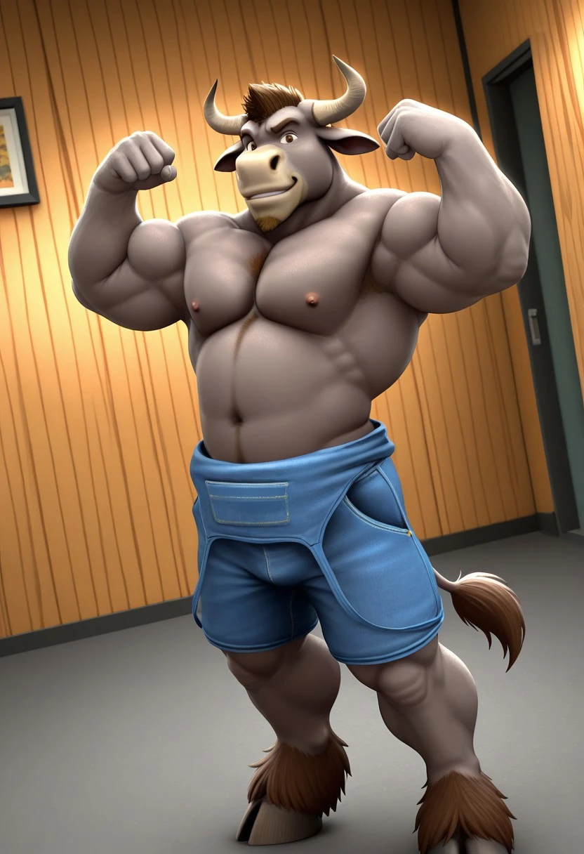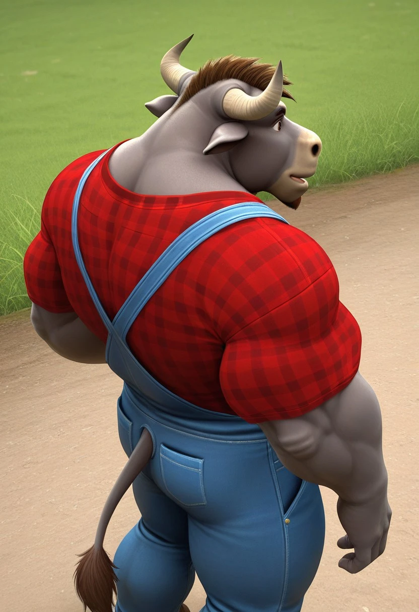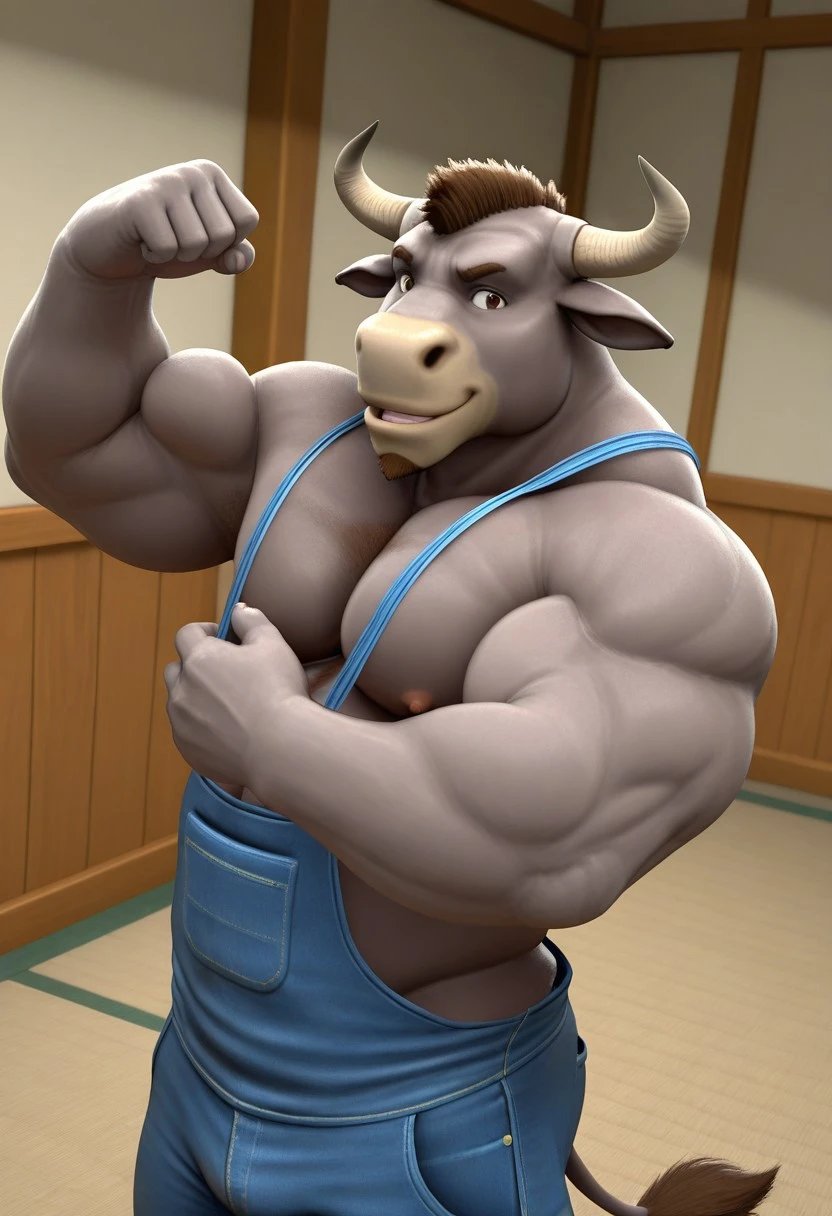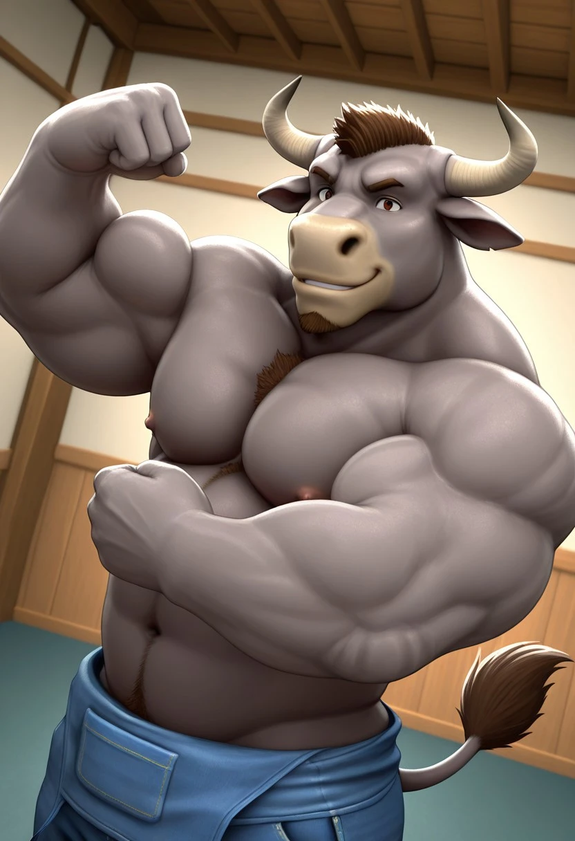 • Reinforcement Prompts: "furry, bull, tail, grey fur, brown eyes, muscular, manly, mature male, bara, large pectorals"