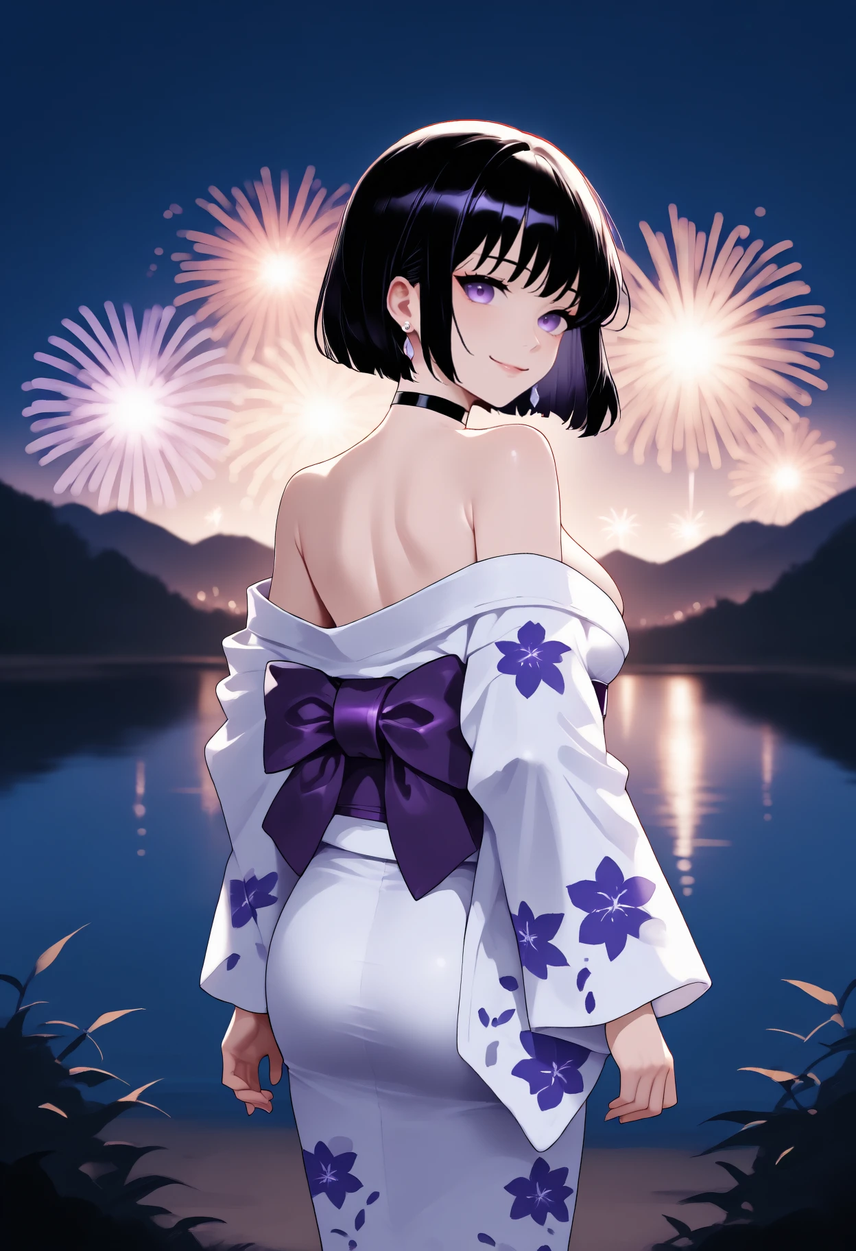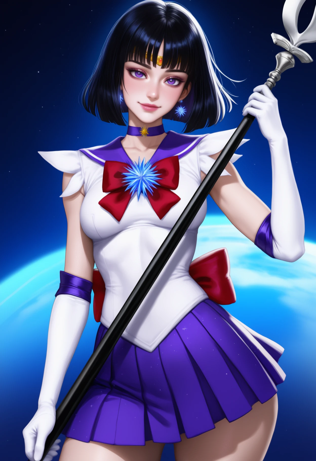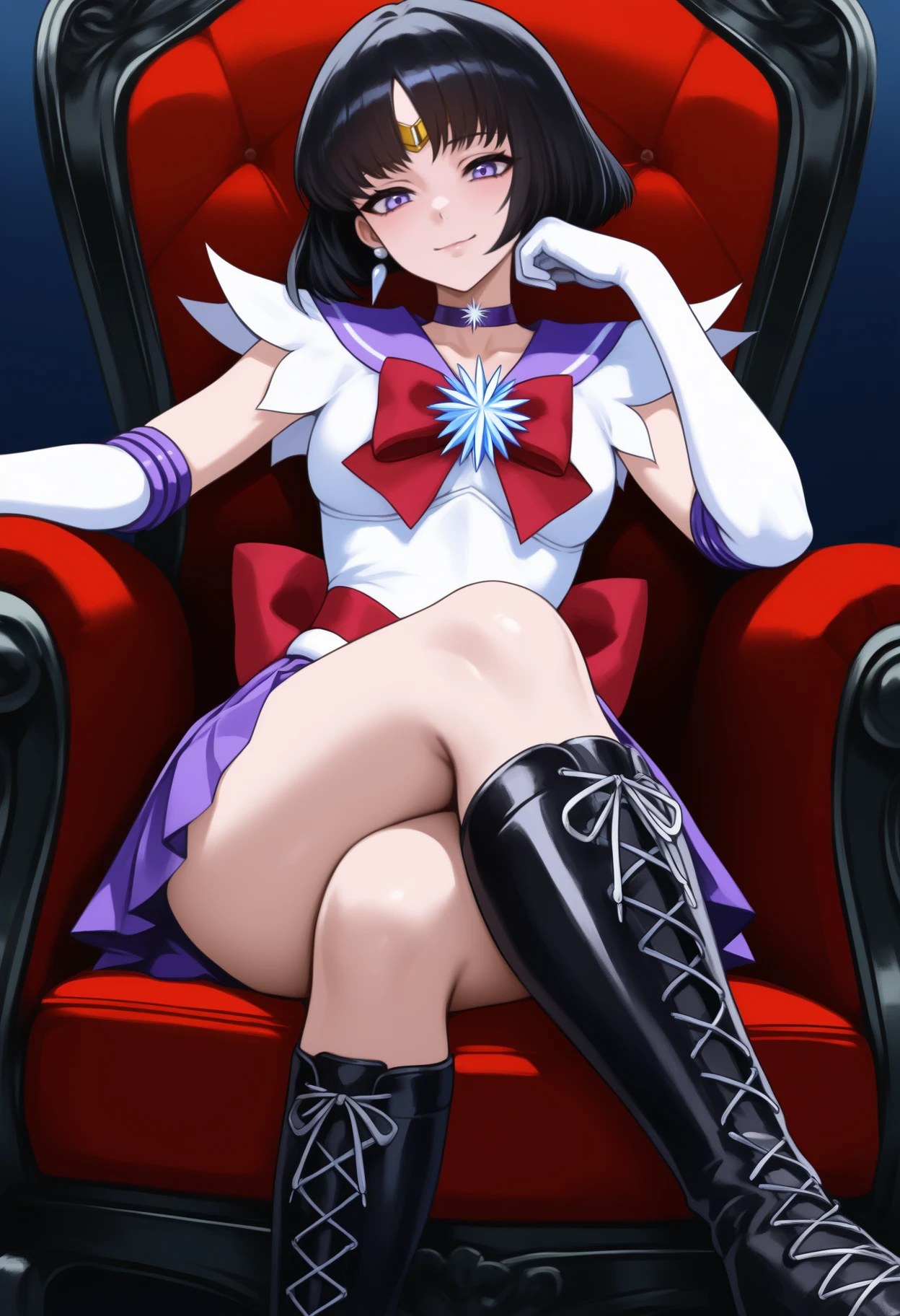 Sailor Senshi Uniform: circlet, earrings, star choker, white shirt, sleeveless shirt, purple sailor collar, red bowtie, star brooch, back bow, white gloves, elbow gloves, purple skirt, pleated skirt, , knee boots, lace-up boots