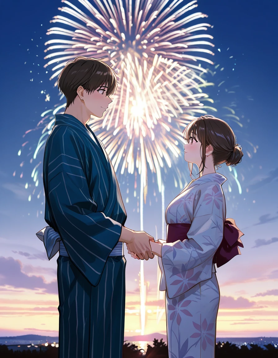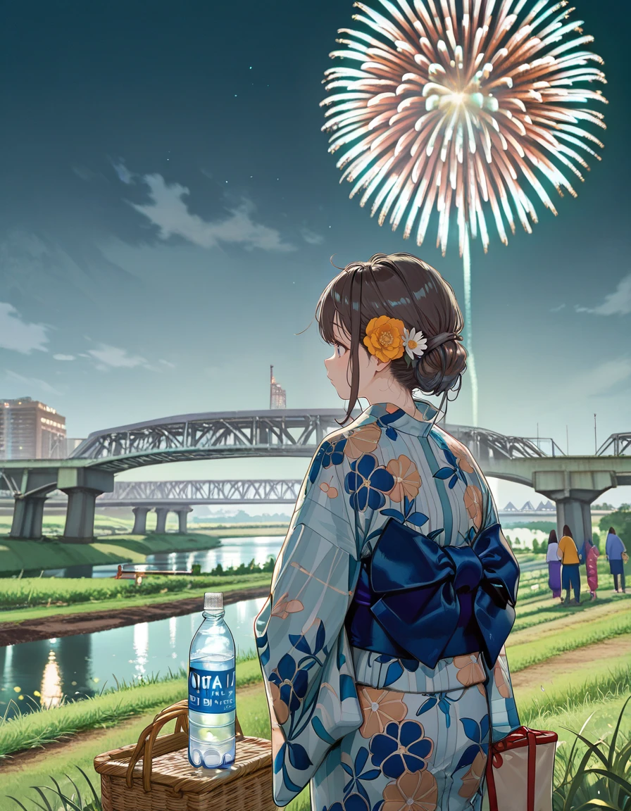 fireworks, scenery, night, sky, cityscape, city lights, city, outdoors, night sky, cloud, building, japanese clothes, yukata, sandals, obi, sash, flower, hair ornament, hair flower, paper fan, hand fan, uchiwa, floral print, signature, paper lantern, river, river bank, overpass, people, mask, multiple girls, multiple boys, food, lantern, candy apple, fox mask, mask on head, crowd, festival, food stand, food stall, reflection, water, bridge, tokyo sky tree, etc...