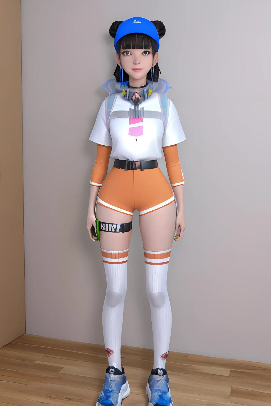 earring, orange shorts, white thighhighs, short sleeves, belt, double bun, baseball cap, white shirt, short over long sleeves, see-through backpack, headphones around neck, thigh strap, bracelet