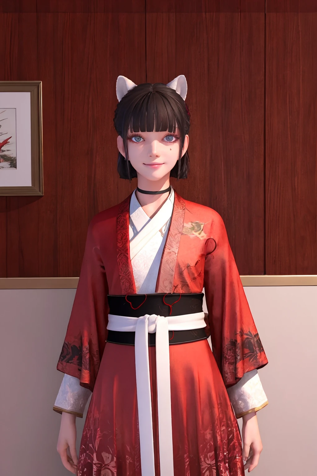 animal ears, red hanfu, printed skirt, hair ribbon, red shoes, floral print, white sash, short hair