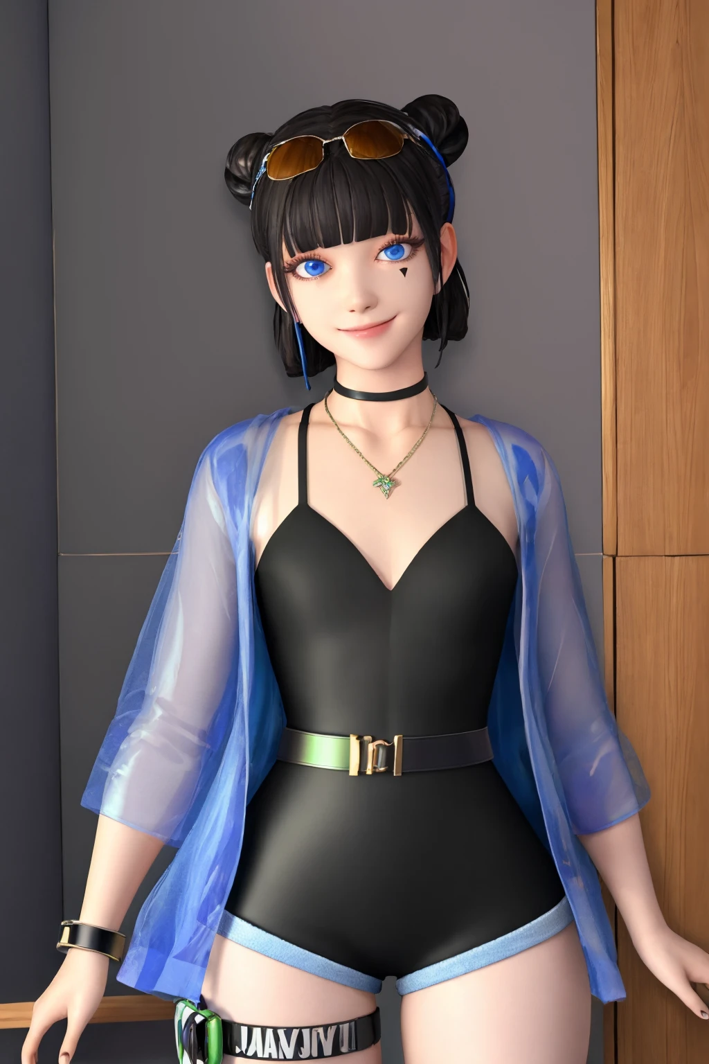 double bun, leotard, open clothes, necklace, see-through jacket, choker, bracelet, thigh strap, colorful belt, 全身照加入 high heels
