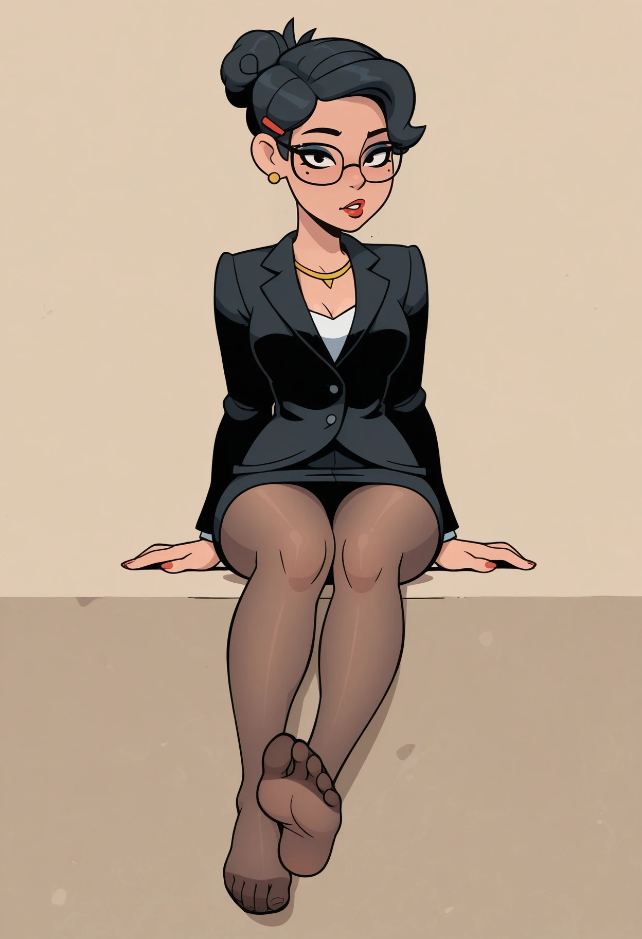 formal, suit, skirt suit, glasses, jewelry, earrings, necklace, jacket, black jacket, shirt, white shirt, skirt, black skirt, pencil skirt, underwear, panties, black panties,