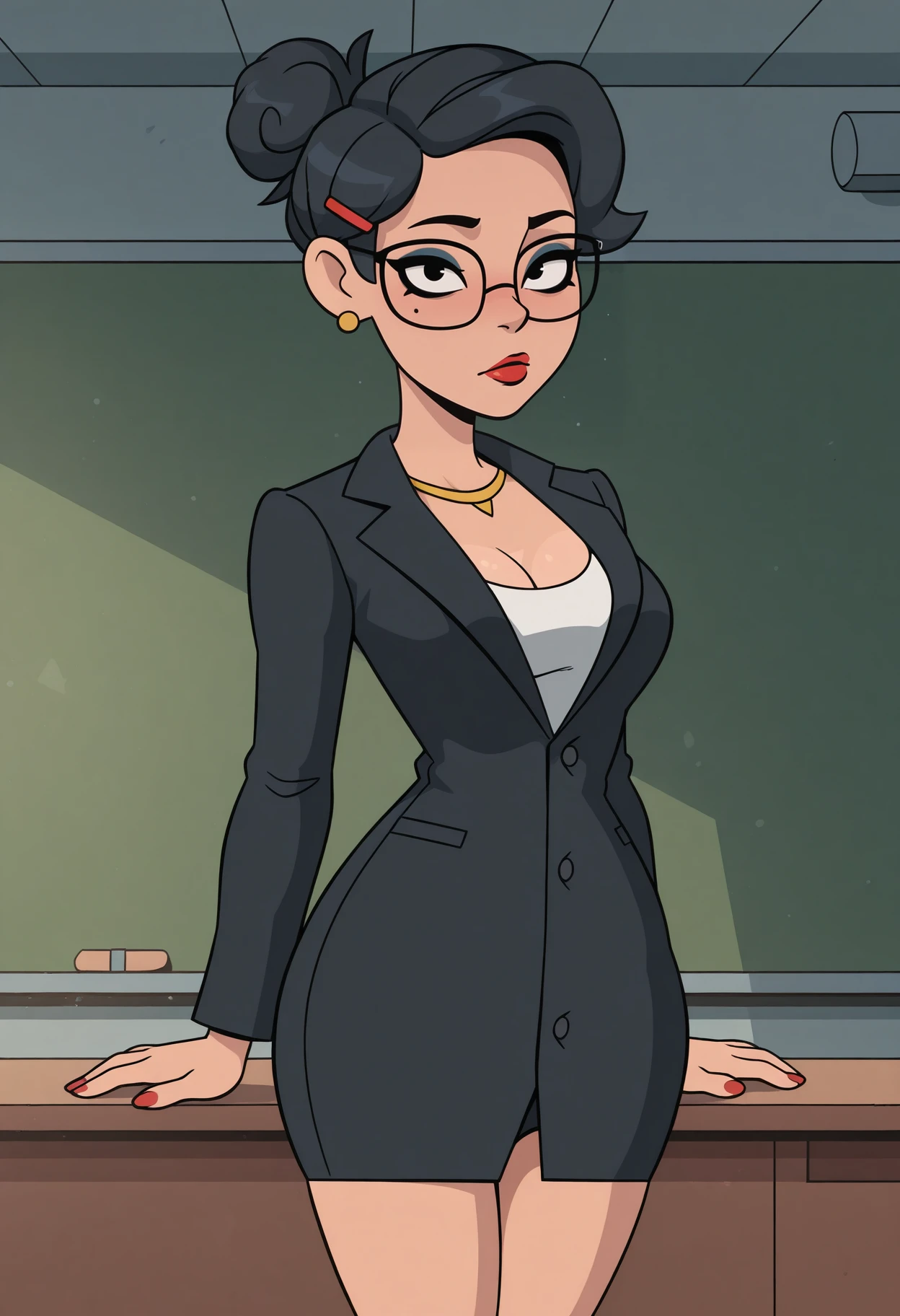 1girl, solo, black eyes, black hair, hair bun, single hair bun, hair ornament, hairclip, mole, mole under eye, breasts, makeup, lipstick,