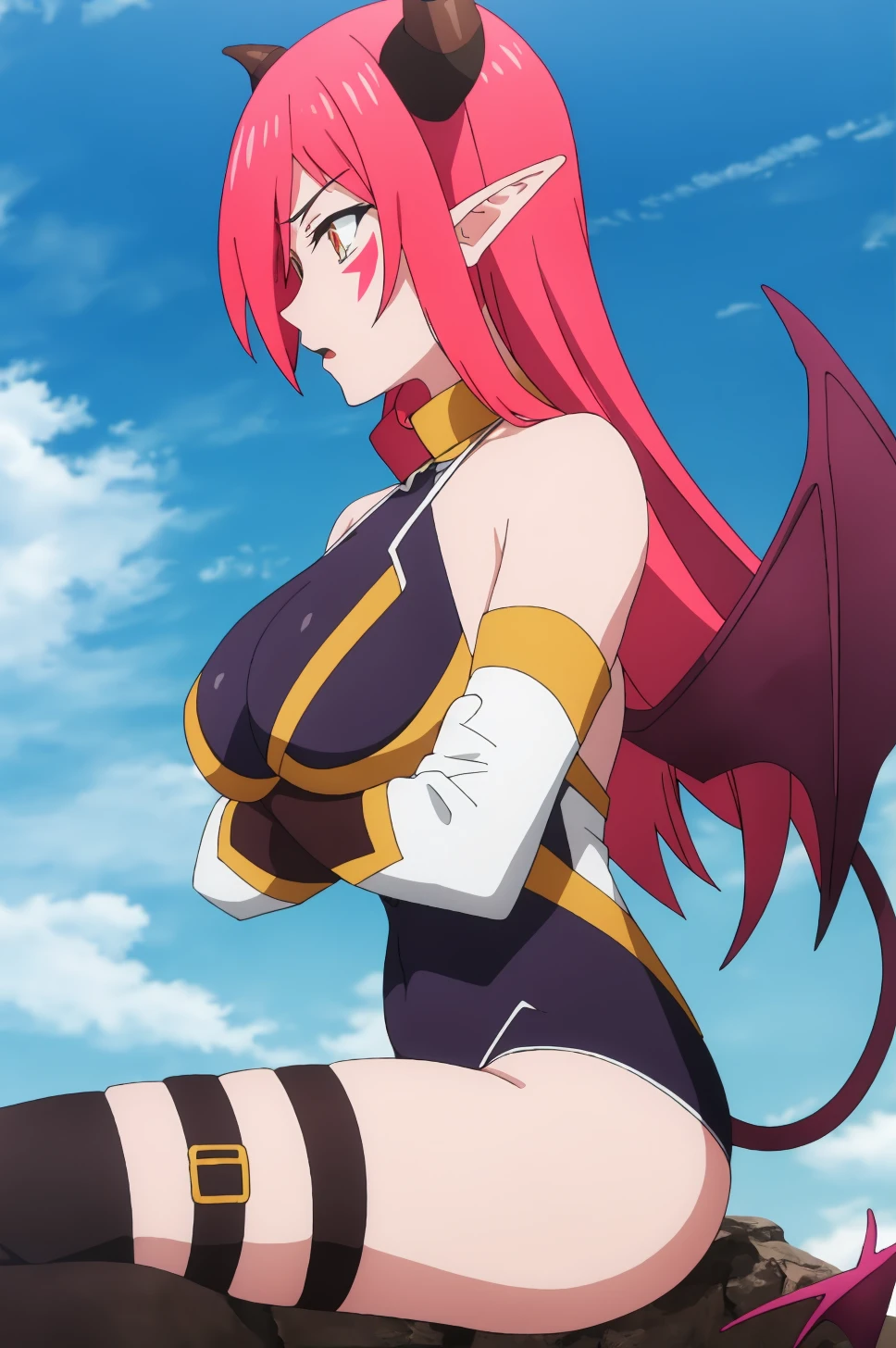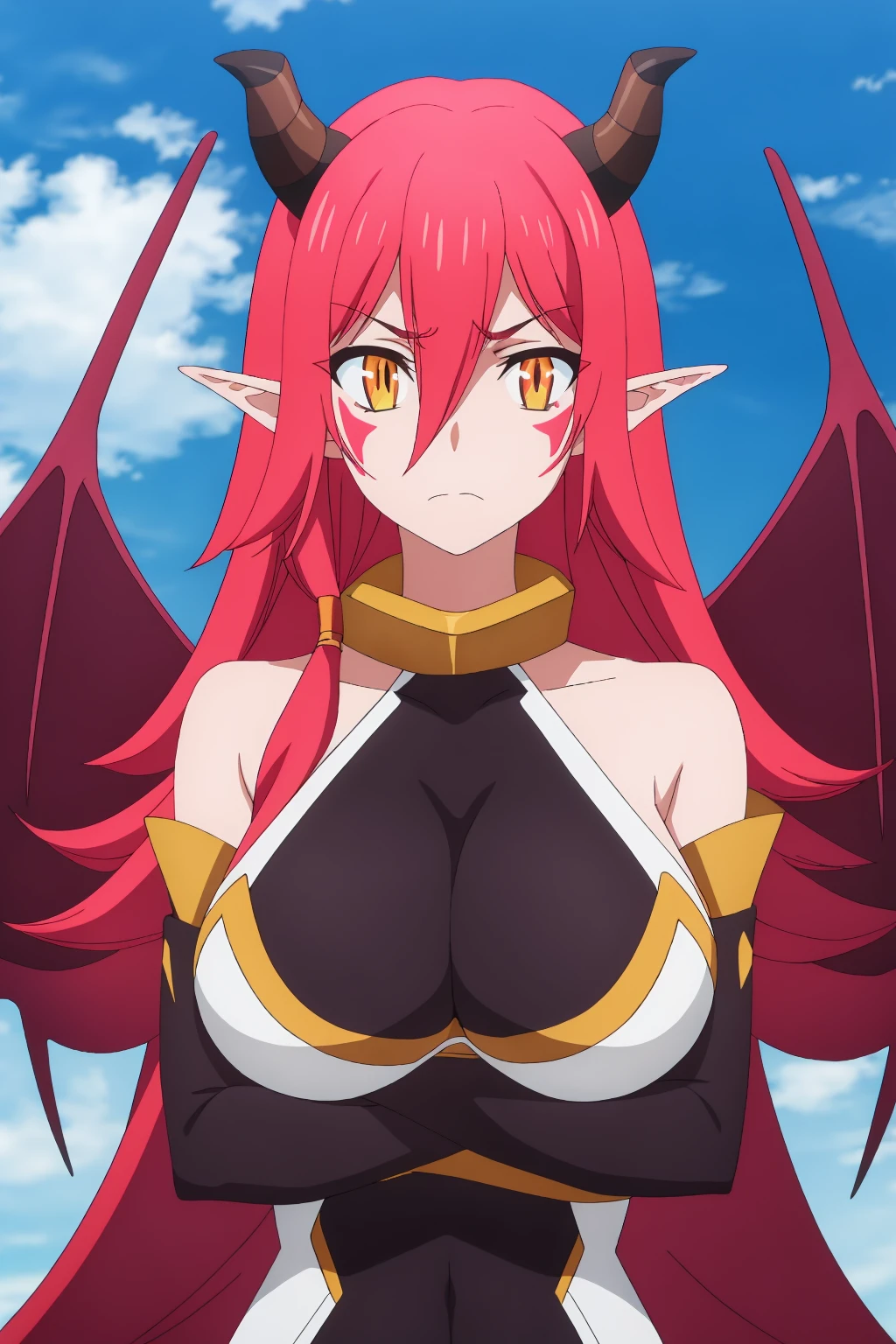 Arnes, breasts, pointy ears, red eyes, red hair, long hair, large breasts, hair between eyes, facial mark, monster girl, hair tubes, demon girl, dragon horns, bangs, slit pupils, sidelocks, fang, facial tattoo, demon horns,