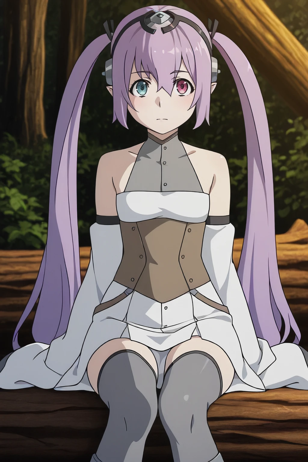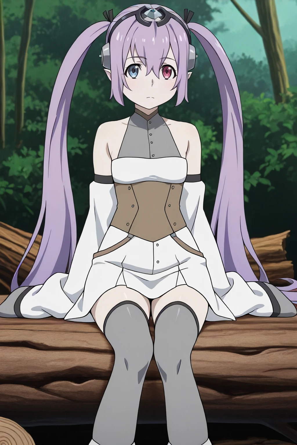 corset, detached sleeves, grey-white short sleeveless dress, skirt, sleeveless, sleeves past fingers, sleeves past wrists, thighhighs, twintails, very long hair