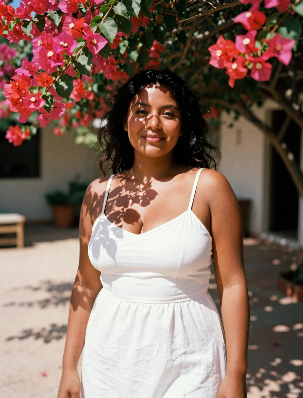 Key word for better generations: Hispanic descent, medium-brown skin tone and dark brown eyes, average build with visible natural body curves, curvy, body is full-figured with noticeable curves, including a prominent belly, thick thighs, and a rounded buttock