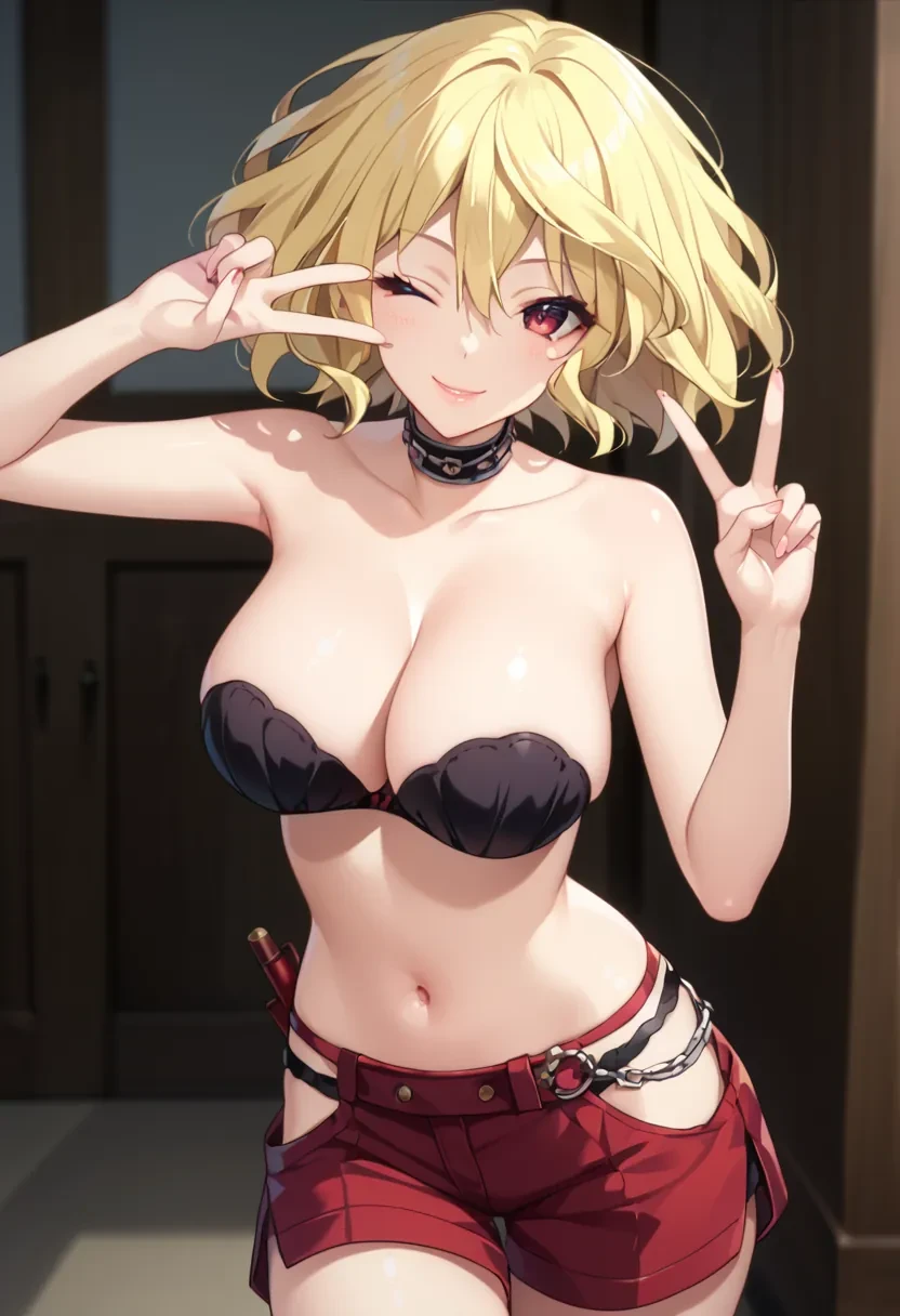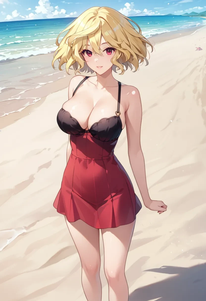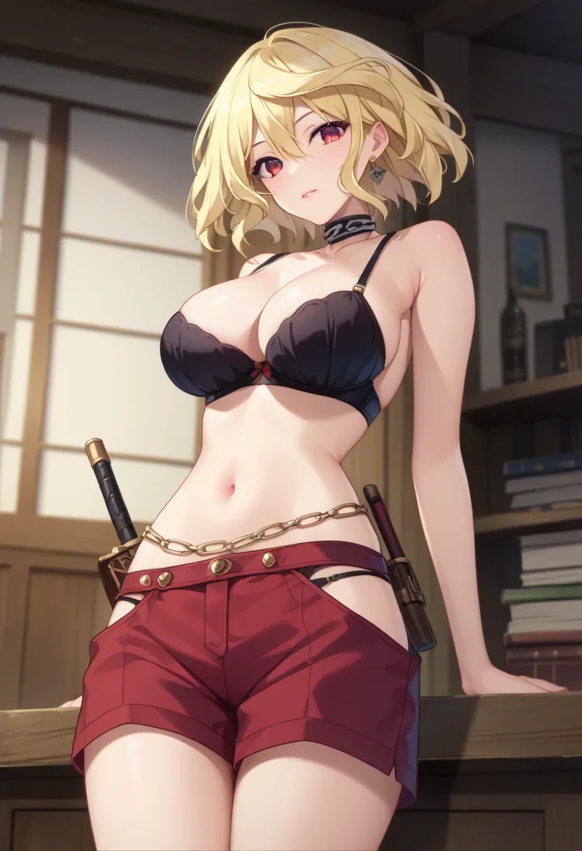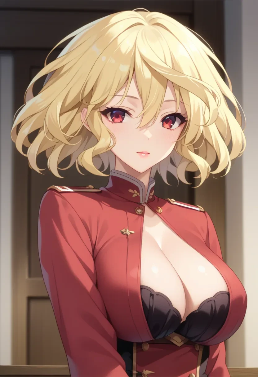 Mitsuki, blonde hair,short hair, red eyes, large breasts,Outfit:
