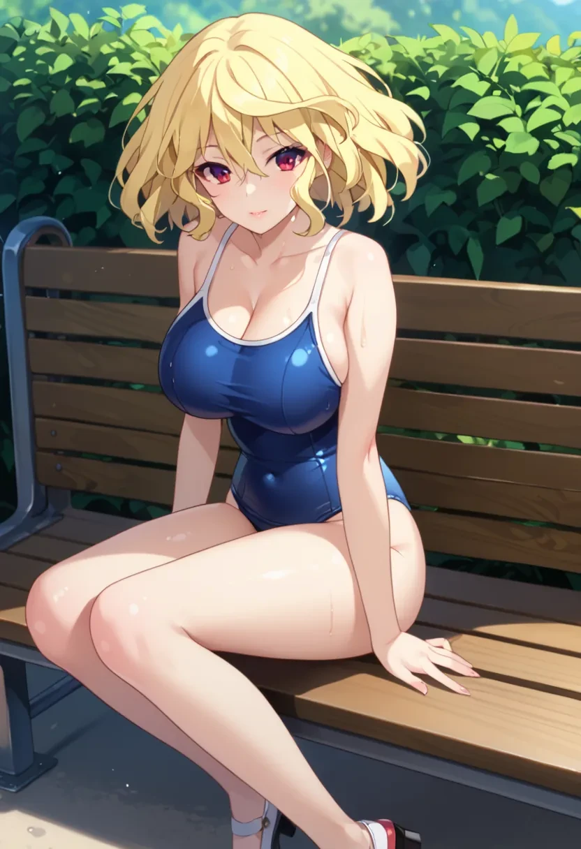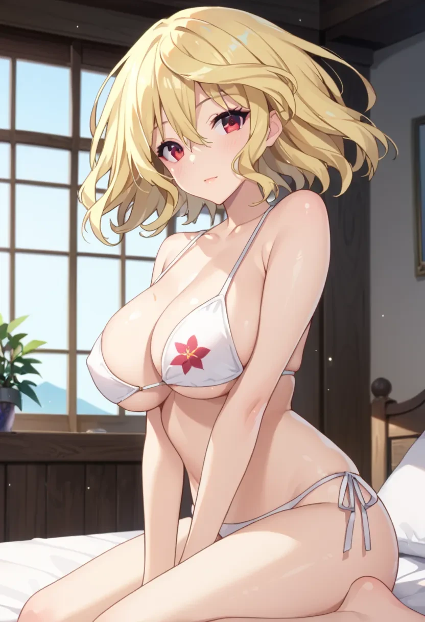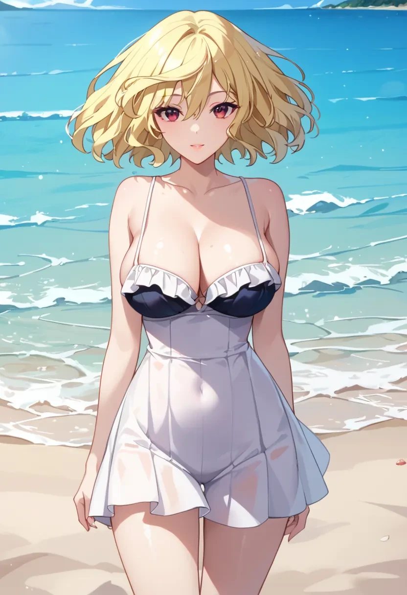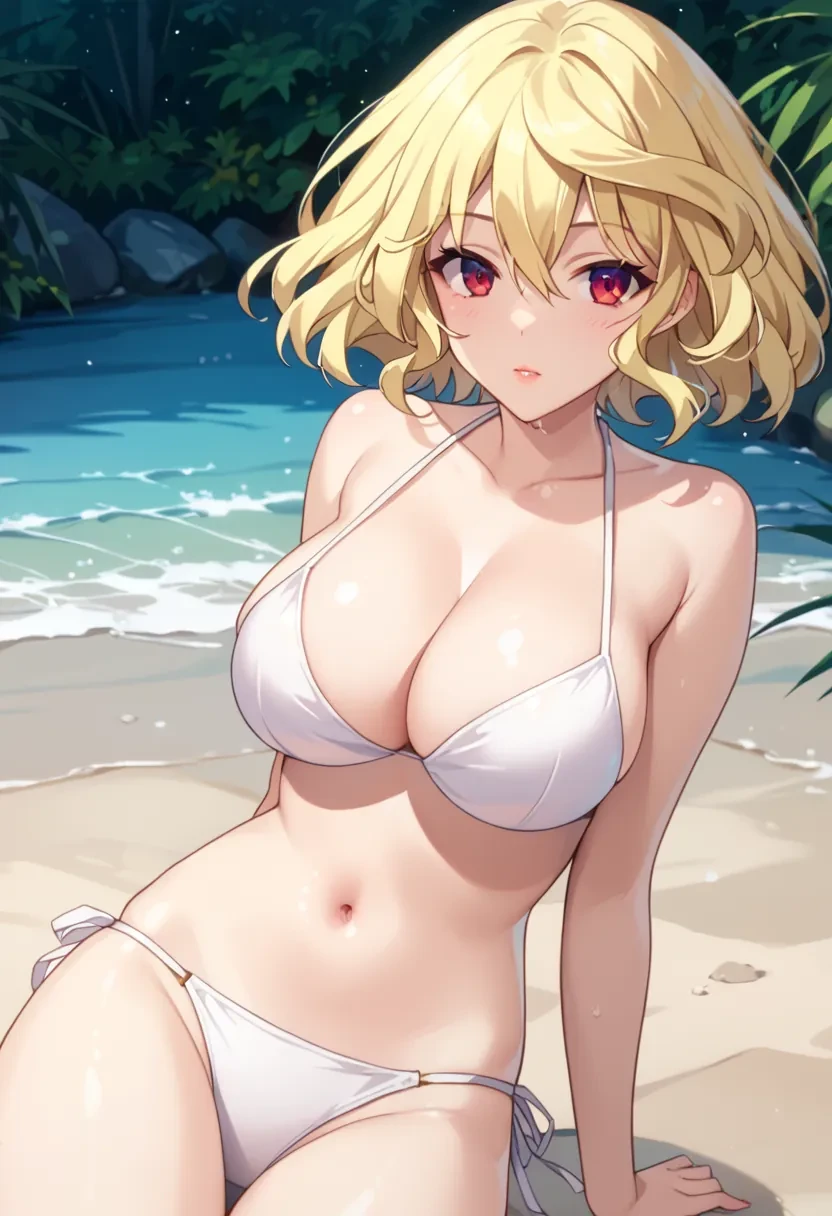 Mitsuki, blonde hair,short hair, red eyes, large breasts,Outfit:
