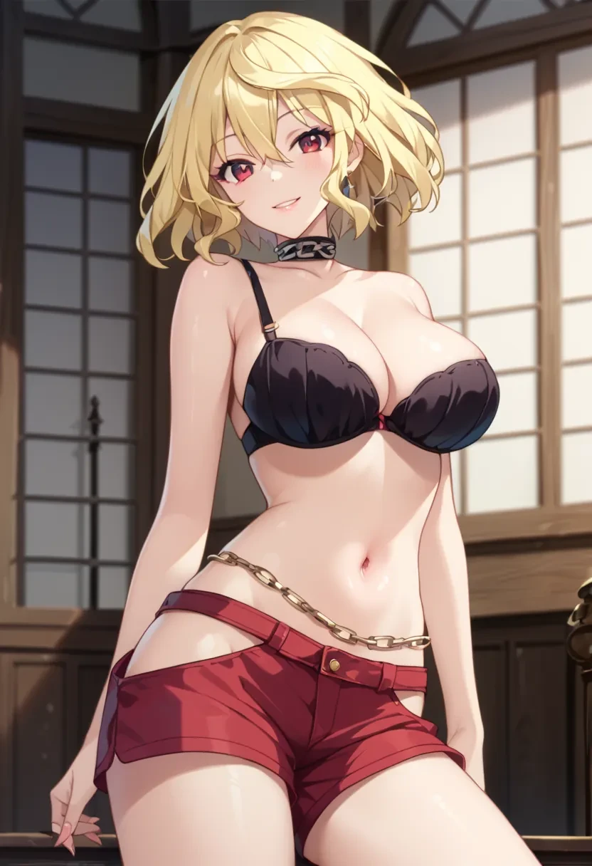black bra, shorts, red shorts, hip vent, choker, chain,