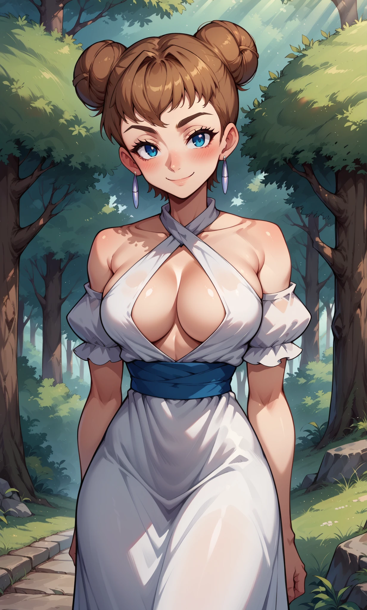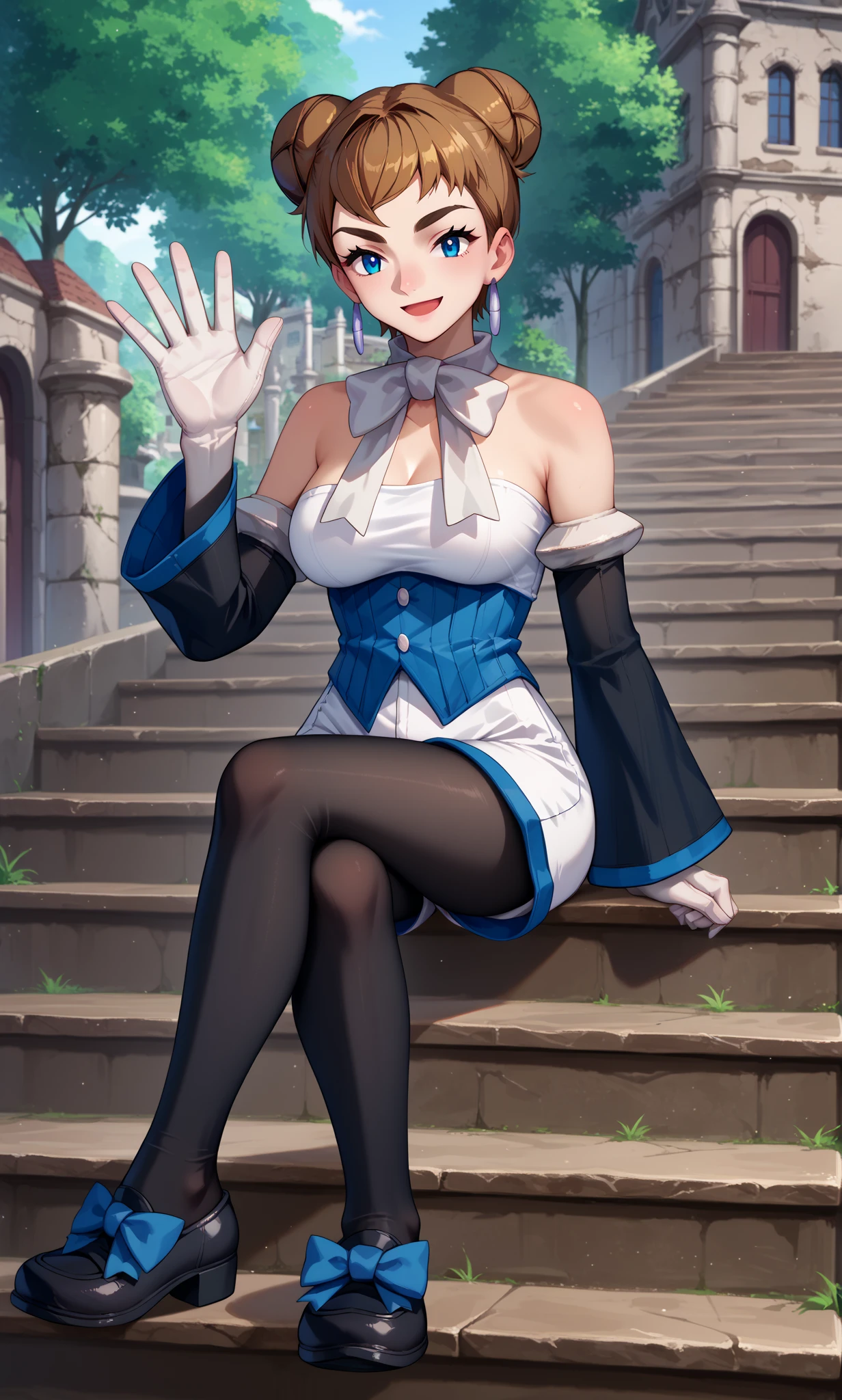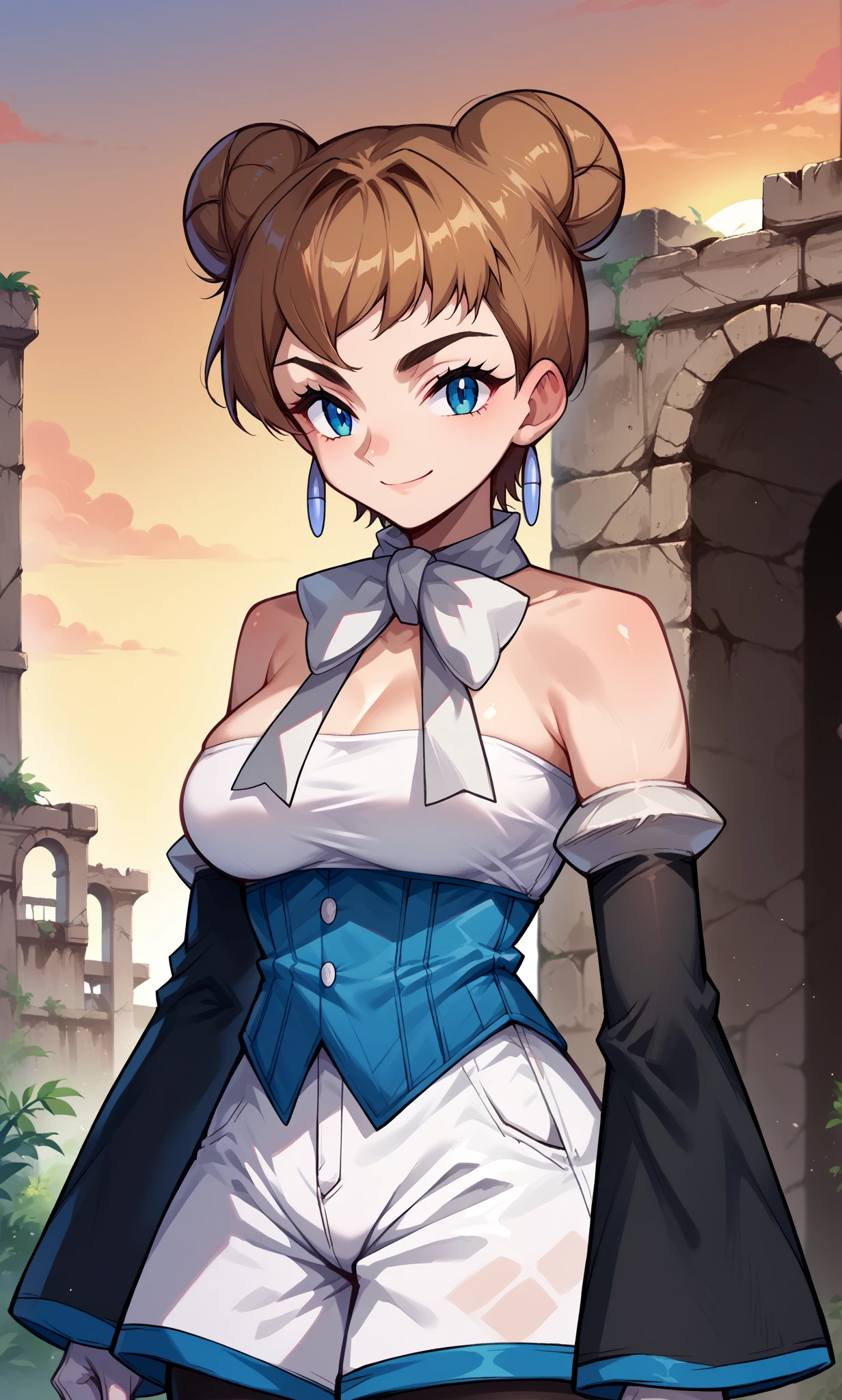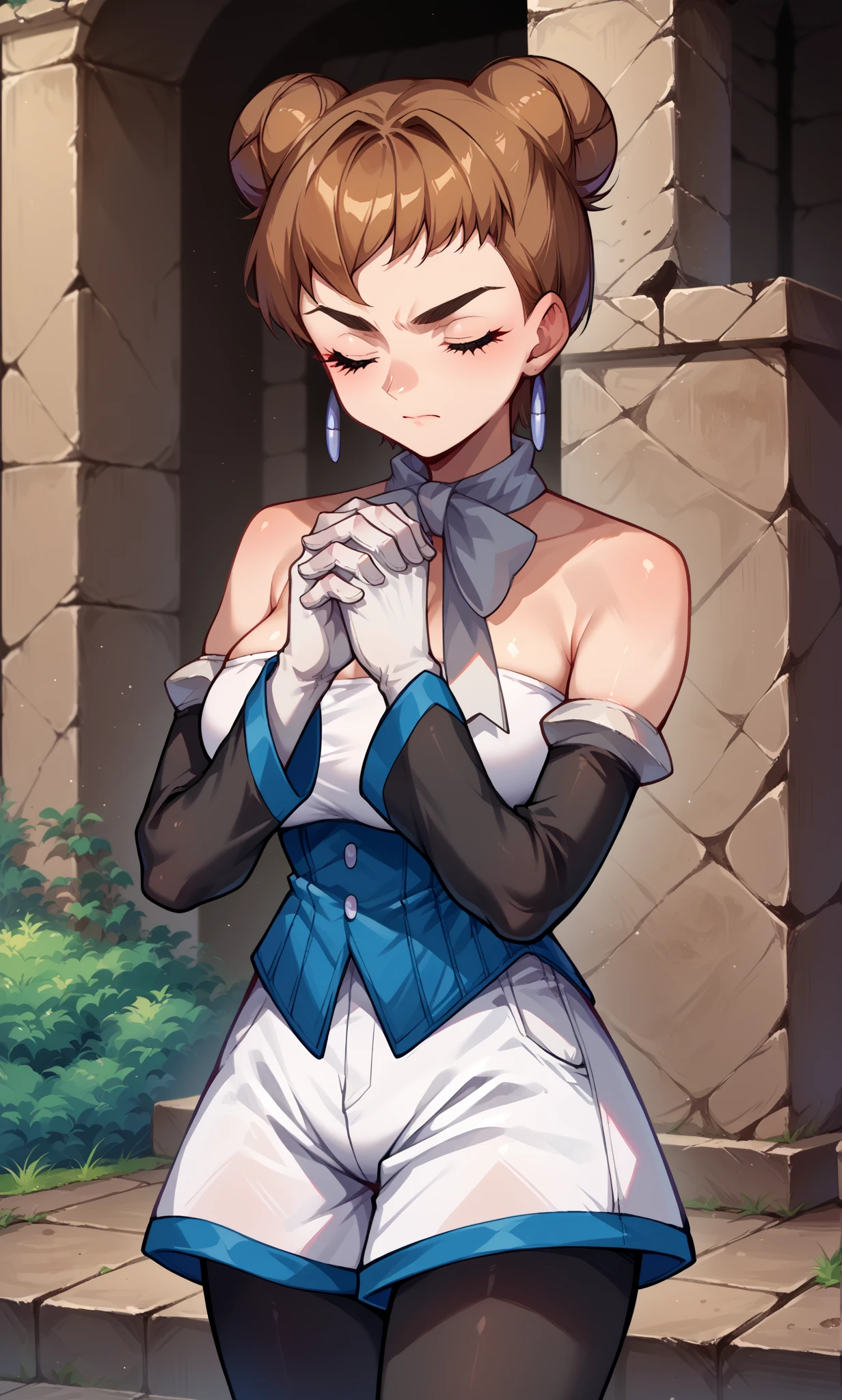 [Default Outfit]: brown hair, short hair, triple bun, blue eyes, dangle earrings, white bowtie, white shirt, strapless shirt, white shorts, underbust, white gloves, elbow gloves, detached sleeves, black pantyhose, loafers, black footwear