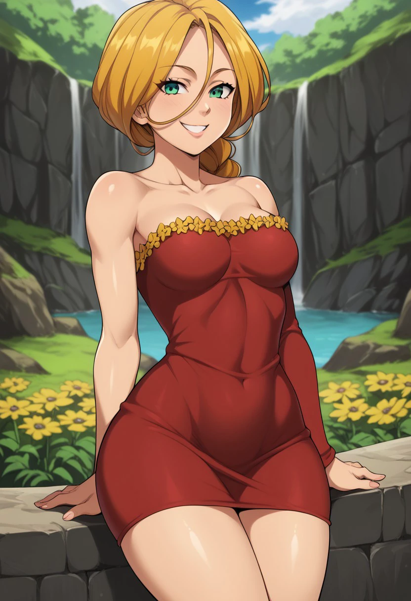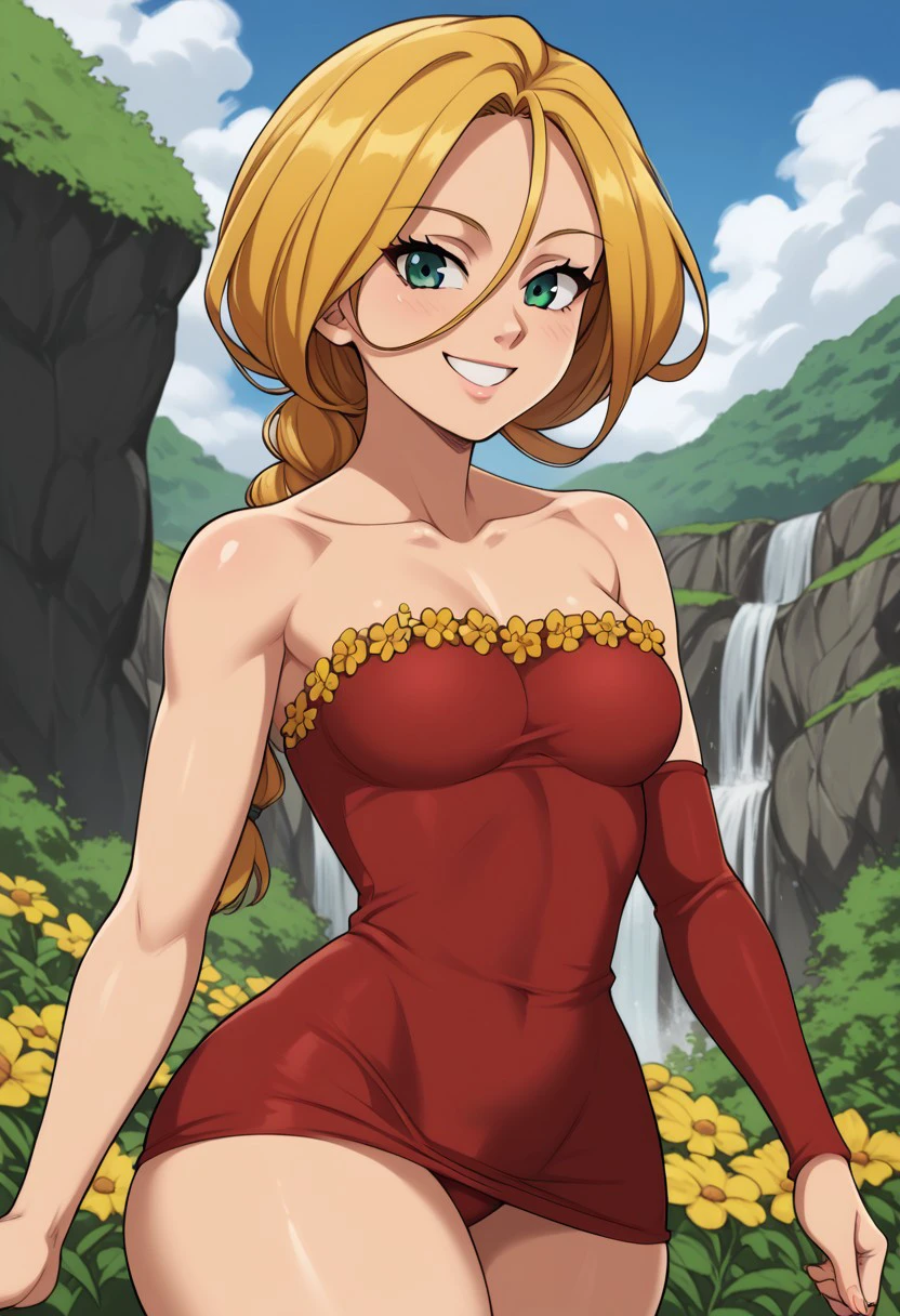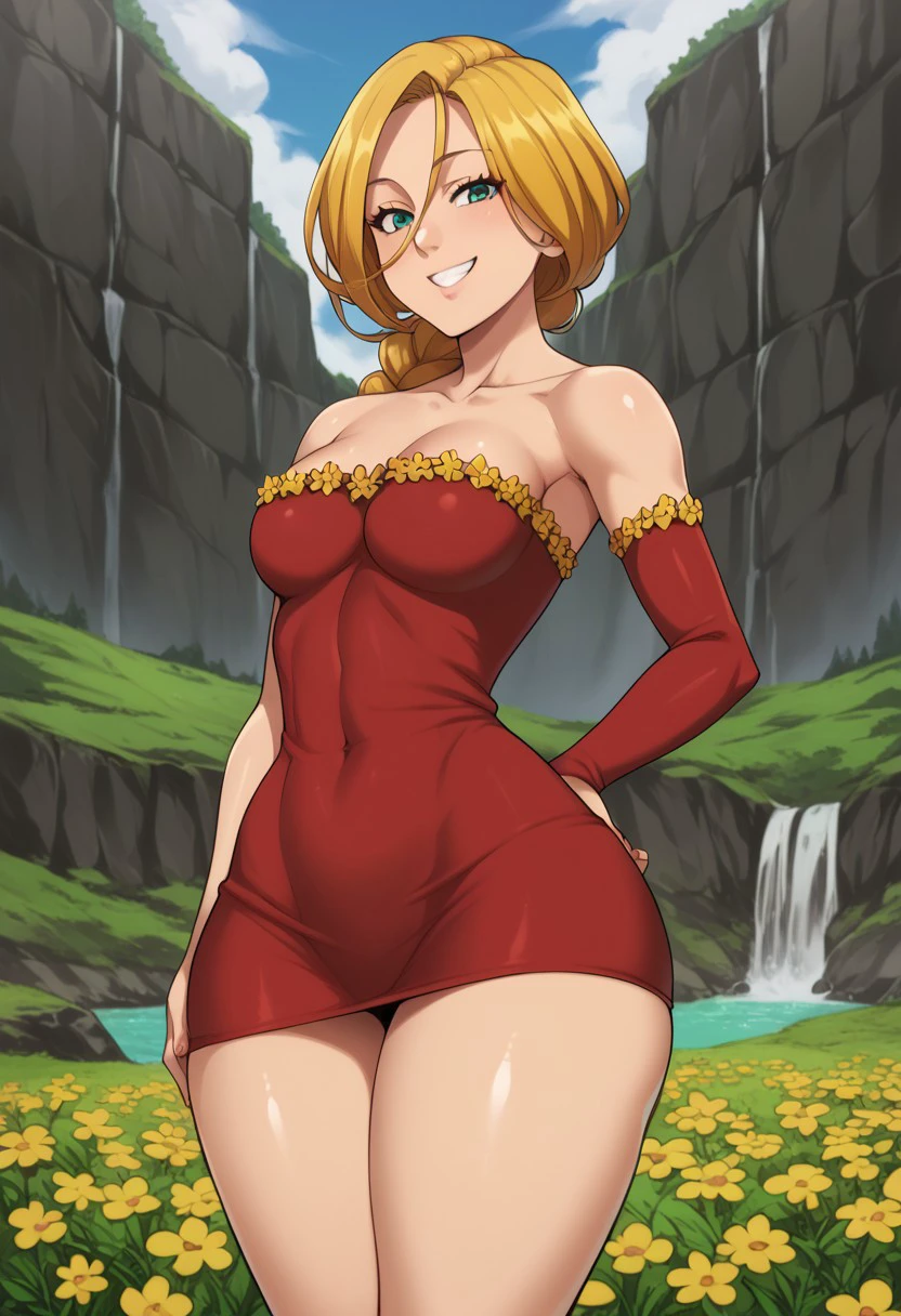 Jenna, blond hair, green eyes, yellow flower frills, hair between eyes, collarbone, red dress, single braid, long hair, strapless dress, detached sleeve, single sleeve, short dress, black high heels