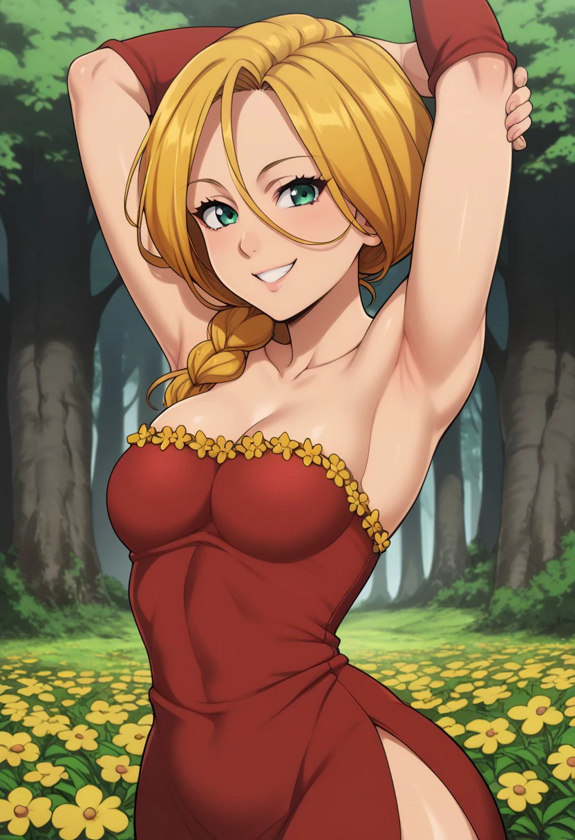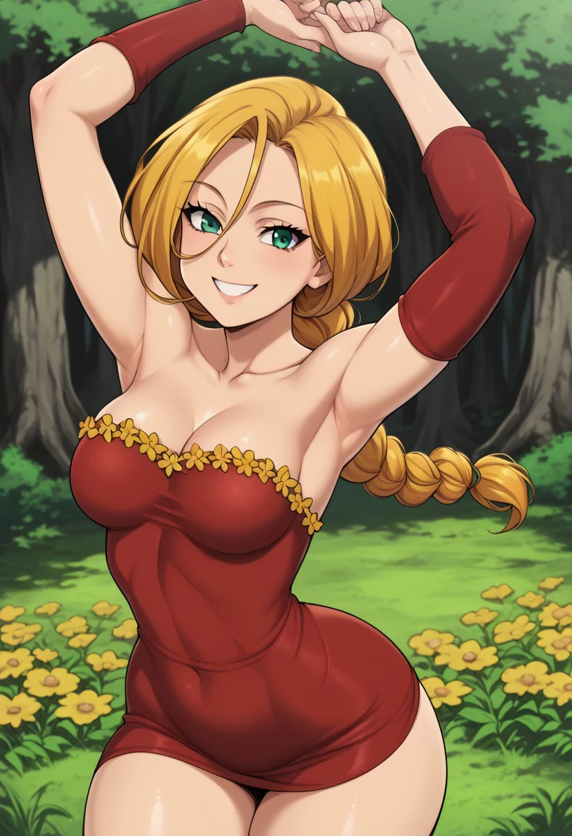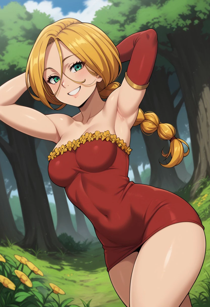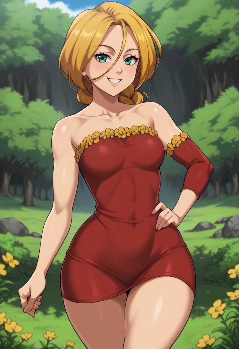 Jenna, blond hair, green eyes, yellow flower frills, hair between eyes, collarbone, red dress, single braid, long hair, strapless dress, detached sleeve, single sleeve, short dress, black high heels
