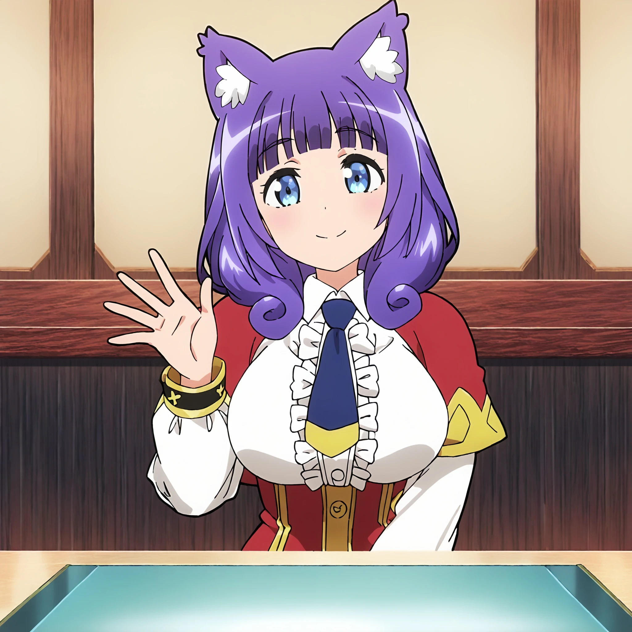 ^_^, closed mouth, blush, arm at side, hand up, wavinghitamu kyan's signature ^_^ smile: