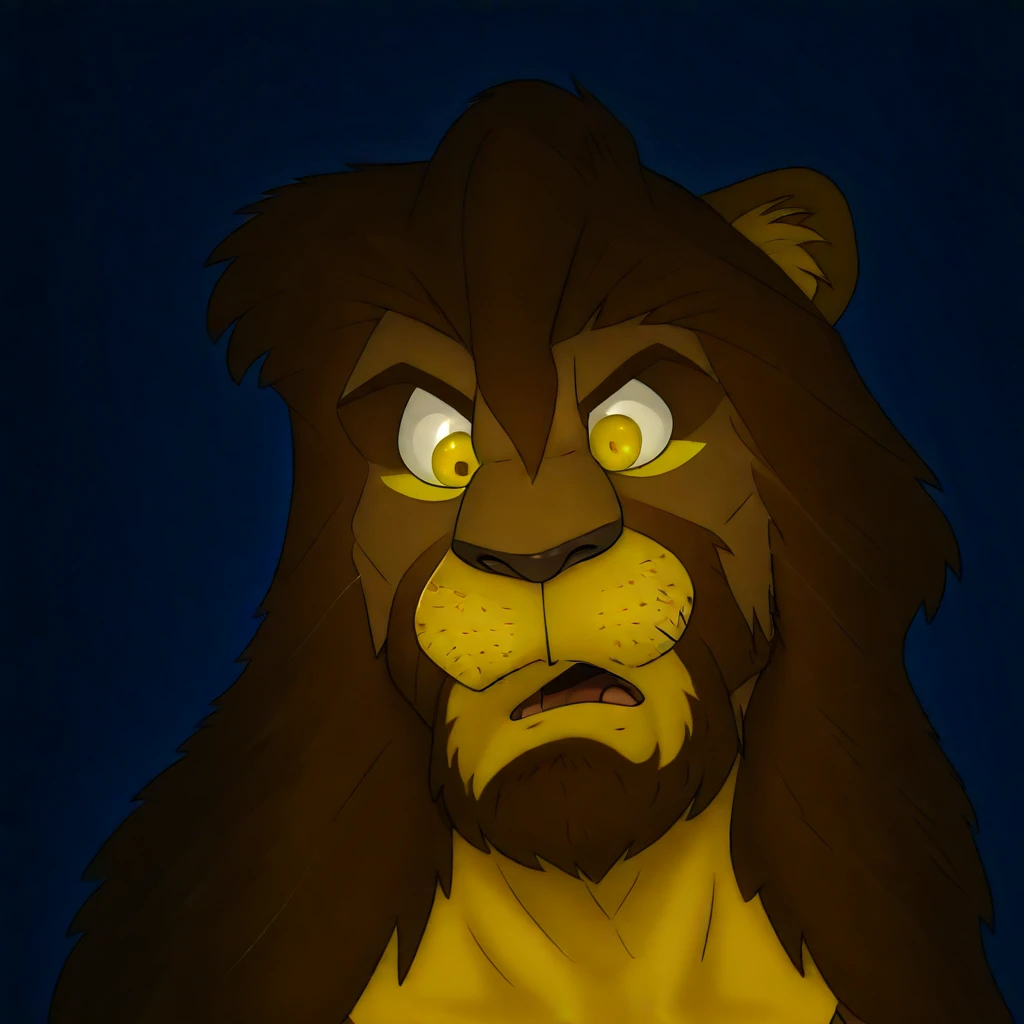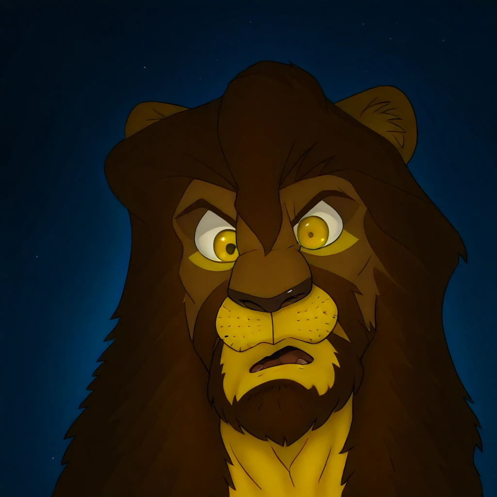 galen dhaelos , mitzakan , dilacted pupils, white sclerals, yellow iris ,solo ,1boy , head shot , brun mane, little brun beard , identical colors furs, open mouth dized , hd ,night background, lion anthro , identical art style , differents pupils sizes