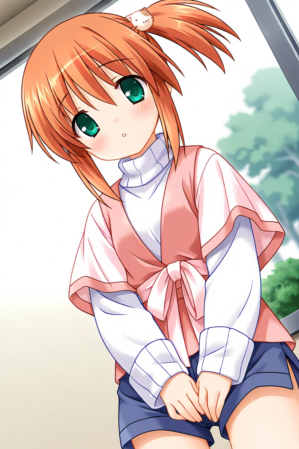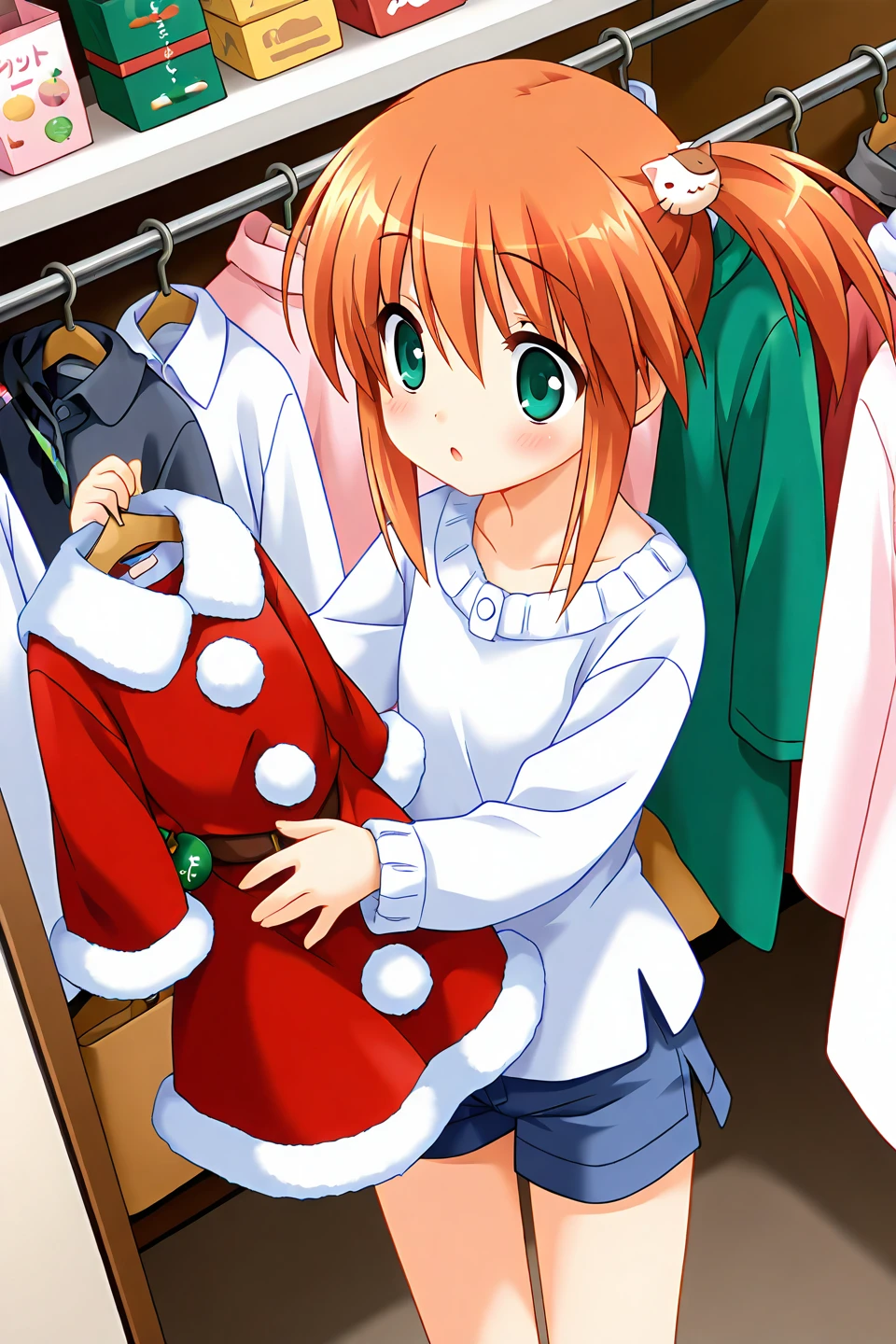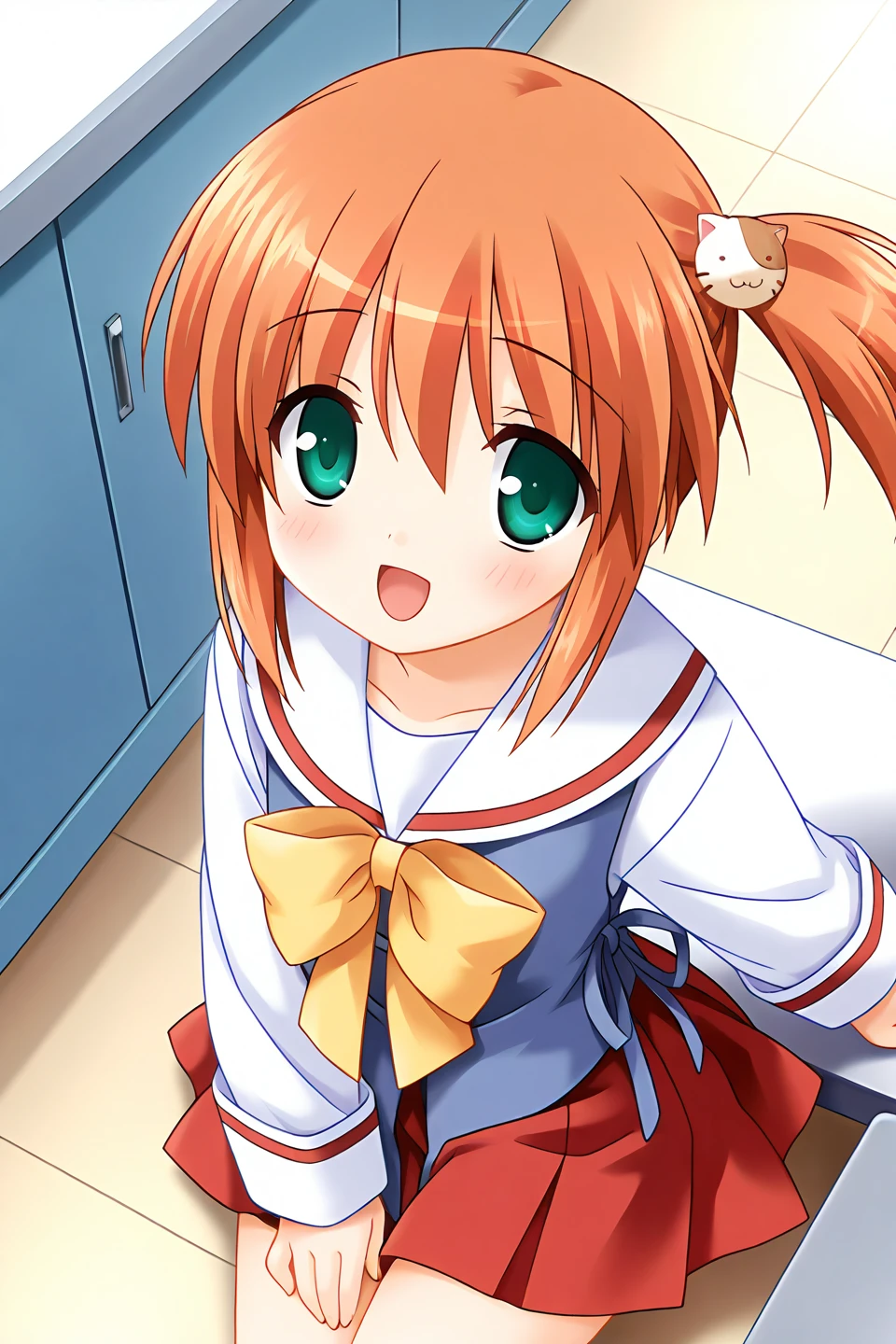 nekoyashiki miiko, 1girl, solo, green eyes, orange hair, short hair, side ponytail, sidelocks, bangs, hair ornament, cat hair ornament, flat chest