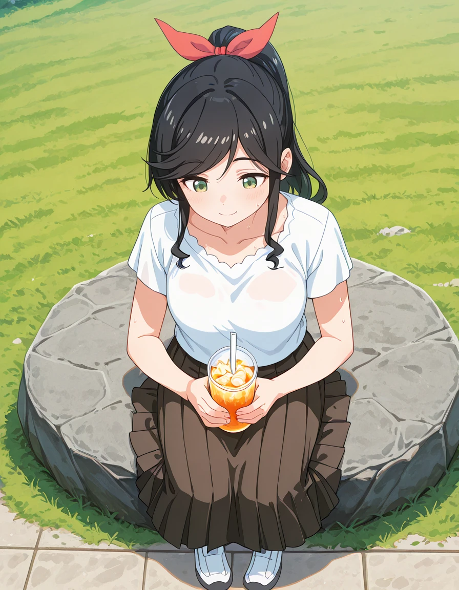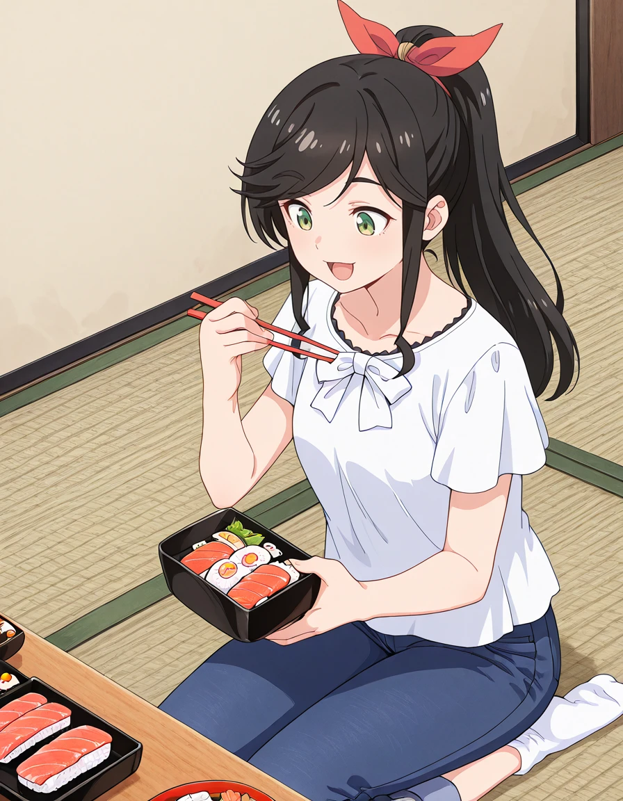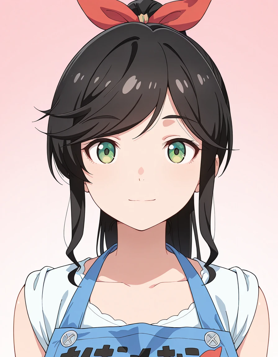 <lora:wakana_kinme-kinishite_s1-v3-ixl-anime-soralz:1>, wakana kinme (kinishite), long hair, black hair, green eyes, sidelocks, high ponytail, red hair ribbon, swept bangs, low drills