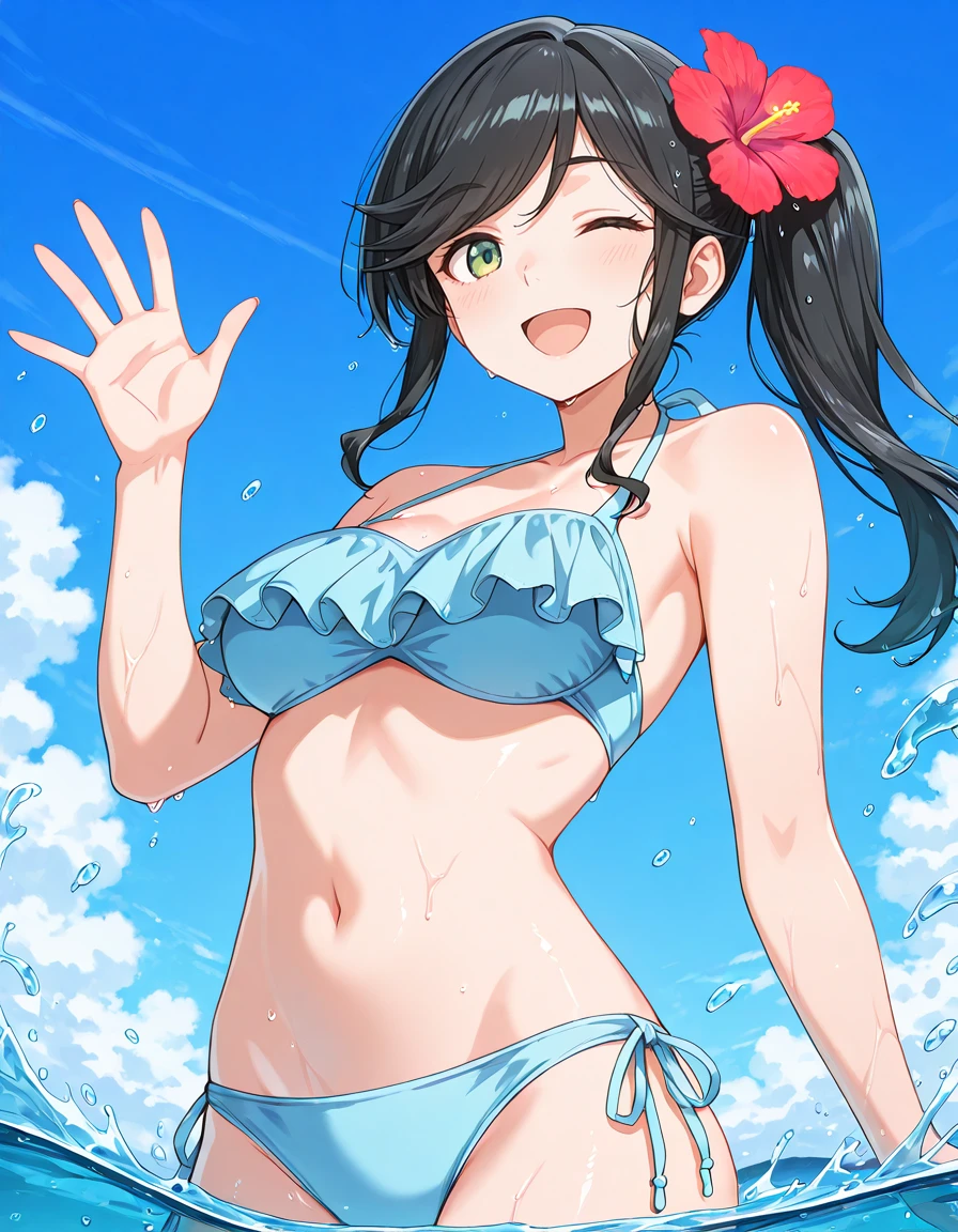 <lora:wakana_kinme-kinishite_s1-v3-ixl-anime-soralz:1>, wakana kinme (kinishite), long hair, black hair, green eyes, sidelocks, side ponytail, swept bangsOutfit - Bikini