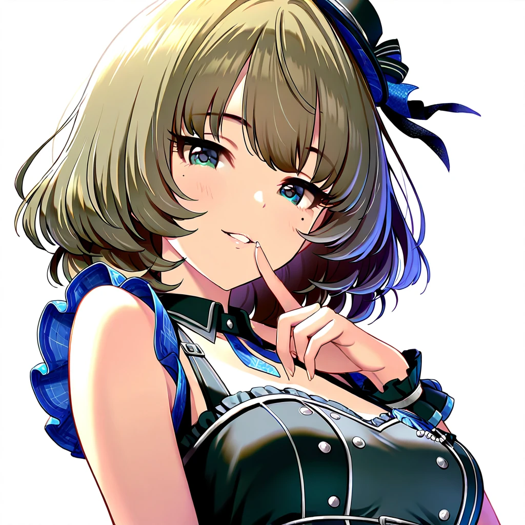 brown hair,green eyes,blue eyes,mole under left eye,short hair,
