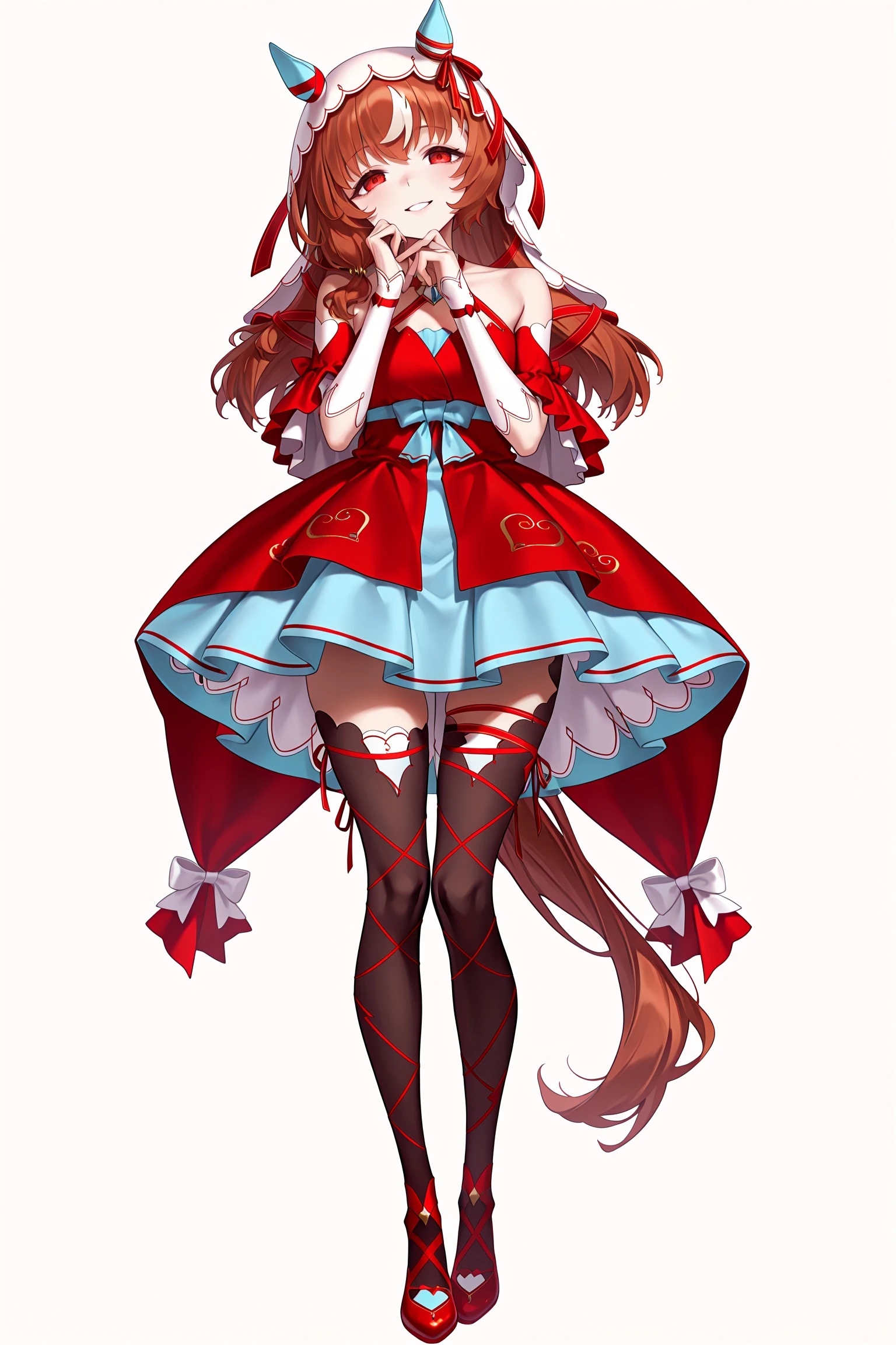still in love \(umamusume\), ear covers, veil, red dress, black thighhighs, red footwear,