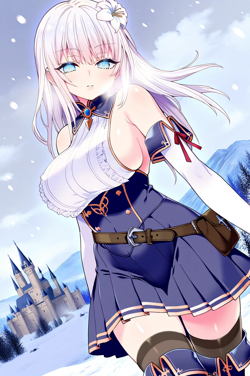 mlf_mf, 1girl, solo, blue eyes, white hair, long hair, large breasts, lips, hair flower, white flower, blue collar, white shirt, sleeveless shirt, blue brooch, sideboob, underbust, bare shoulders, red ribbon, white gloves, elbow gloves, high-waist skirt, blue skirt, belt, pouch, black thighhighs, blue boots,