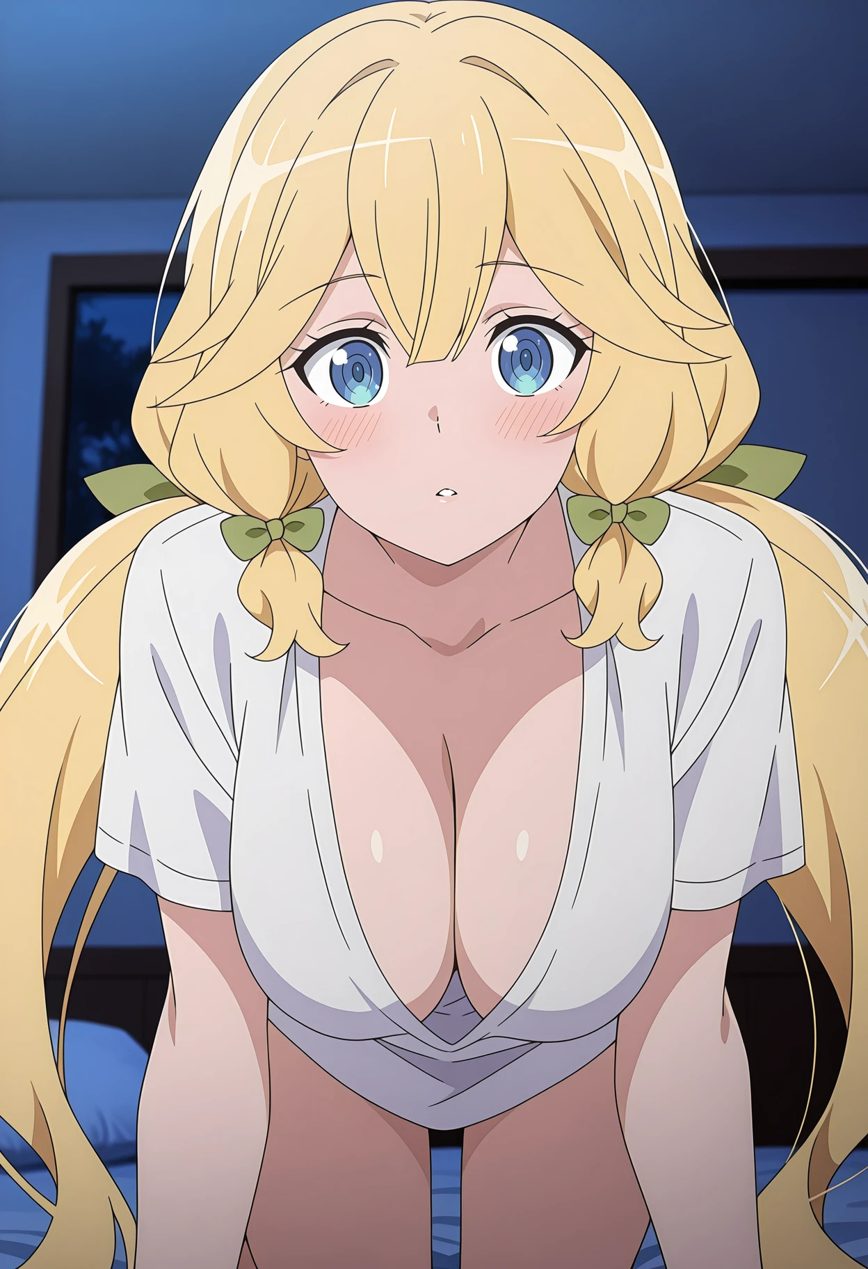 hair between eyes, low twintails, very long hair, blonde hair, blue eyes, hair bow, witch hat, large hat, hat bow, green bow, blue gemstone, green capelet, black dress, large breasts, cleavage cutout, underboob, long sleeves, frilled sleeves, black gloves, belt, belt pouch, black thighhighs
