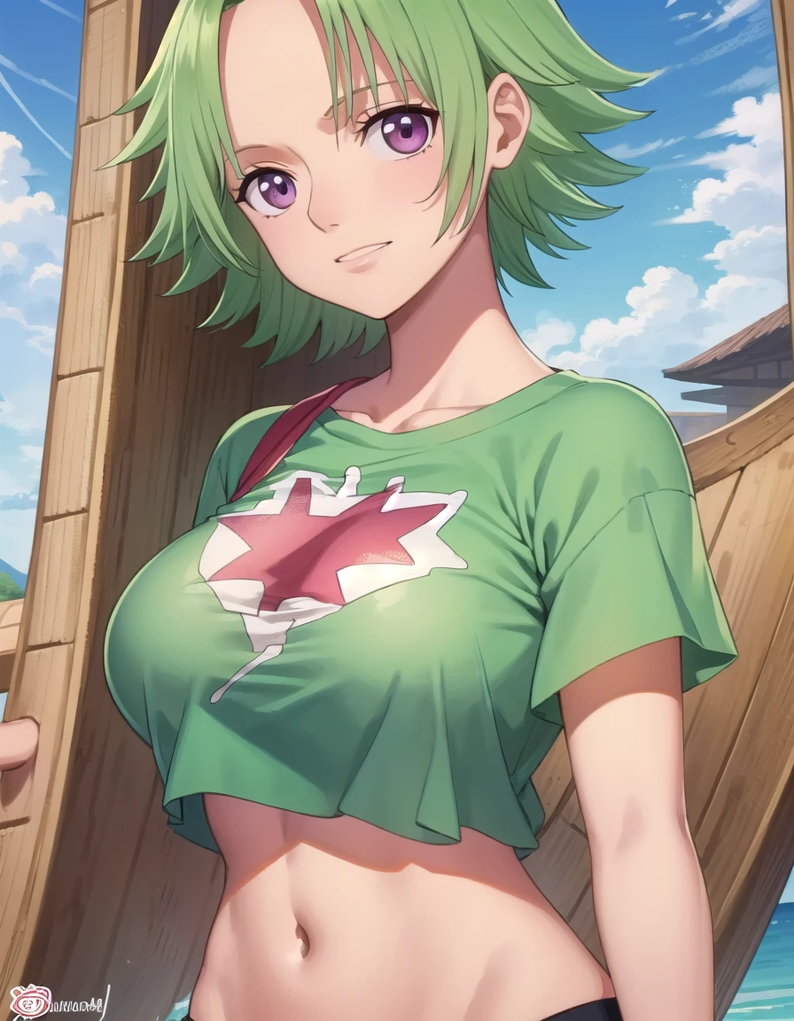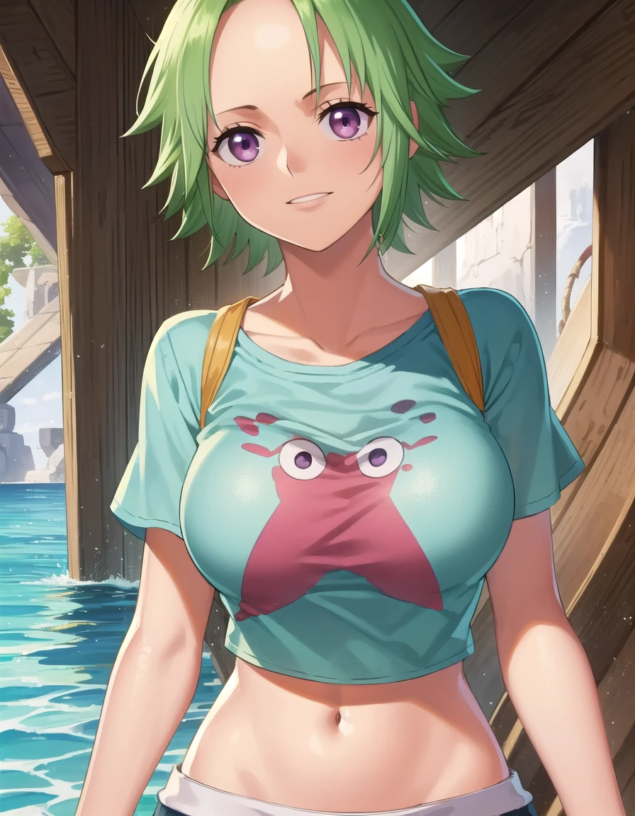 camie, short hair, green hair, monster girl, mermaid, (purple eyes:1.1), (parted bangs:1.5),