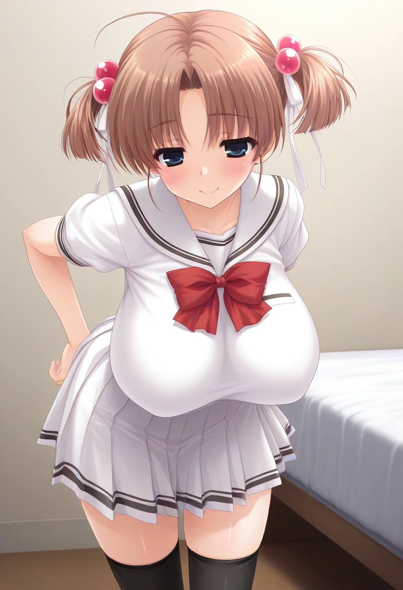 Recommend Prompt:Miyu Kanzaki, blue eyes, brown hair, shoulder-length hair, twintails, hair ribbon, red bubble hair ornament,