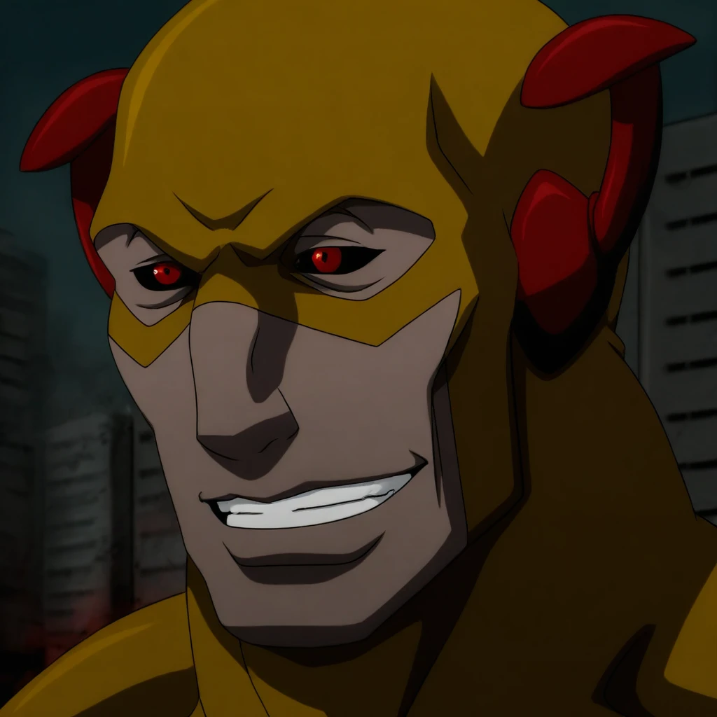 Zoom, solo, male, athletic build, muscular, red eyes, black sclera, yellow , black circle with a red lightning bolt on chest, cowl, red lightning bolt accents at the sides of head, red lightning-pattern belt around waist, red boots,