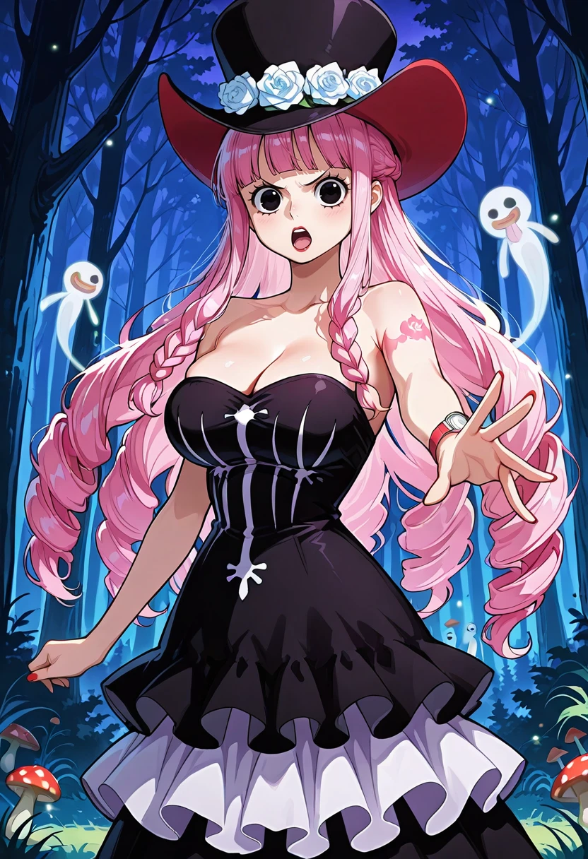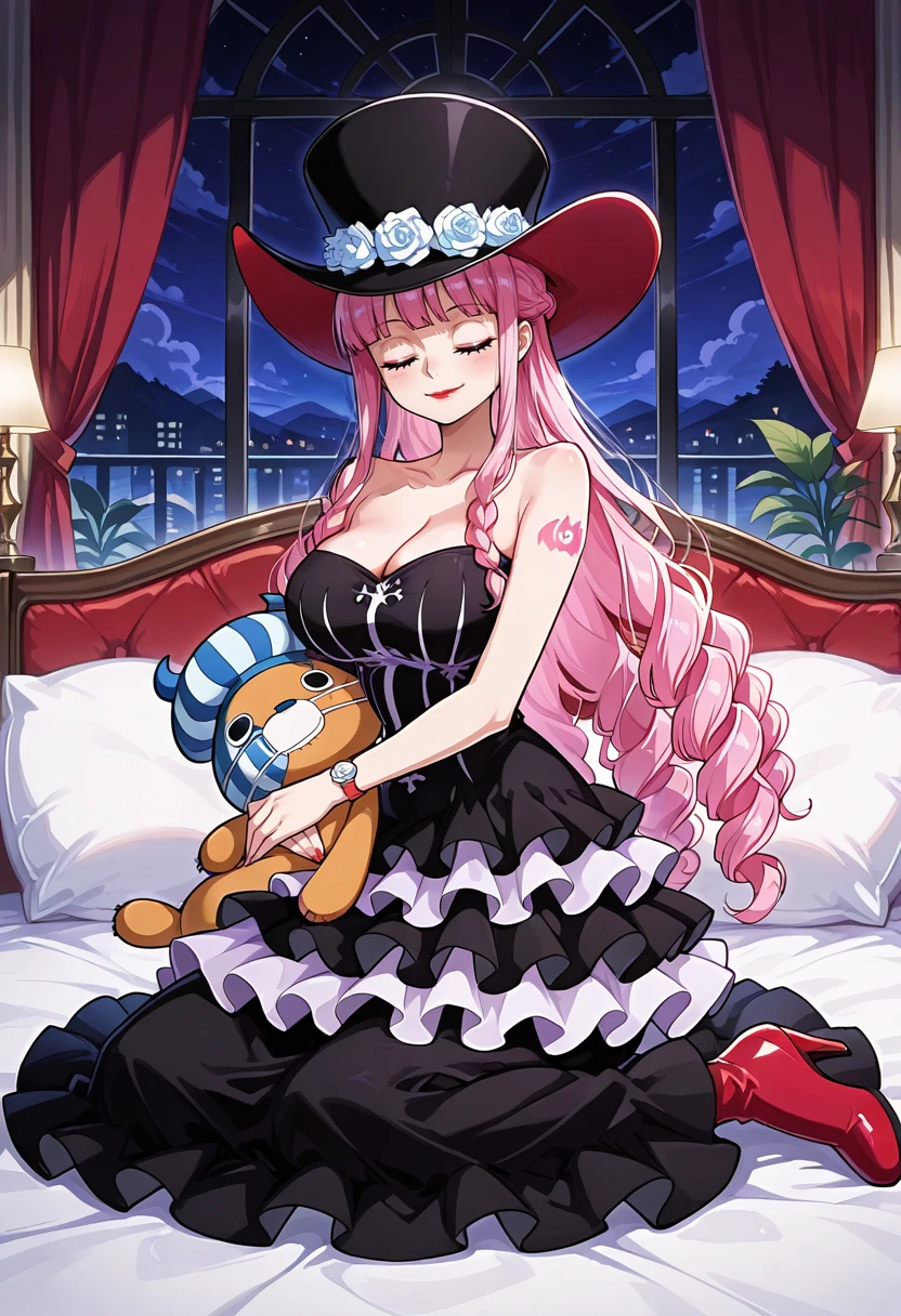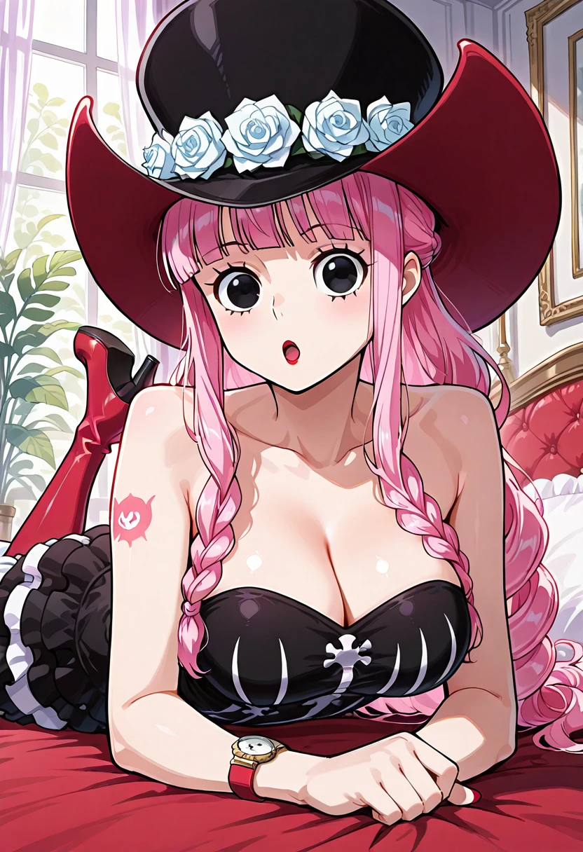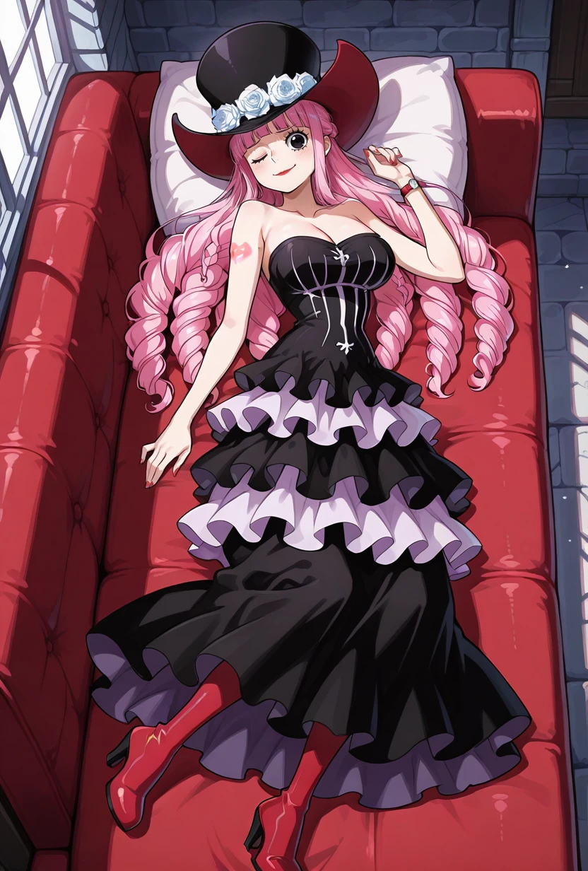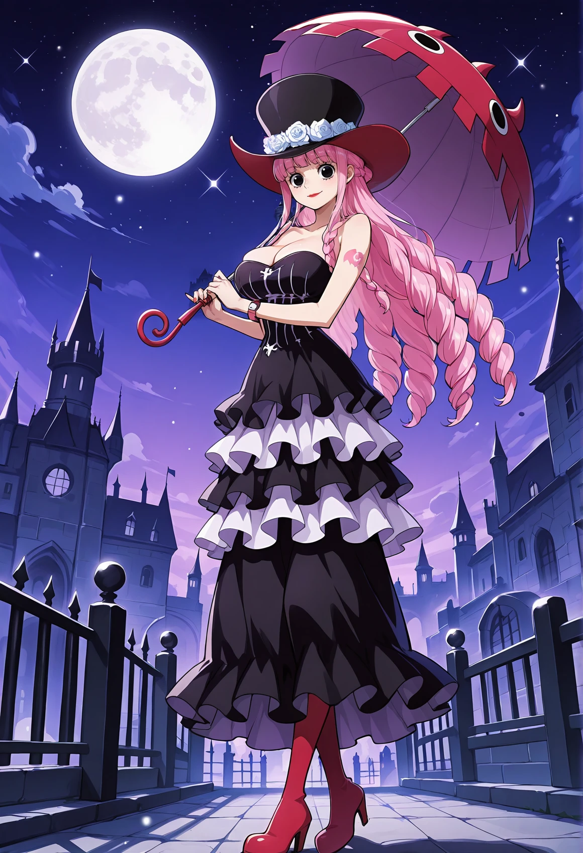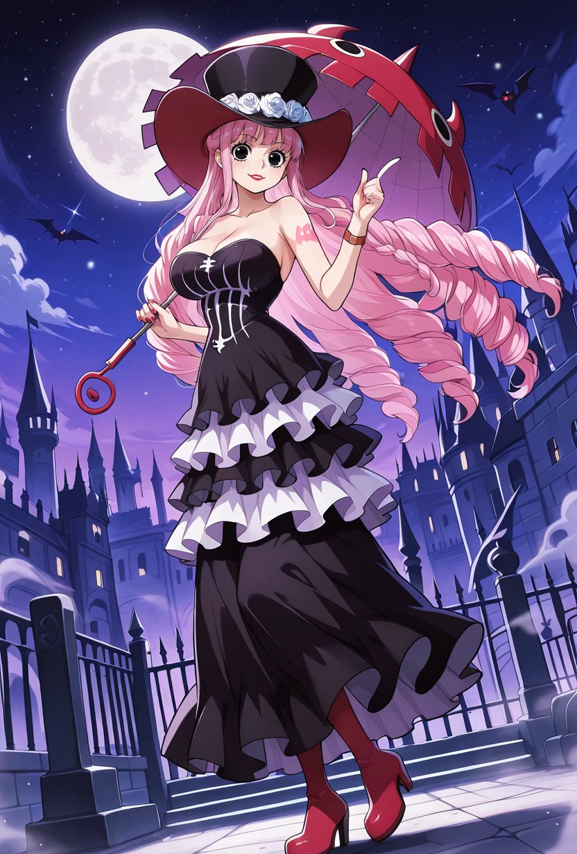 PeronaBase, black eyes, pink hair, long hair, drill hair, braid, sidelocks, red lipstick, makeup, red nail polish, black top hat, white hat flower, white rose, bare shoulders, collarbone, large breasts, multicolored dress, black dress, purple dress, long dress, layered dress, strapless dress, frilled dress, sleeveless dress, red high heel boots, pink arm tattoo, wristwatch,