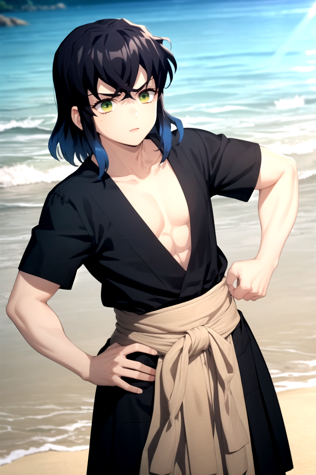 Unmasked prompts : inosuke, bangs, black hair, blue hair, green eyes // Neg : mask, inosukemask, animal, fur