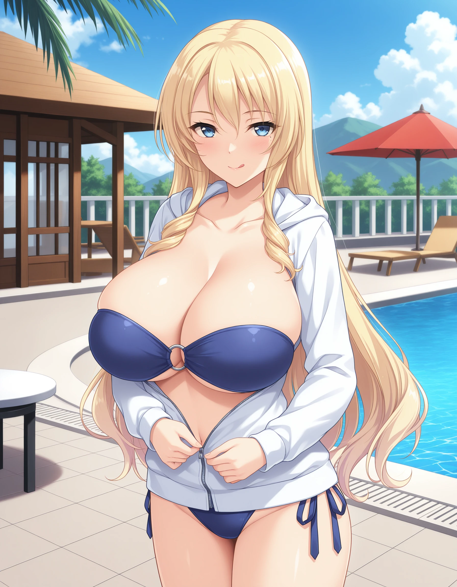 white jacket,hooded jacket,side-tie bikini bottom,blue bikini