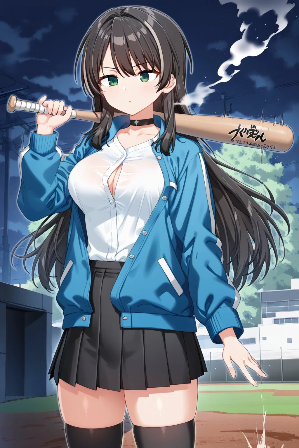 1girl, solo, kei, black hair, long hair, green eyes, streaked hair, black choker, white shirt,open jacket,blue jacket,pleated skirt, black skirt,untucked shirt, thighhighs