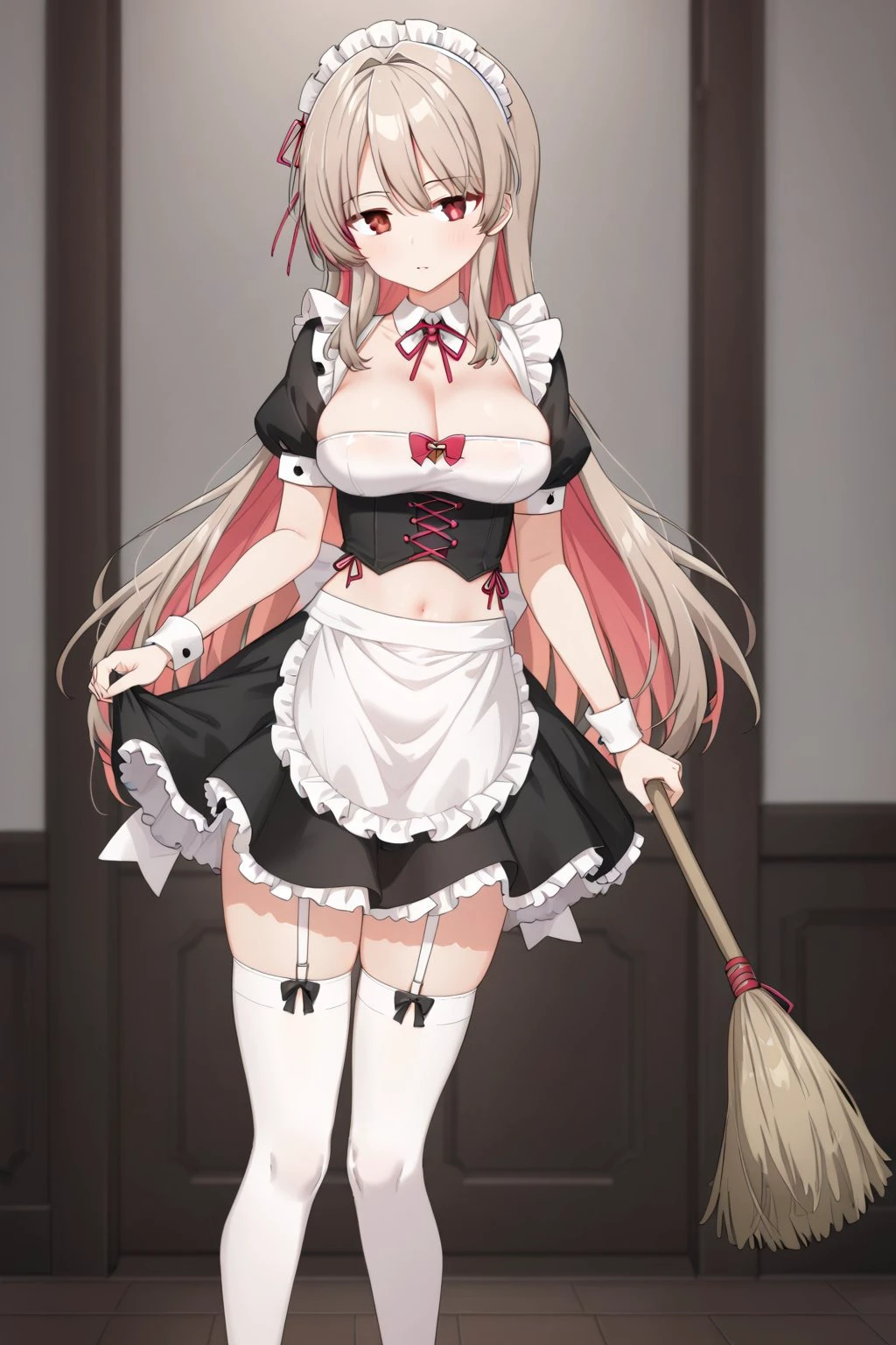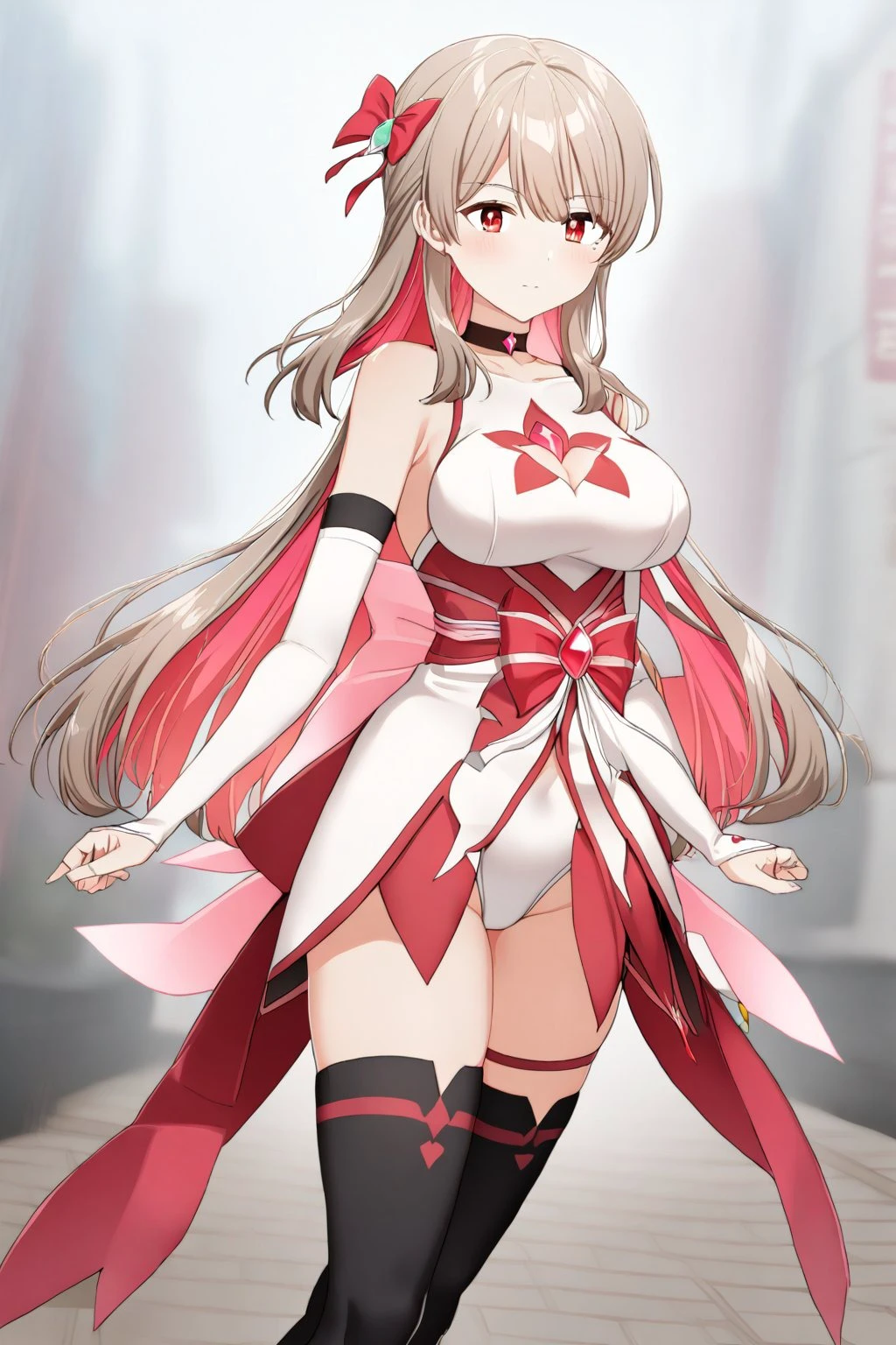 1girl, solo, vantia, brown hair, colored inner hair, pink hair, red eyes, bright pupils, hair ribbon, large breasts, magical girl, choker, ruby, white leotard, cleavage cutout, detached sleeves, bridal gauntlets ,sash, sash bow,black thighhighs, thighhighs, stirrup legwear,