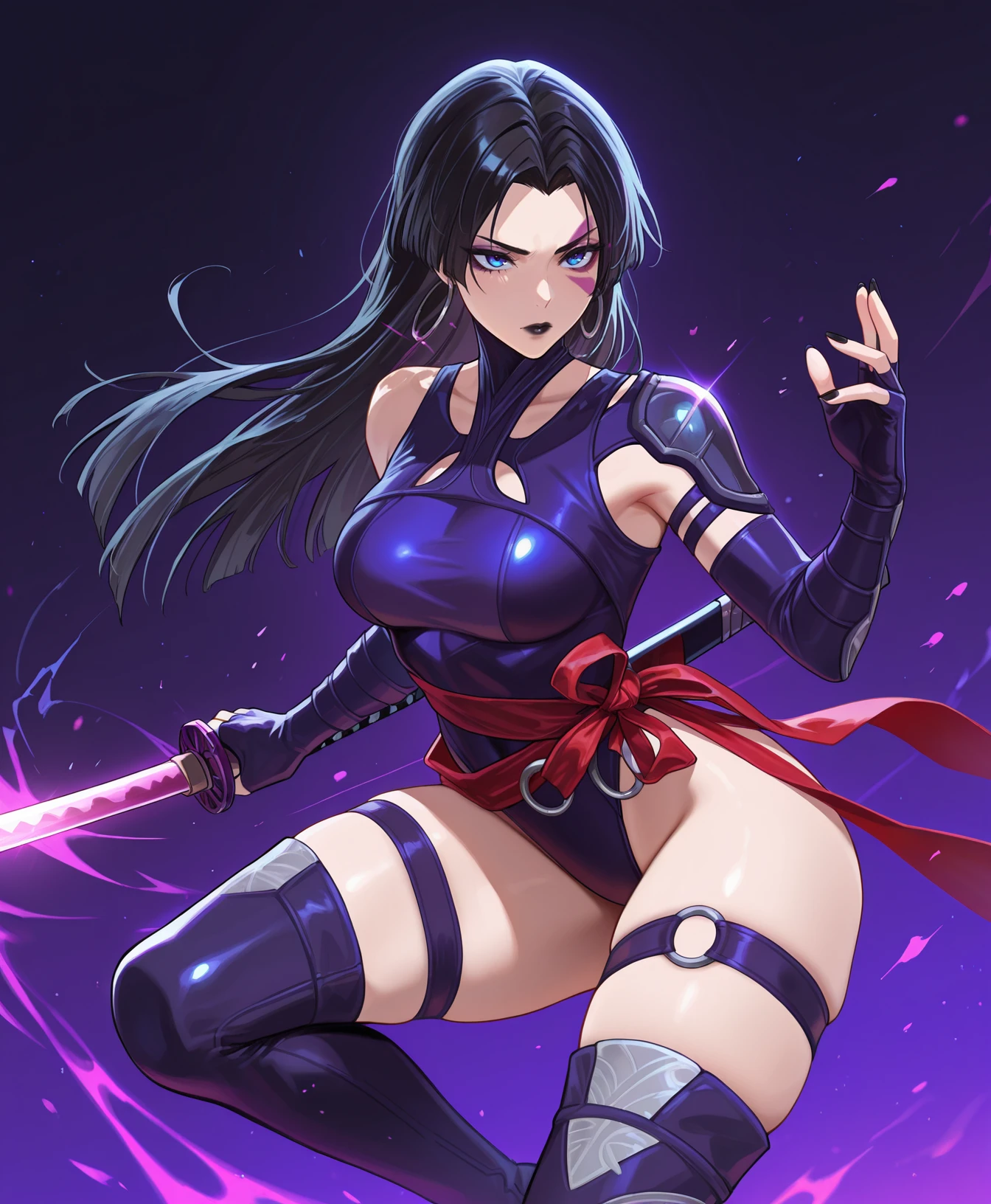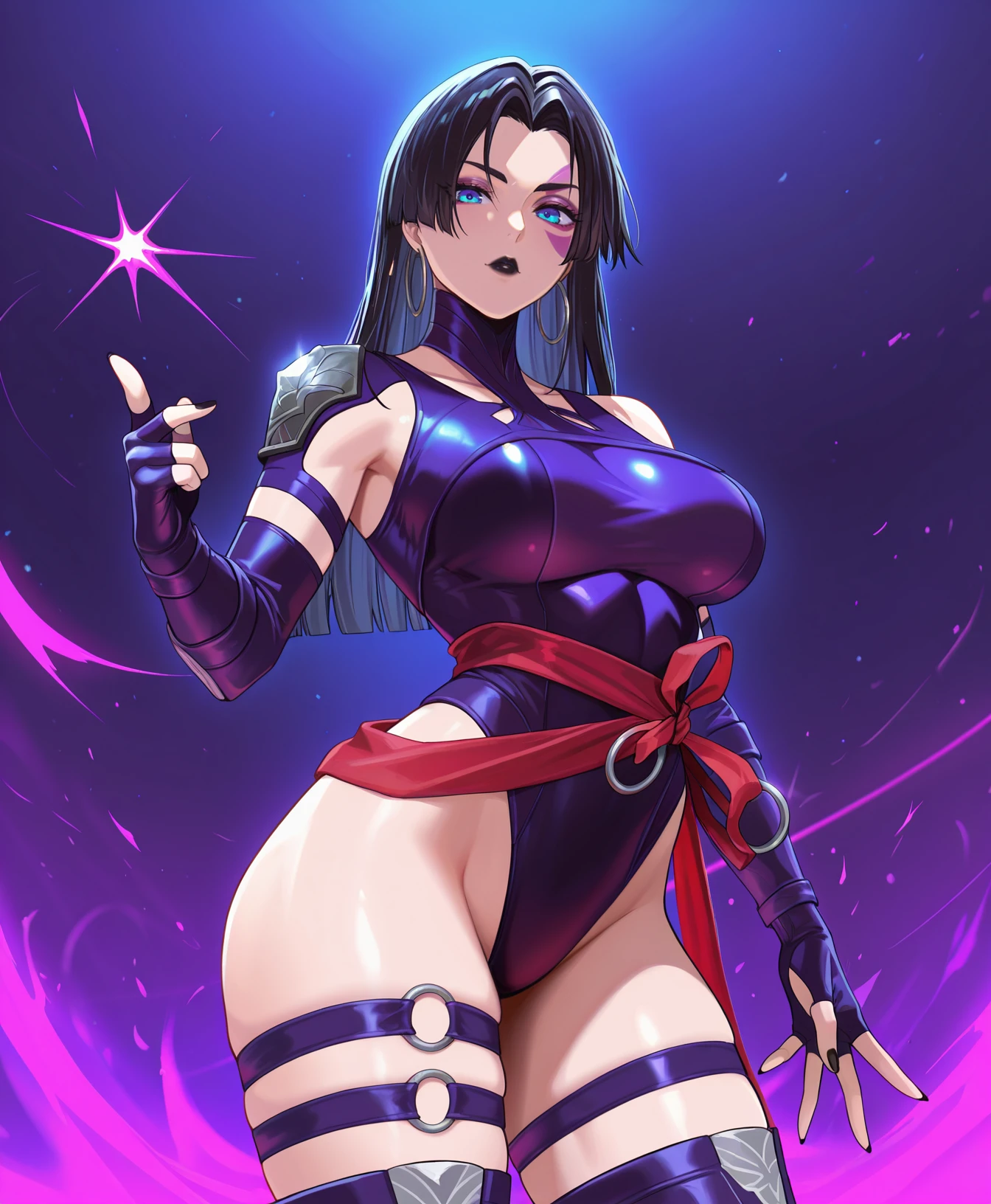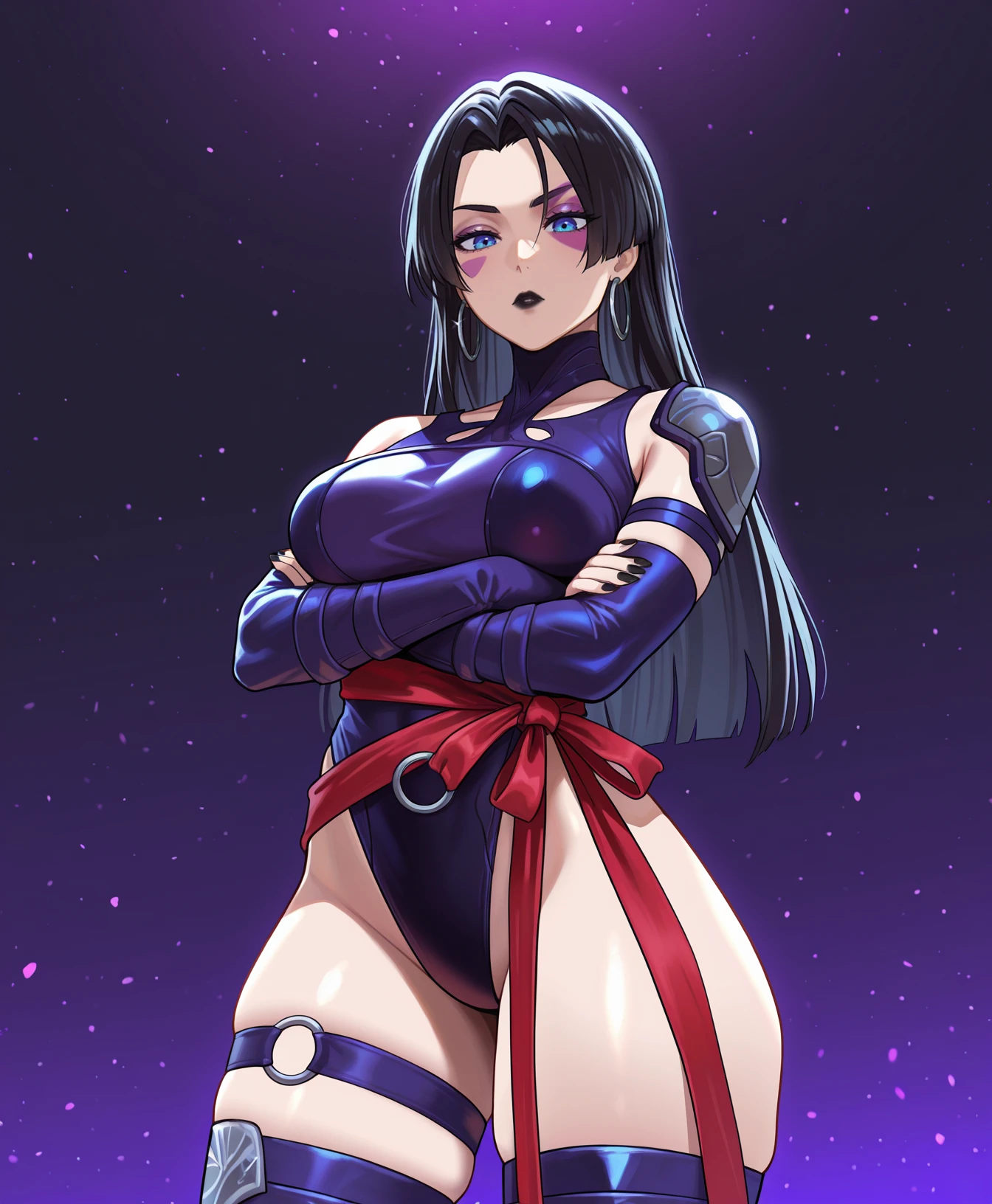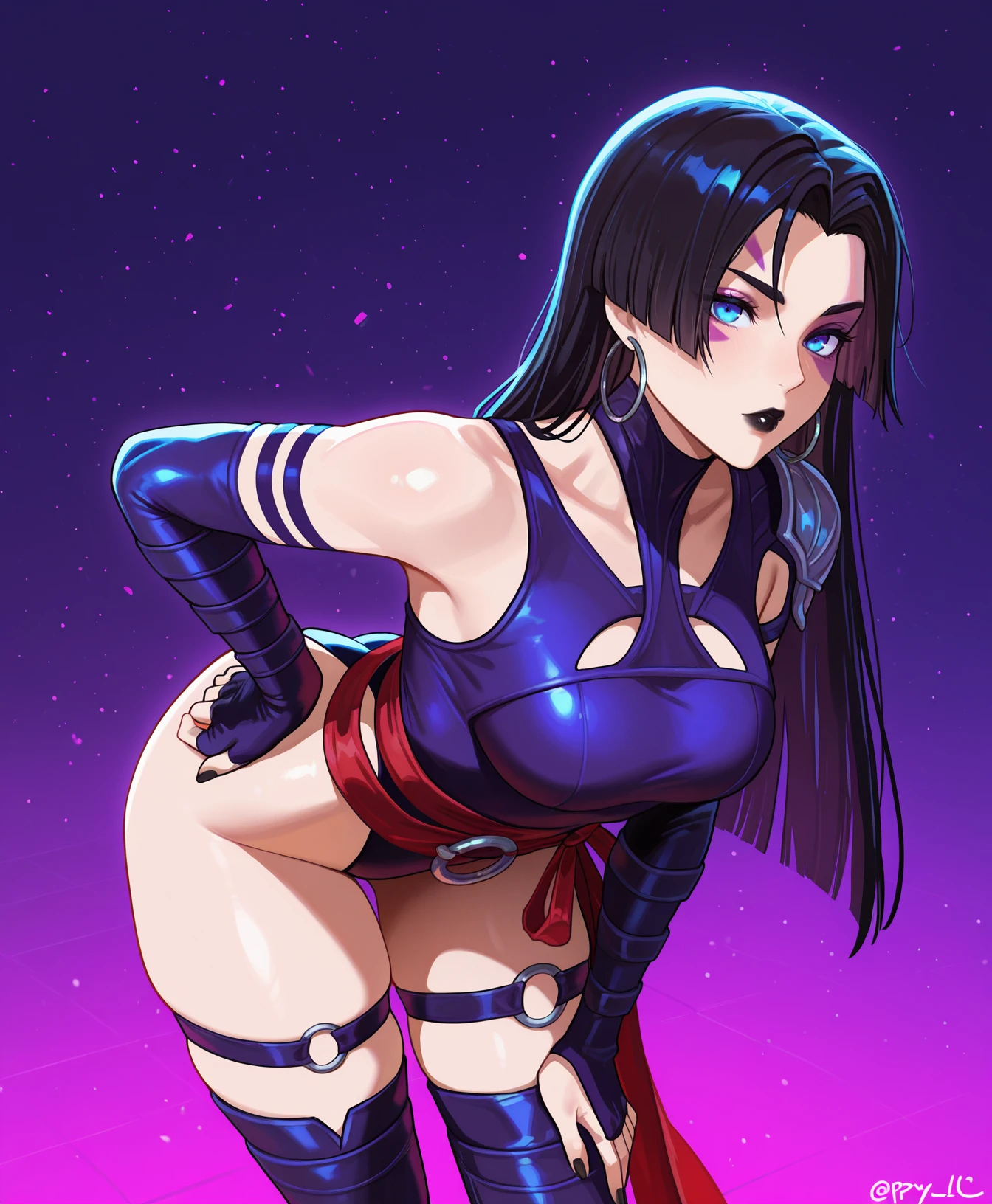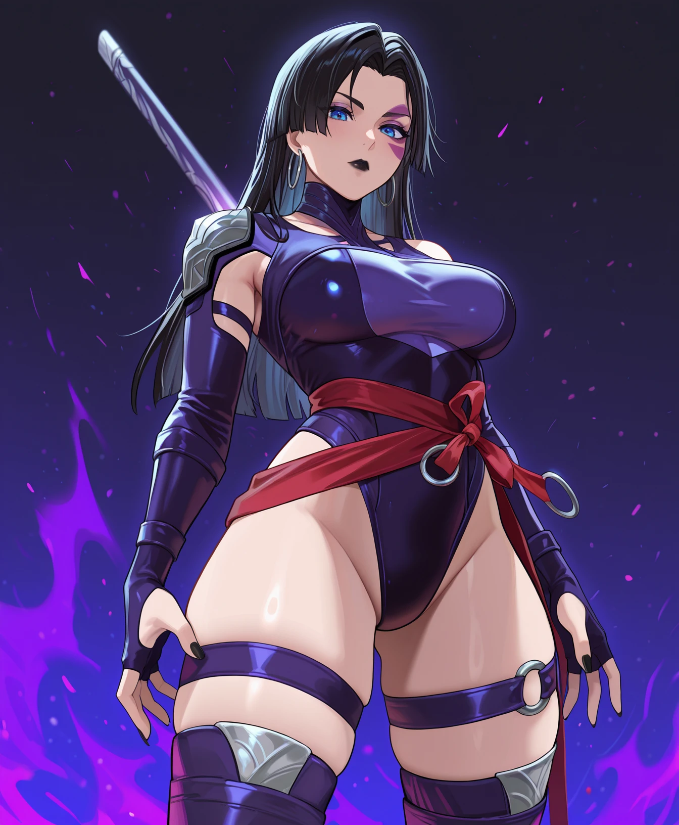 blue eyes, purple face mark, black hair, black lipstick, straight hair, long hair, hoop earrings