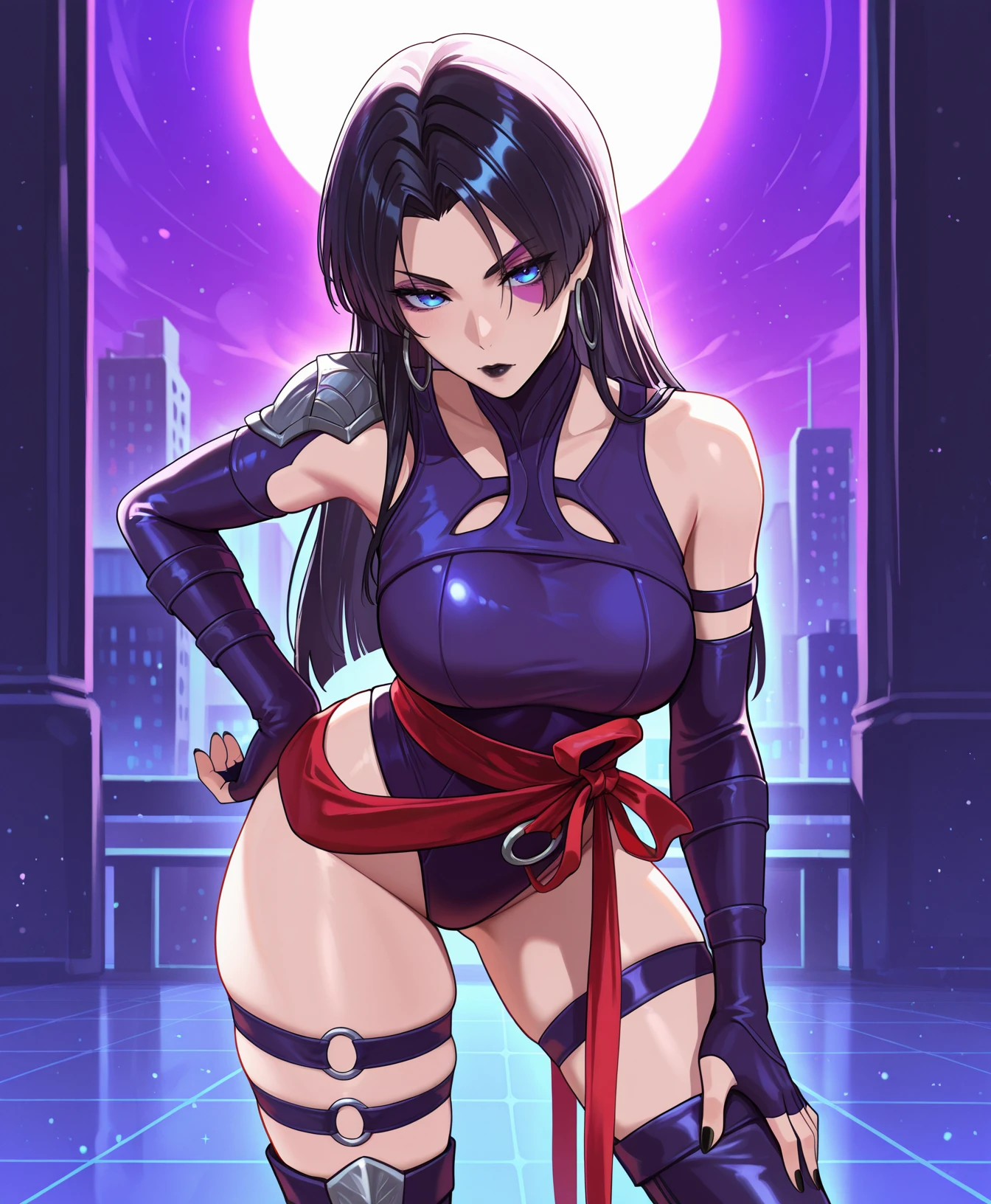 highleg leotard, shoulder armor, bare shoulder, o-ring, red sash, thigh straps, elbow gloves, fingerless gloves, black nails