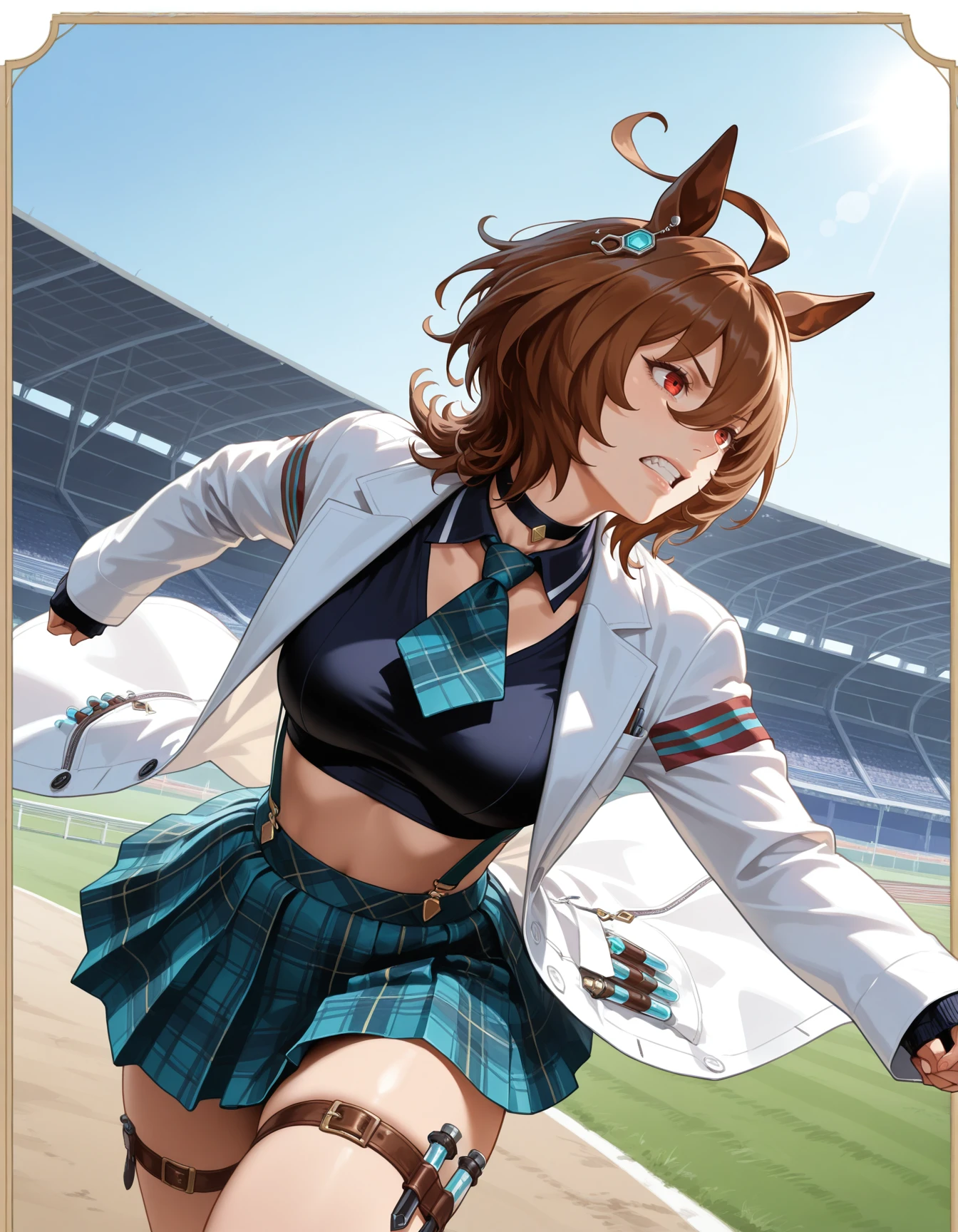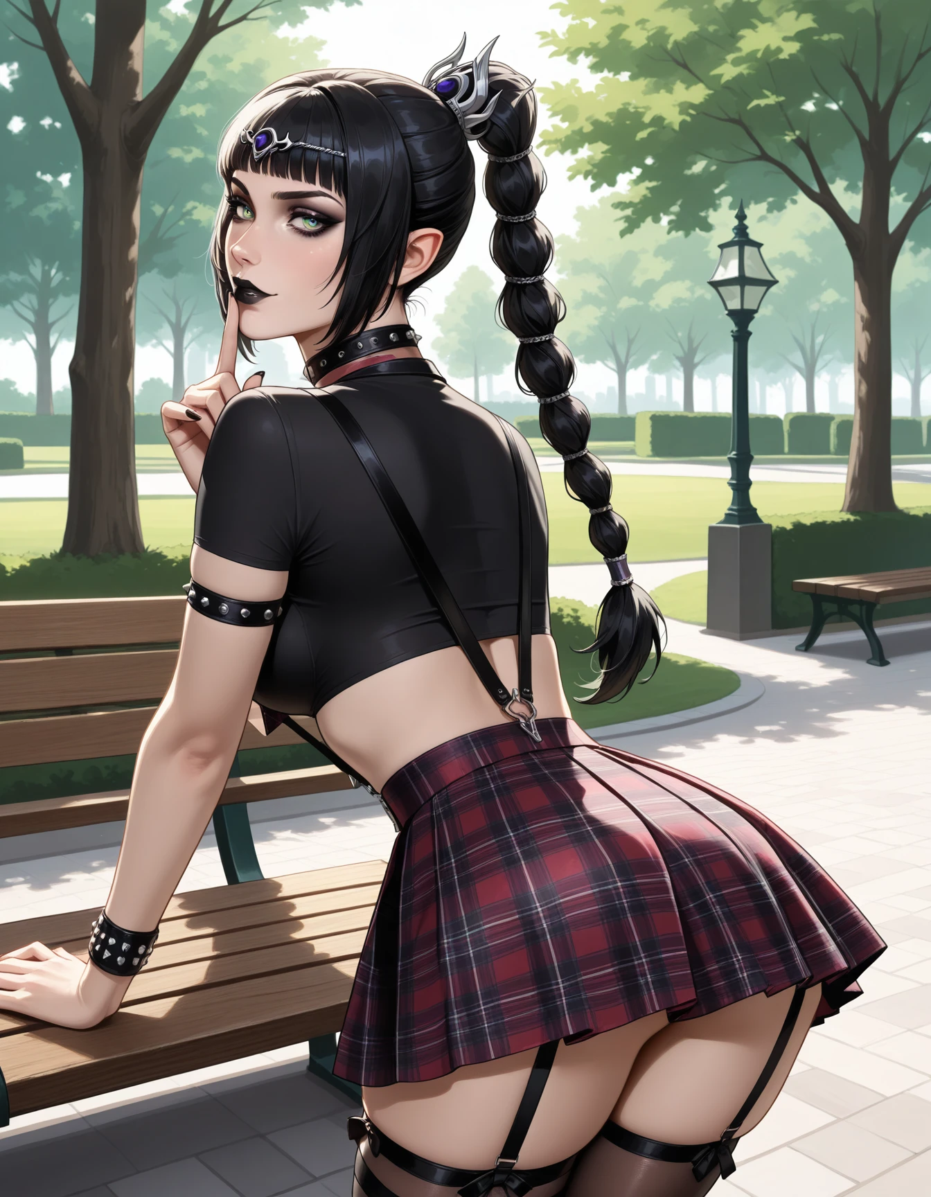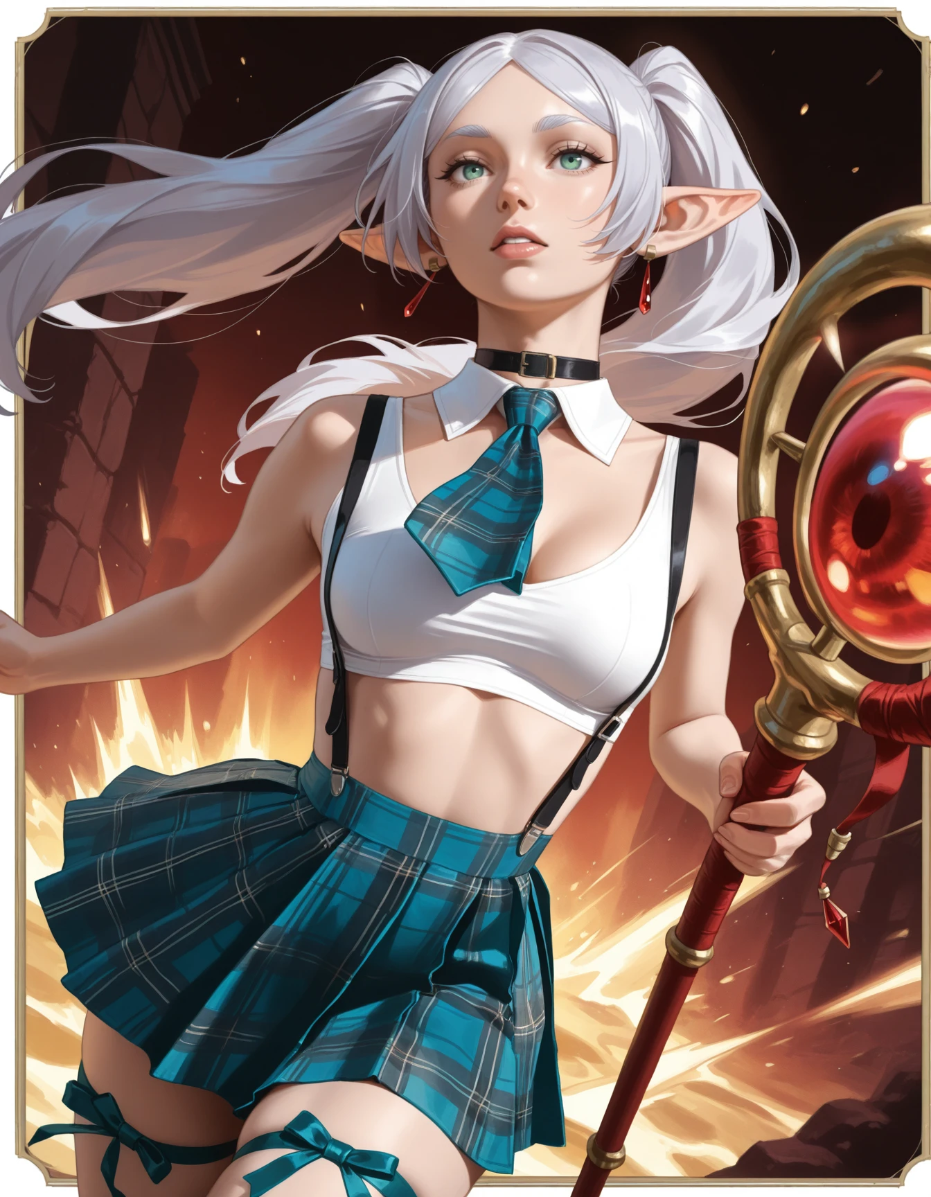 crop top, choker, collarbone, suspender_skirt, plaid skirt, pleated skirt, thigh ribbons, plaid necktie, choker