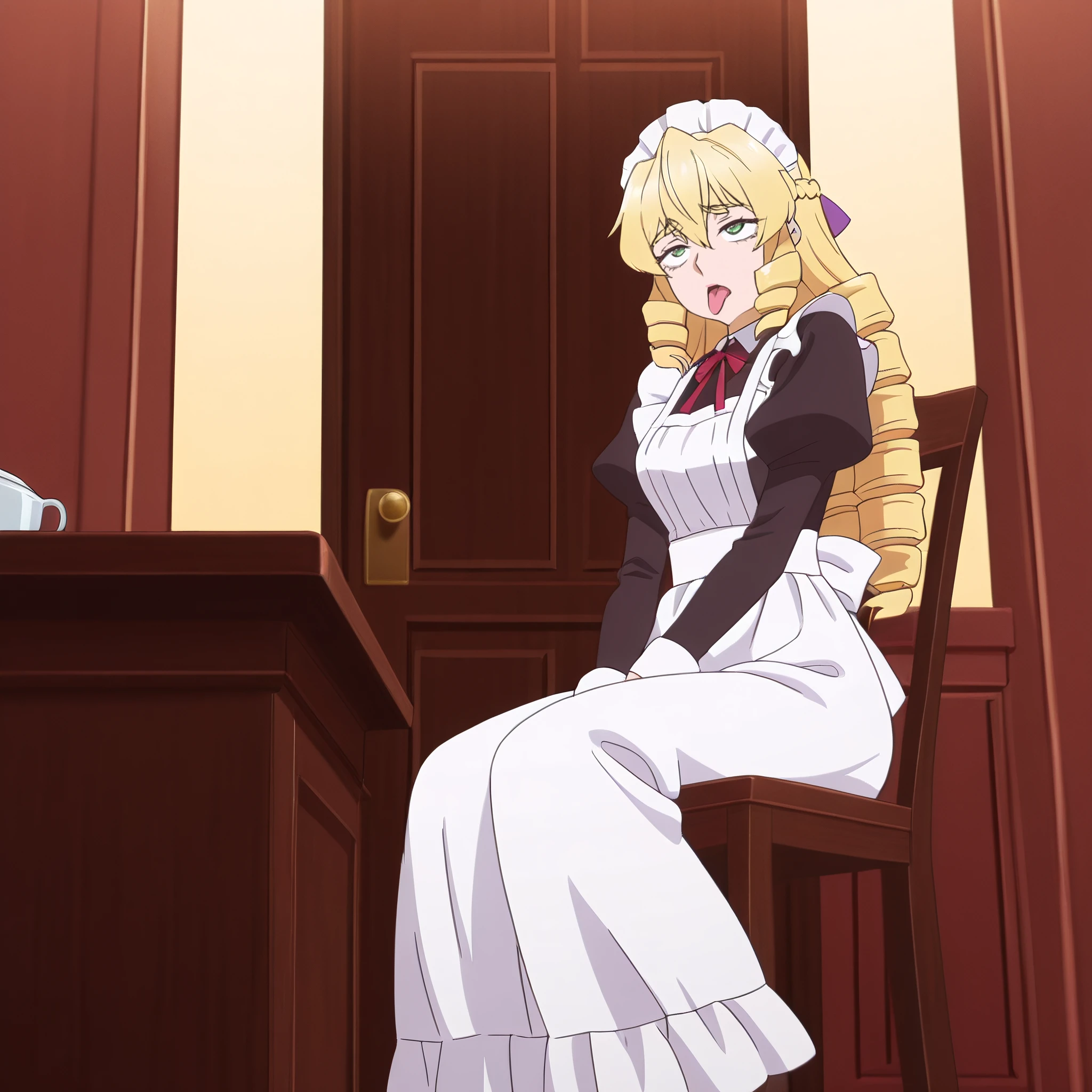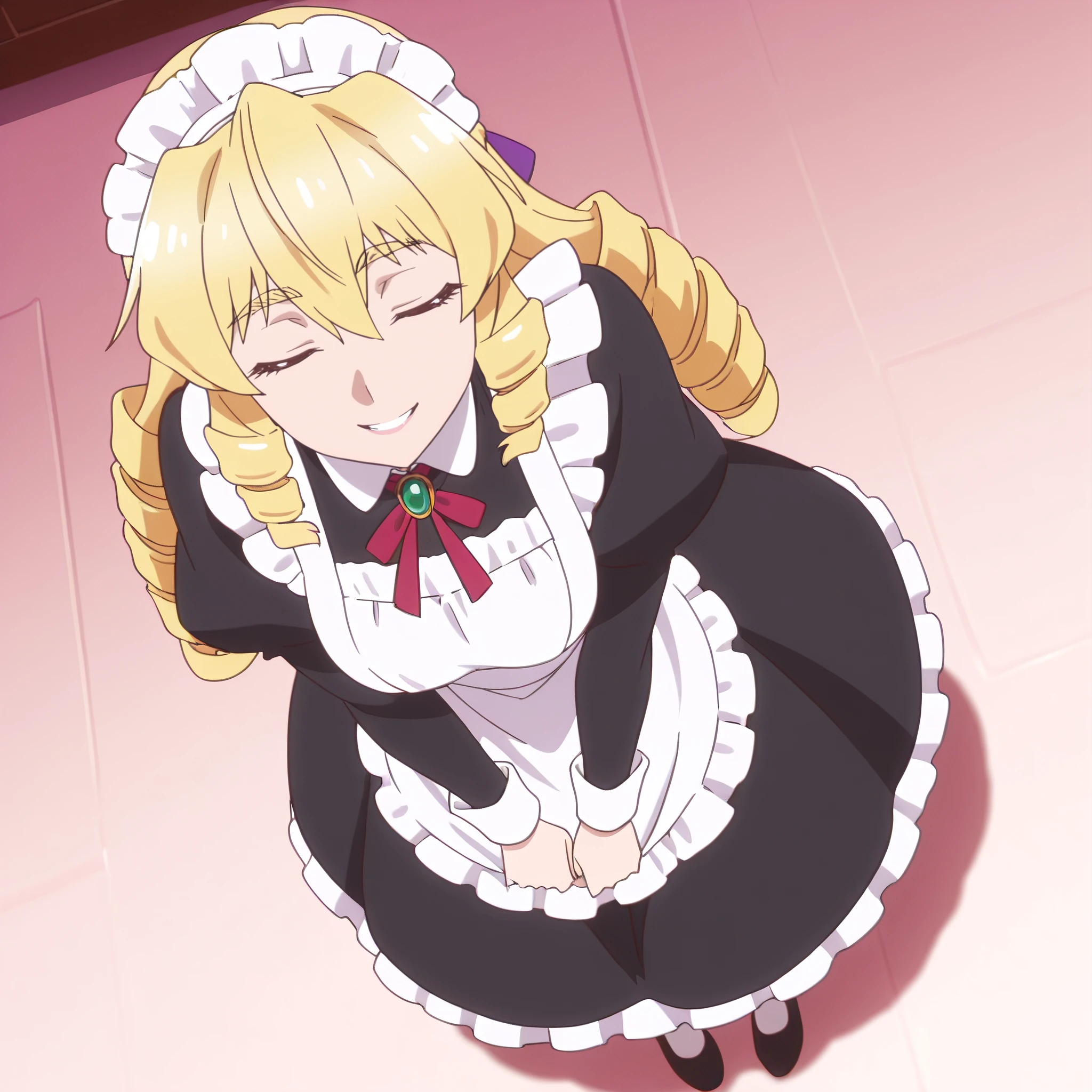 GraceMaid, maid headdress, maid, short hair, bow, dress, ribbon, hat, long sleeves, maid apron, red ribbon, neck ribbon, puffy sleeves, apron, ringlets,