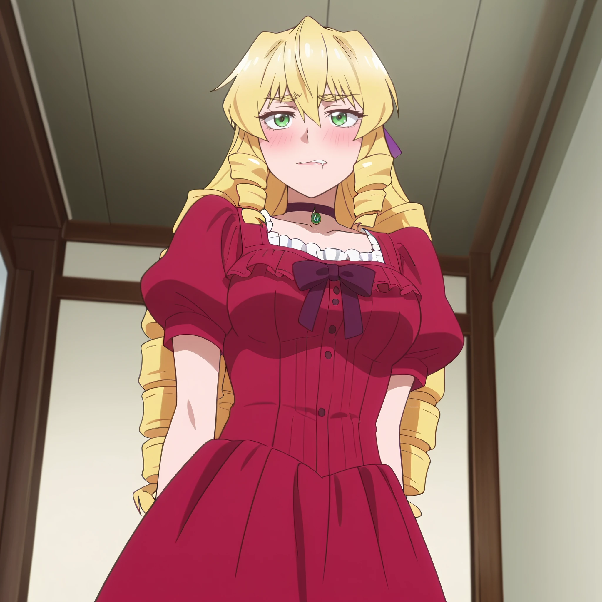 GraceFrilledDress, dress, bow, hair blow, choker, collarbone, frills, ringlets, ribbon, short sleeves, red dress, puffy sleeves,