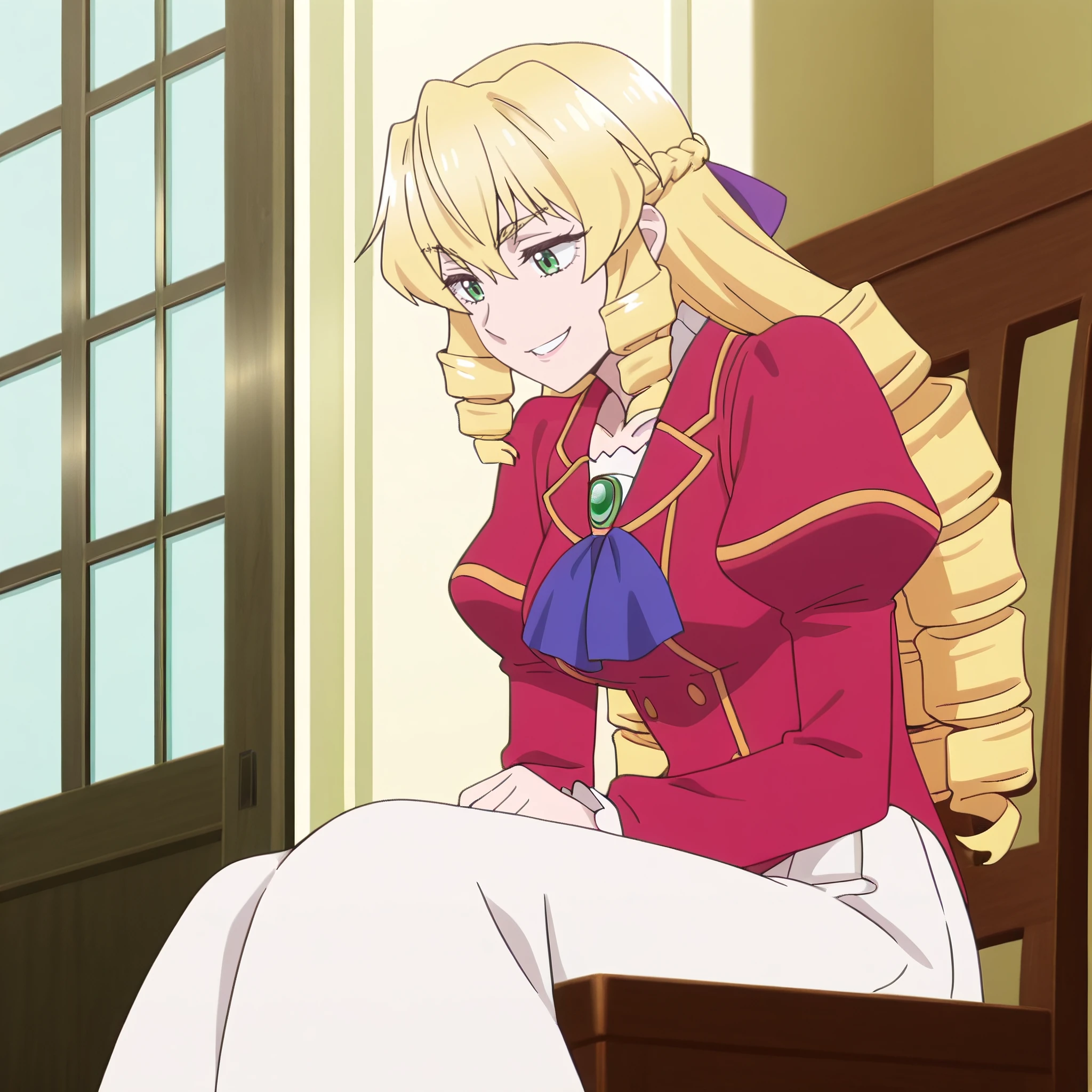 GraceSchool, bow, jacket, ringlets, long sleeves, ribbon, jewelry, hair bow, ascot, brooch, blue bow, dress, shirt, school uniform, hair ribbon, gem, red jacket, white skirt,