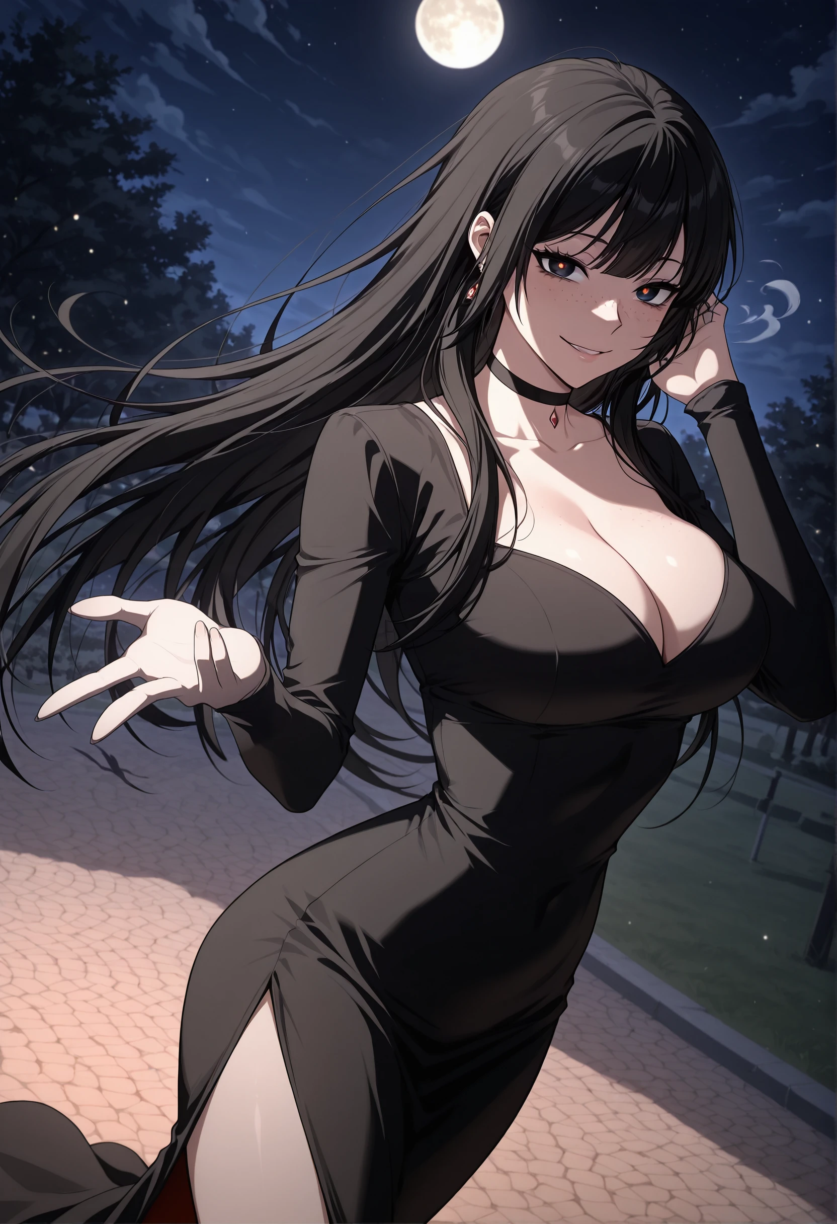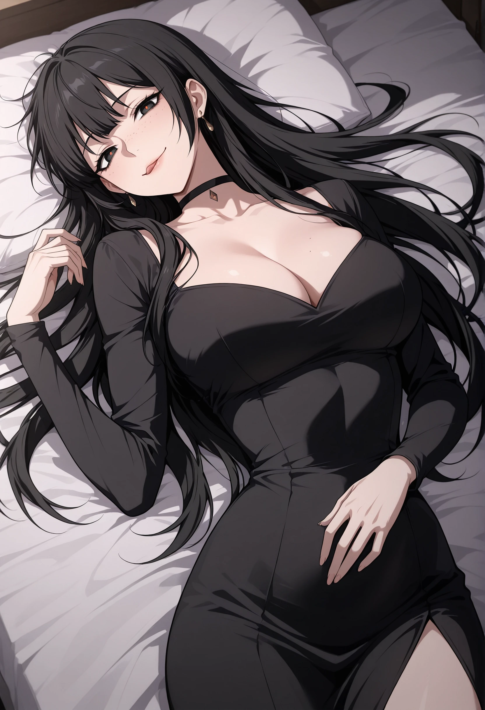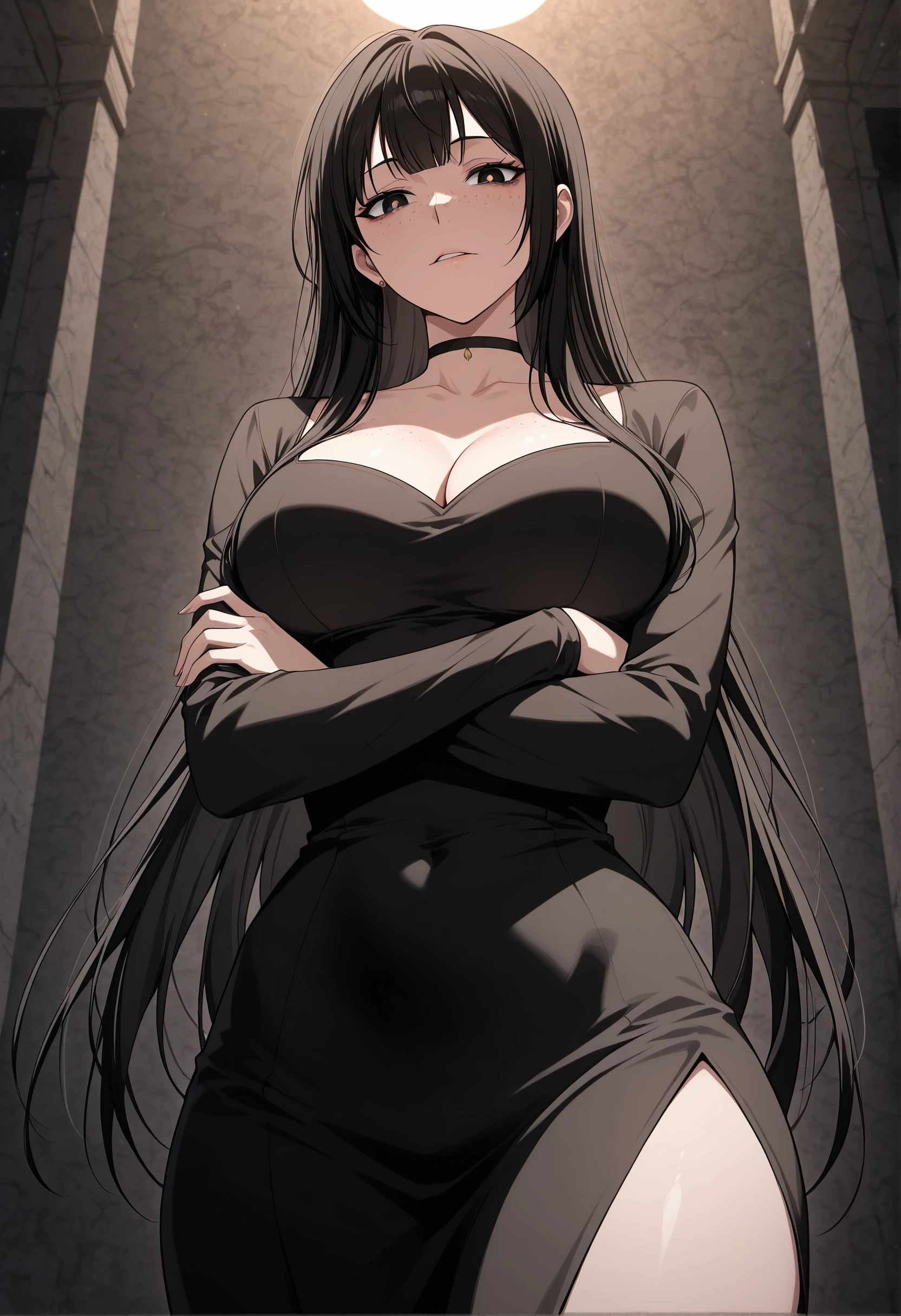 1girl,Saintess_(Trait Hoarder),black hair,long hair,straight hair,long sidelocks,black eyes,yellow pupils,big chest,