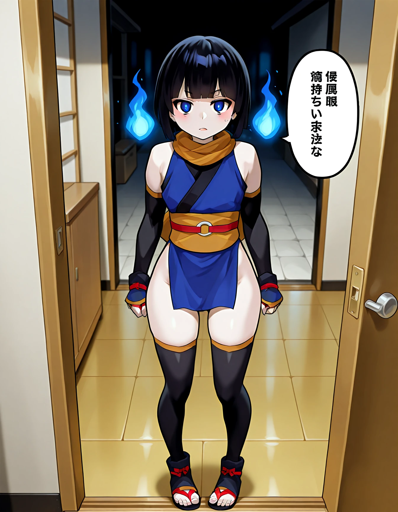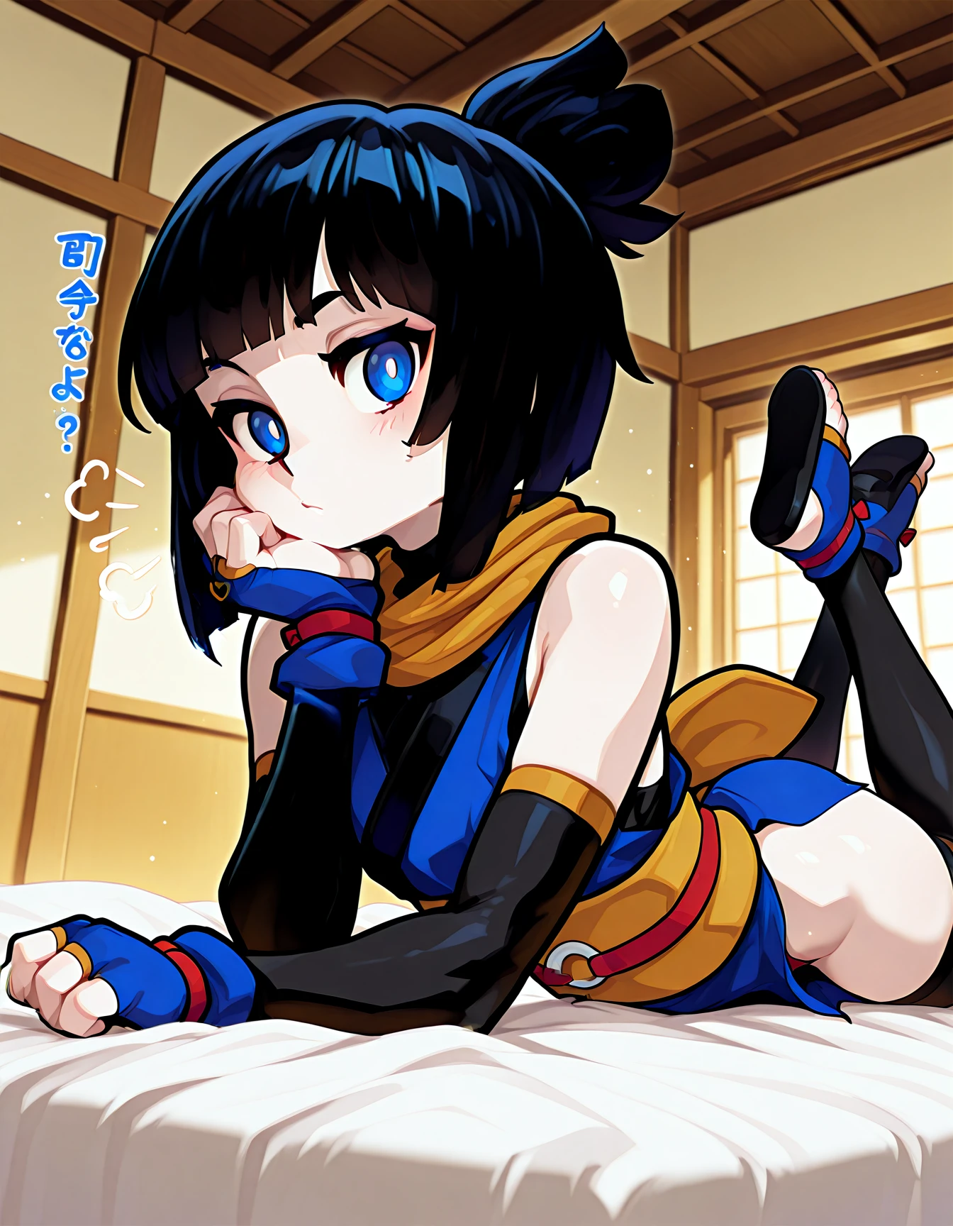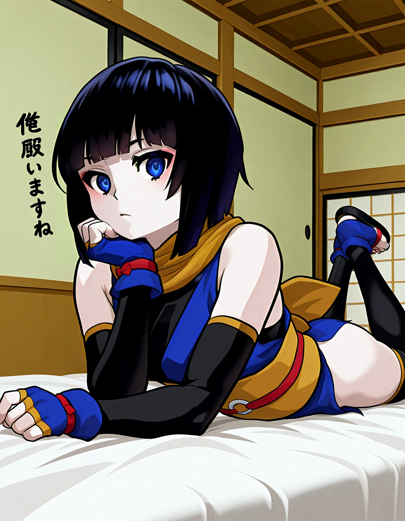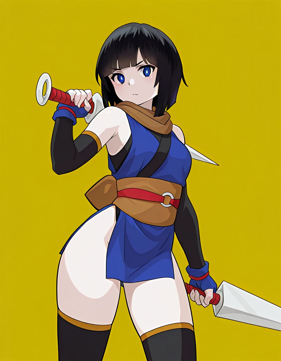 KCShinobu LoRA is trained to generate the original character kcshinobu, a striking kunoichi with short black hair, bright blue eyes, and a distinctive blue outfit consisting of a short dress with a side slit, belt, sash, scarf, and fingerless gloves.