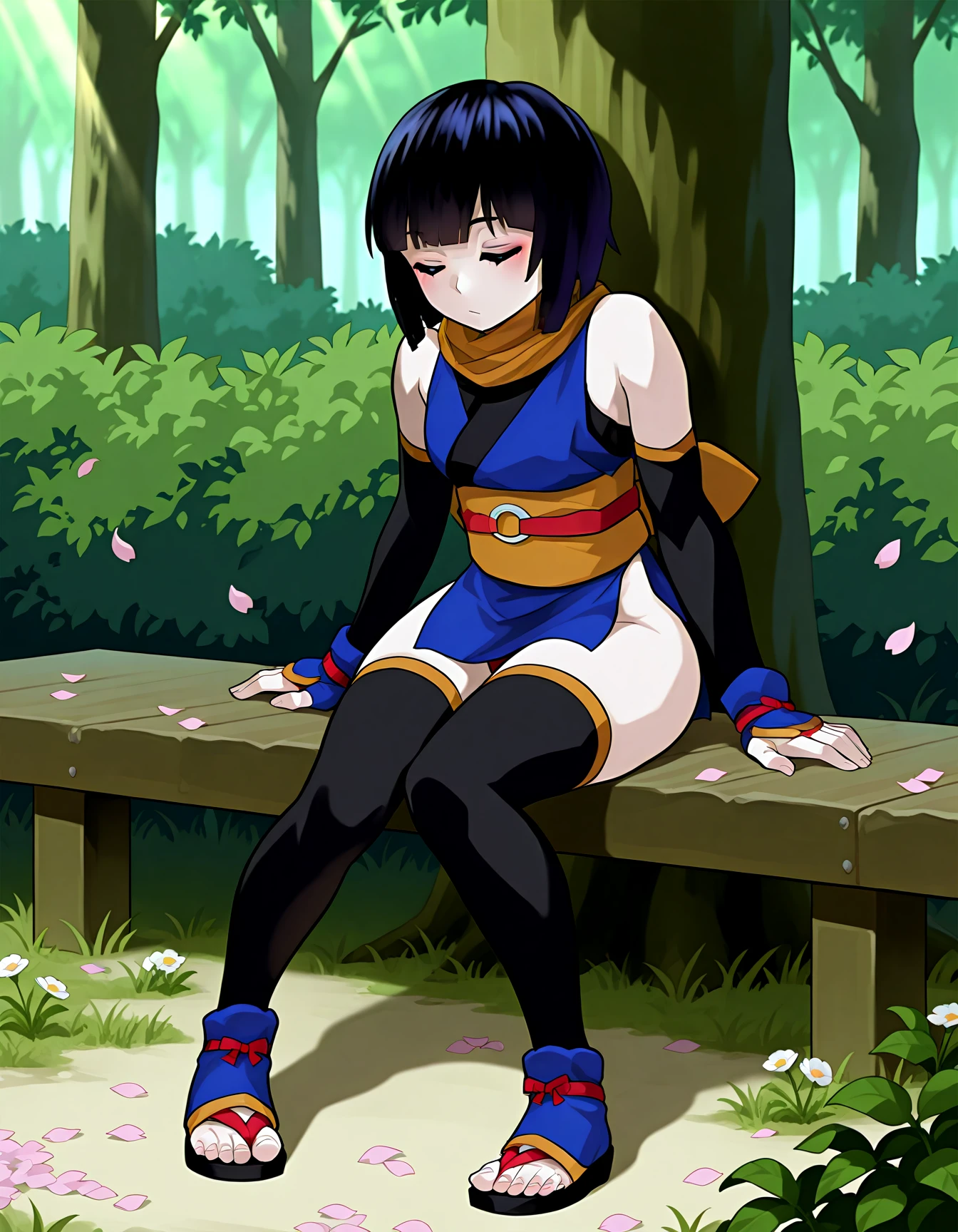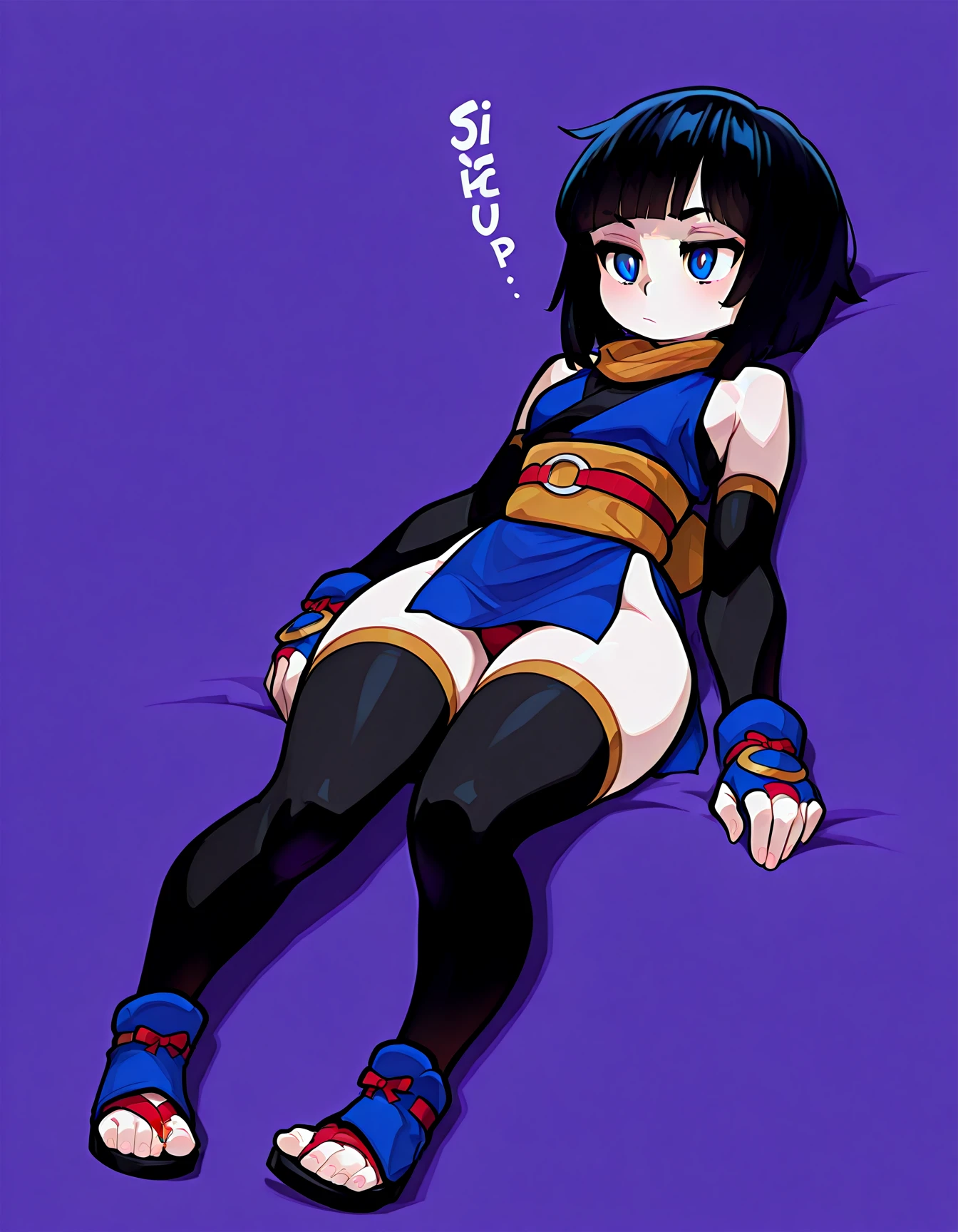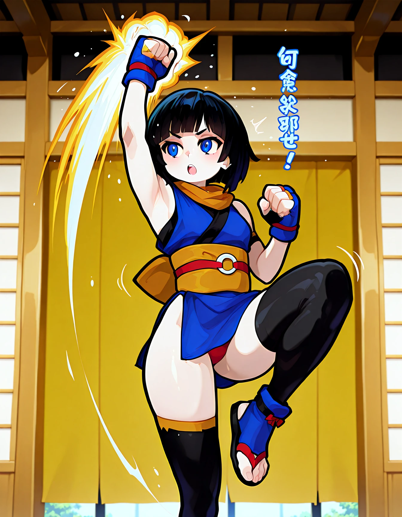 KCShinobu LoRA is trained to generate the original character kcshinobu, a striking kunoichi with short black hair, bright blue eyes, and a distinctive blue outfit consisting of a short dress with a side slit, belt, sash, scarf, and fingerless gloves.