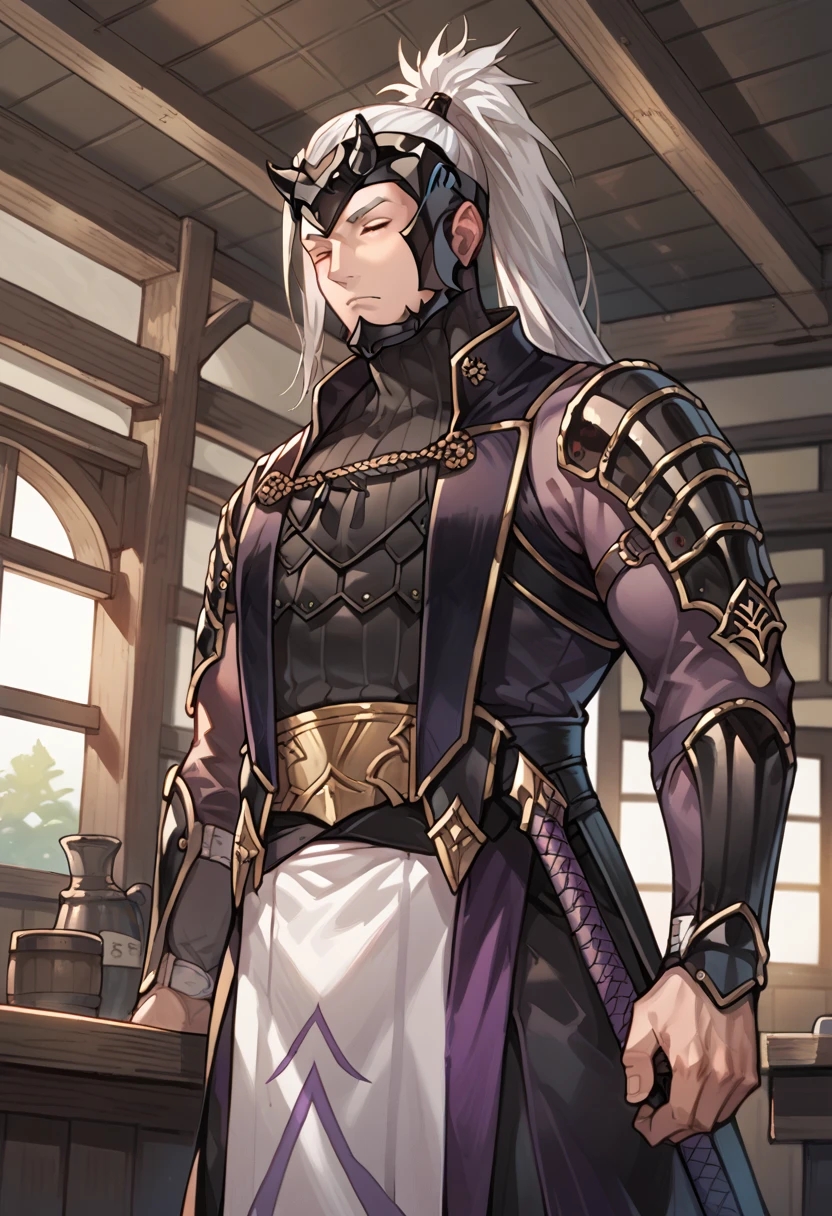 yenfay, white hair, long hair, mature male, closed eyes