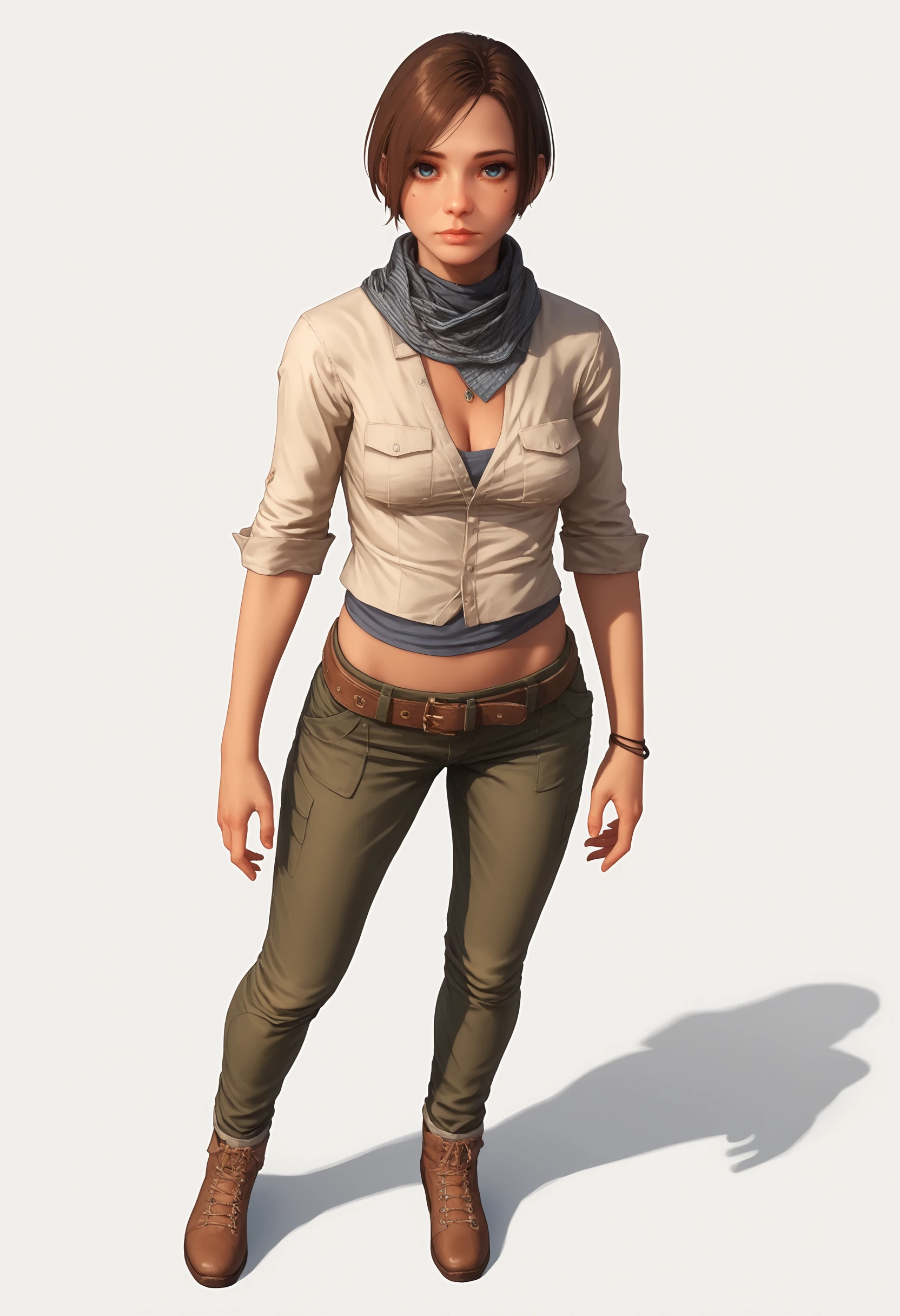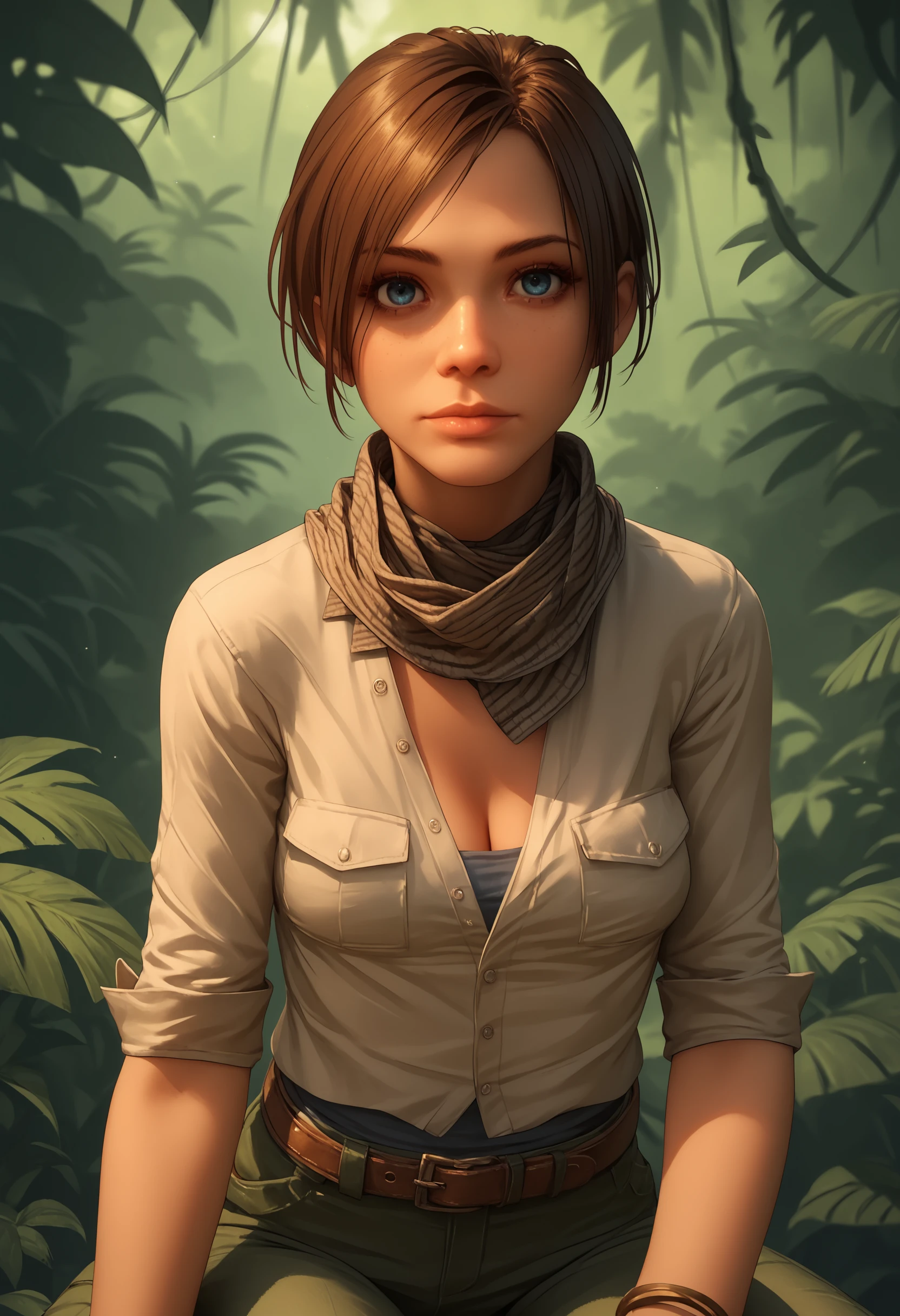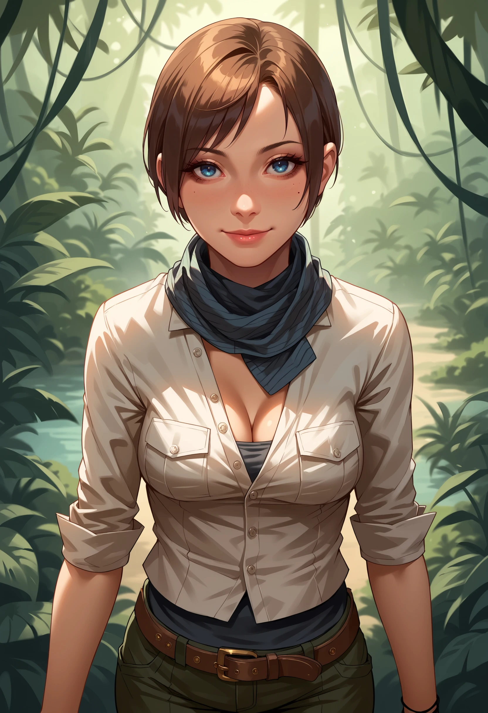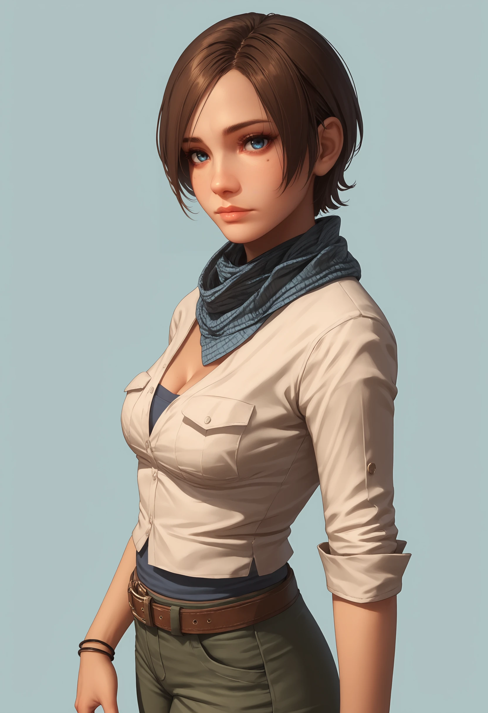 • 1girl, brown hair, short hair, blue eyes, pants, belt, scarf, shirt, cleavage, breasts, jewelry, bracelet