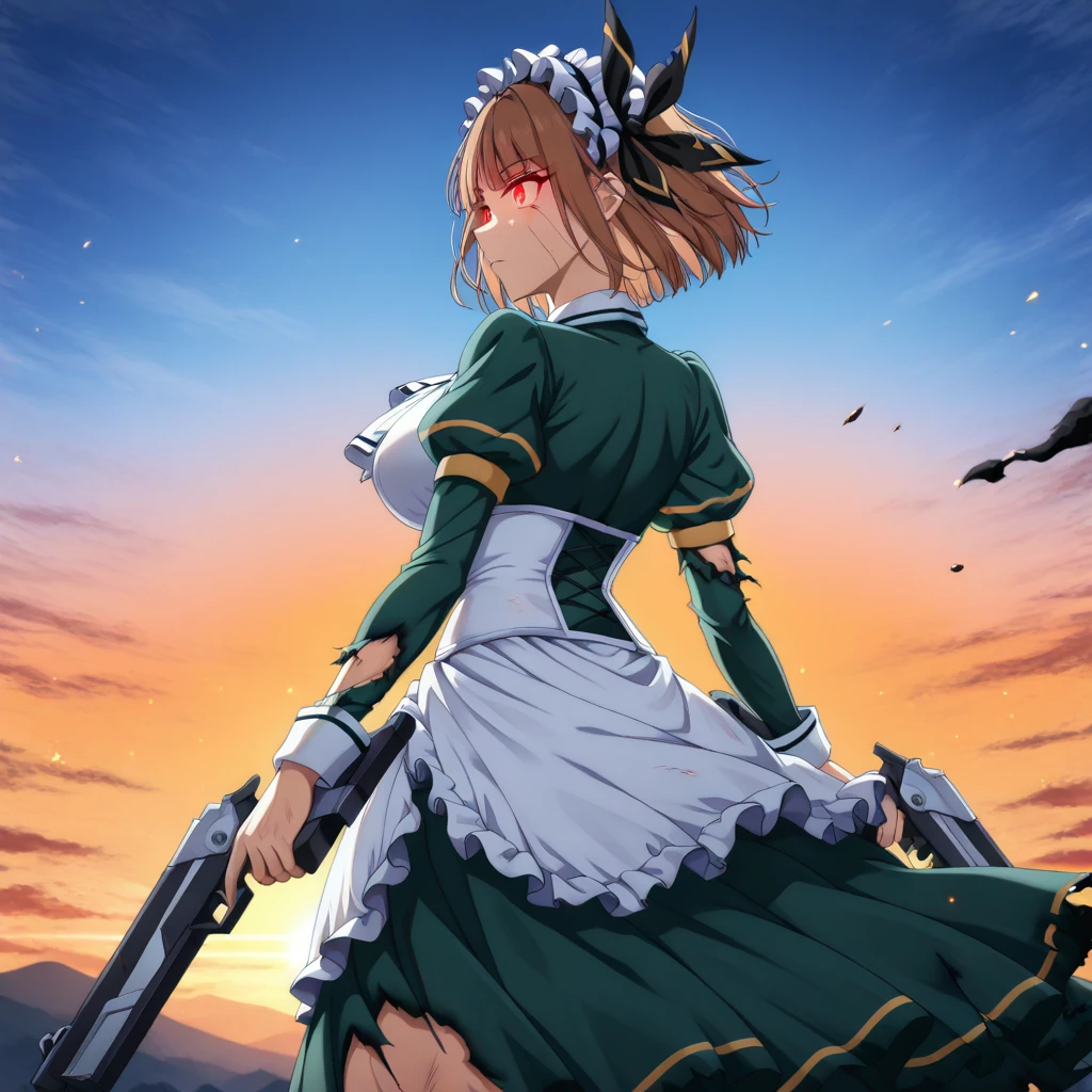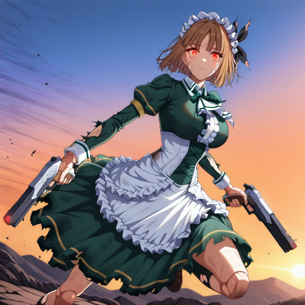 Damaged: (damaged, torn maid outfit, long sleeves, frills, brown shoes, glowing red eyes, dirty, cracks)
