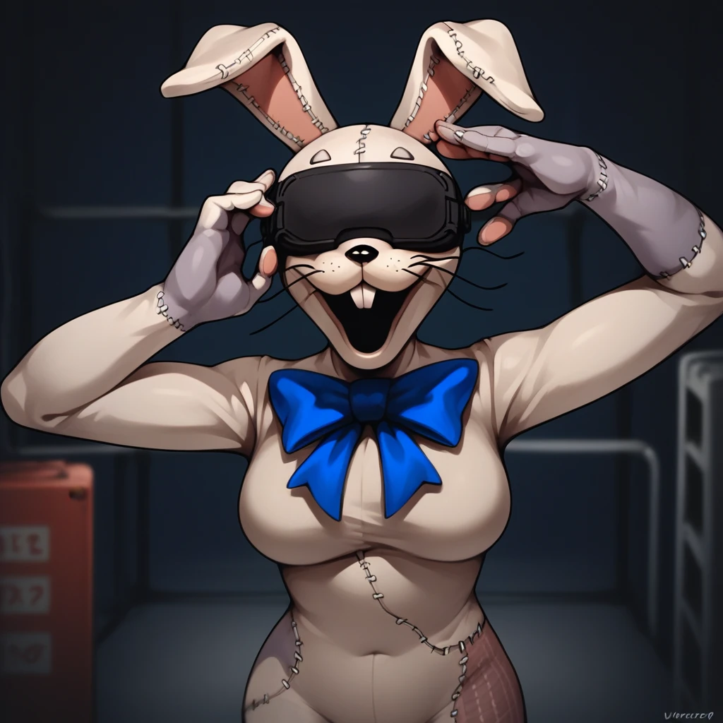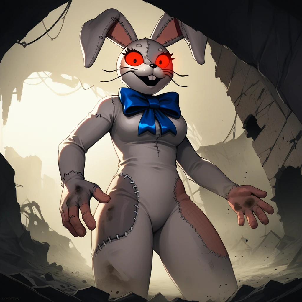 Rabbit costume, rabbit ears, red eyes, blue bow, furry, stitches