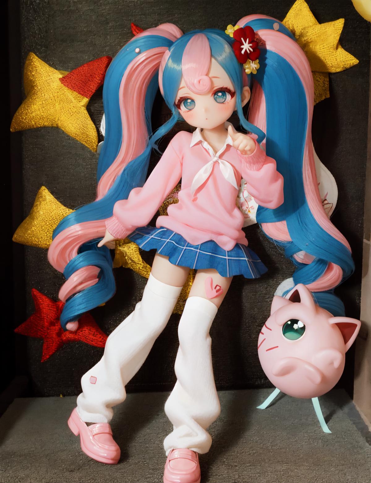 For clothes: pink sweater, multicolored hair, puffy long sleeves, striped skirt, blue skirt, leg warmer, pink footwear, ankle socks, miniskirt