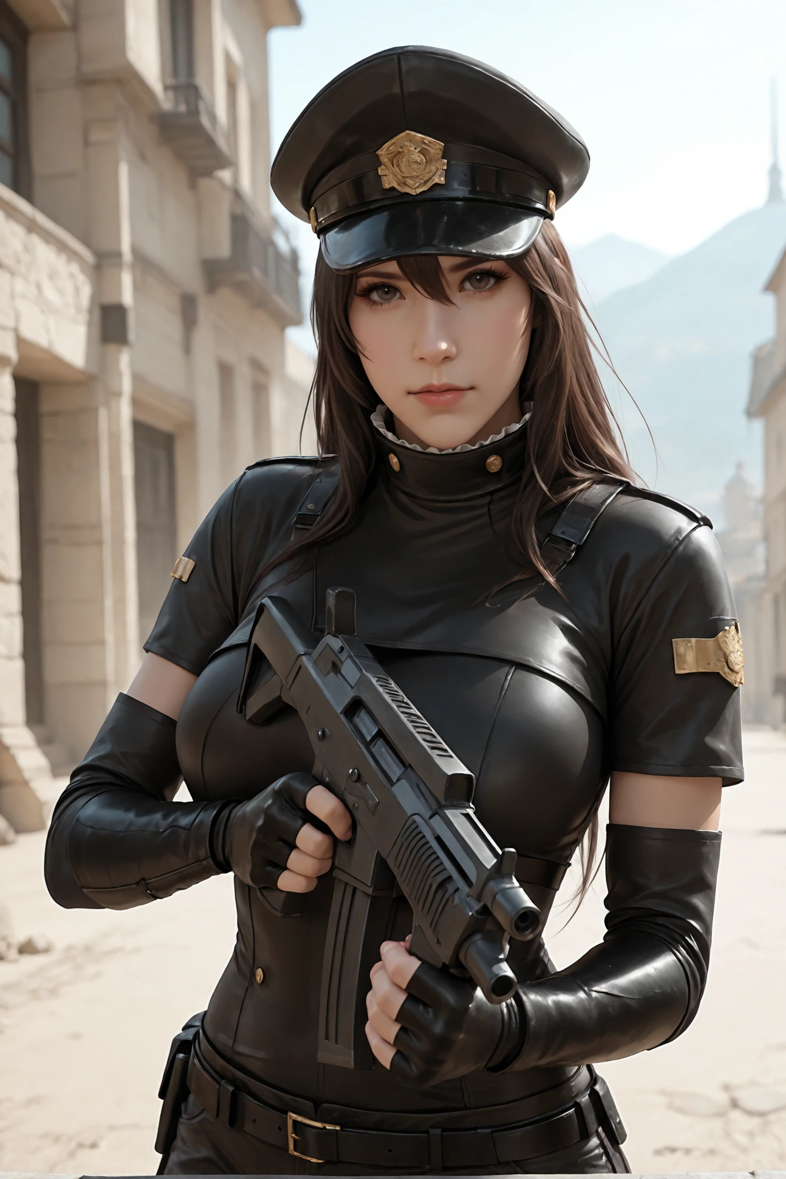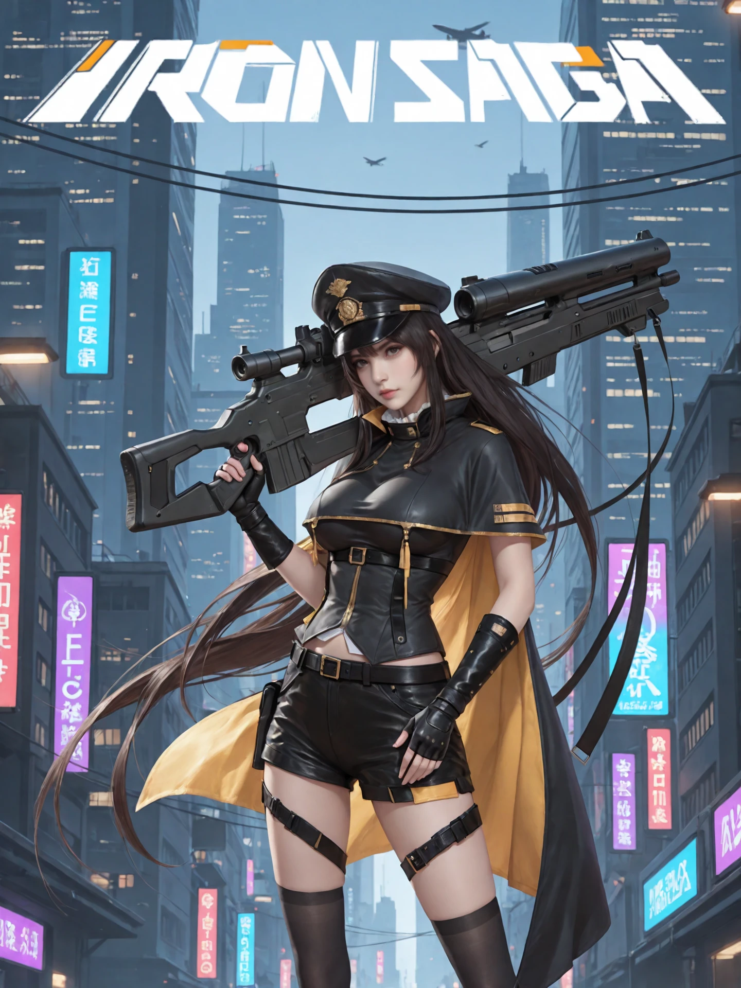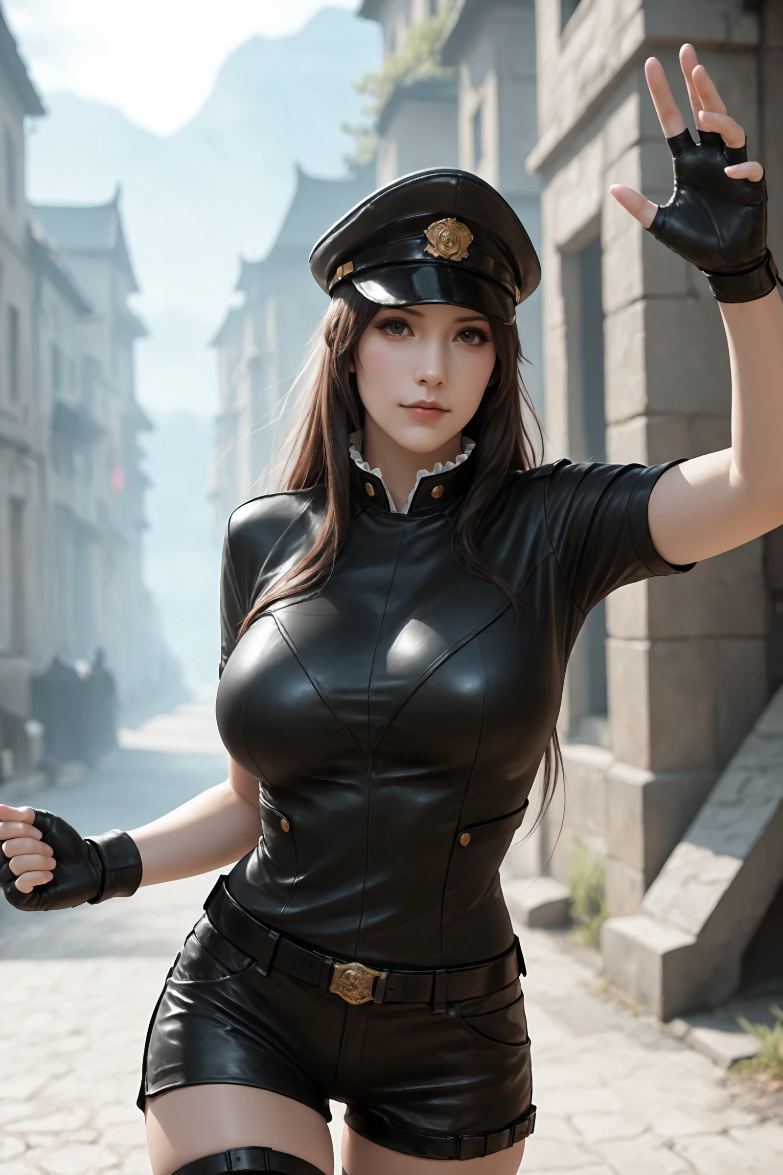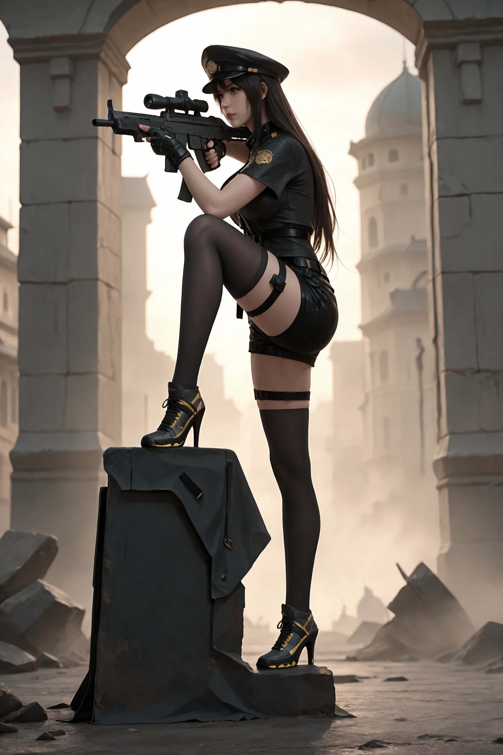long_hair,peaked_cap, large_breasts,ruffle collar, fingerless_gloves,belt,shorts,thigh_belt,black_thighhighs, sneakers,high_heels,