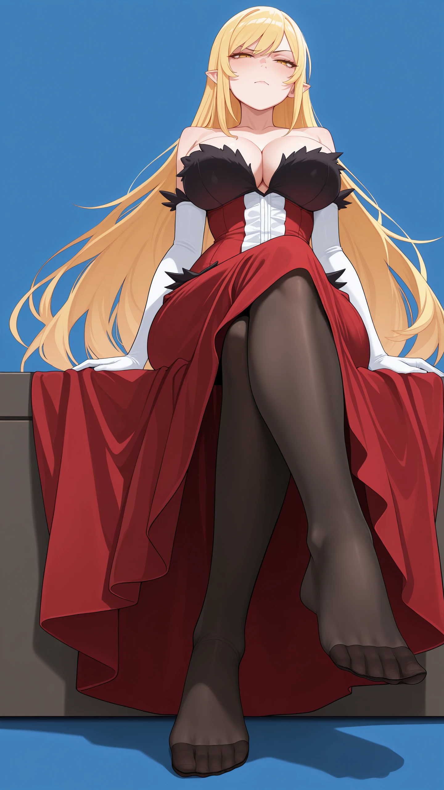 red dress, long dress, elbow gloves, white gloves, strapless dress, cleavage, black pantyhose, white footwear